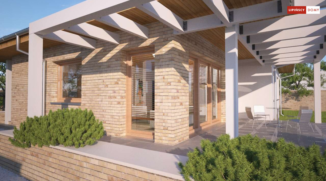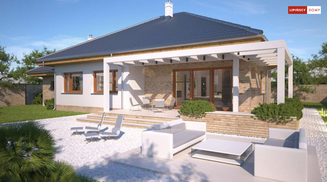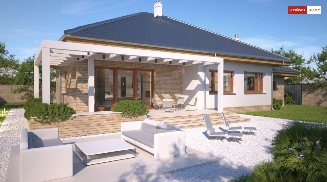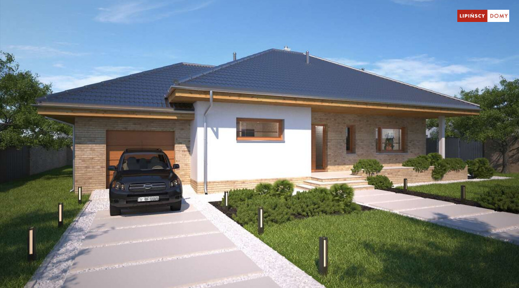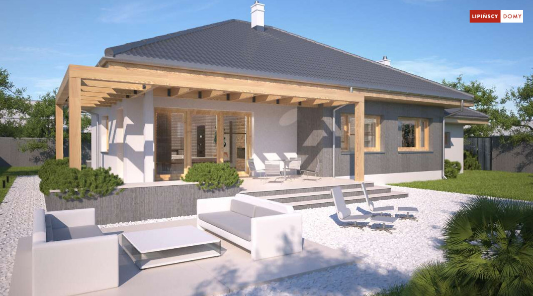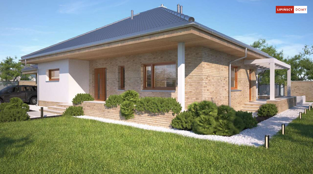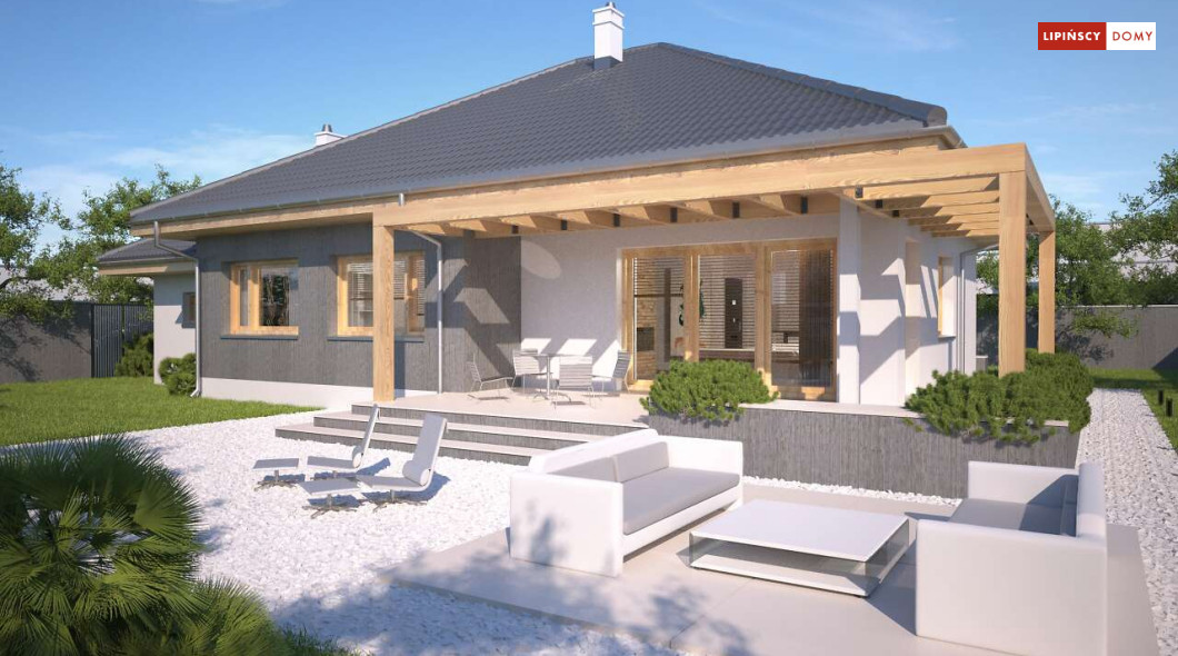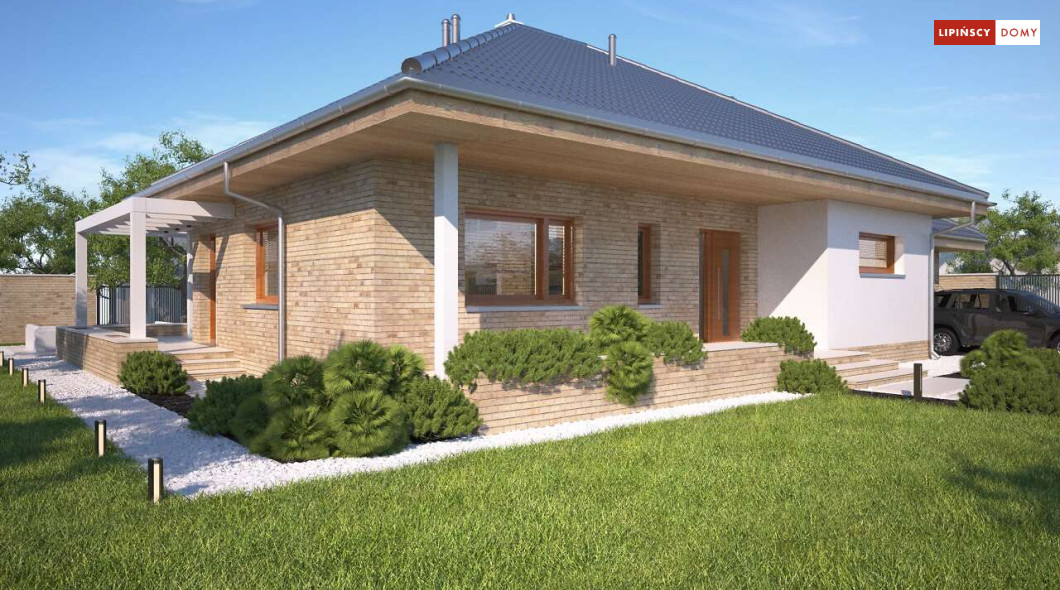 Prosty, elegancki i niewielki dom parterowy, z garażem. W projekcie przewidziano dwie ustawne sypialnie oraz obszerny salon połączony z kuchnią, w której zmieści się funkcjonalna wyspa oraz stół, doskonały do rodzinnego spożywania posiłków. Z salonu można wyjść na częściowo zadaszony taras, który dzięki dużym oknom, wydaje się niemal na wyciągnięcie ręki. Dużym atutem tego wygodnego domu jest duża, doświetlona naturalnym światłem łazienka, którą – dzięki sporym rozmiarom – można bardzo ciekawie zaaranżować.