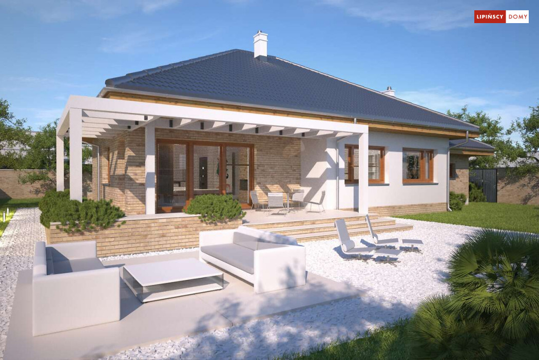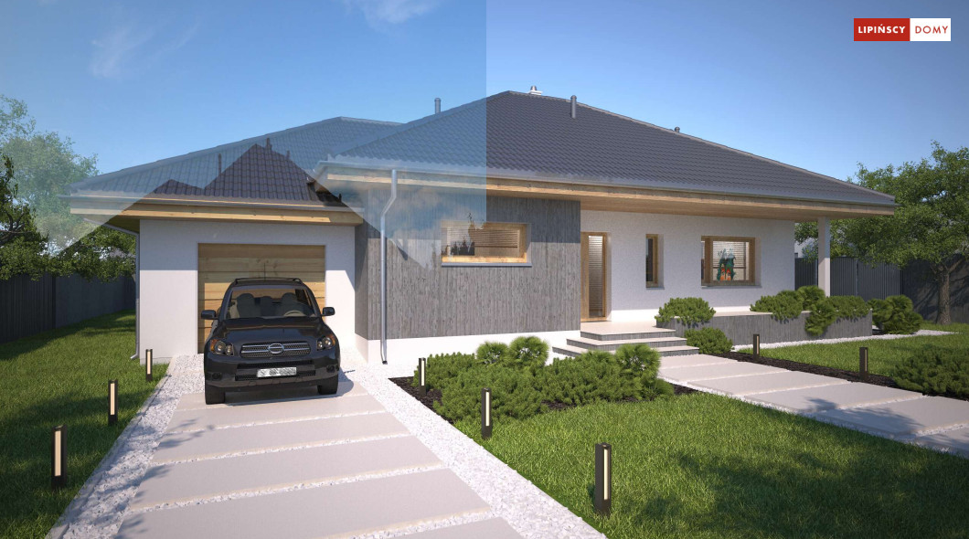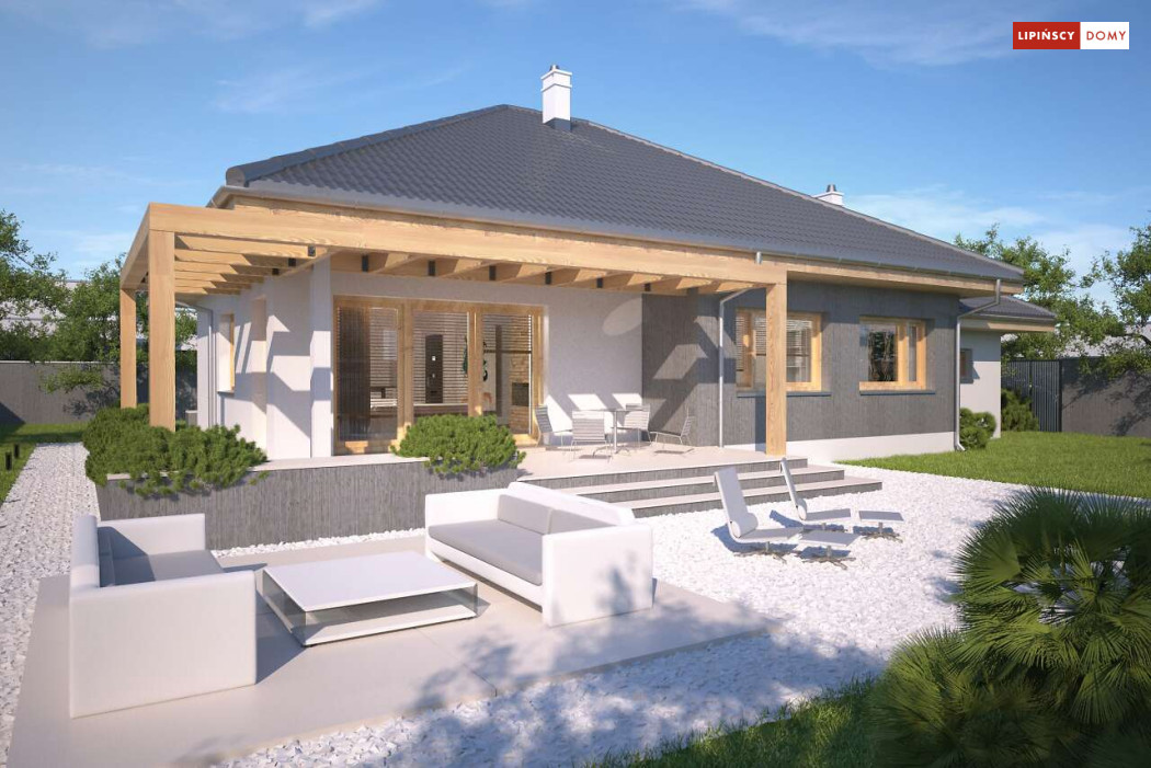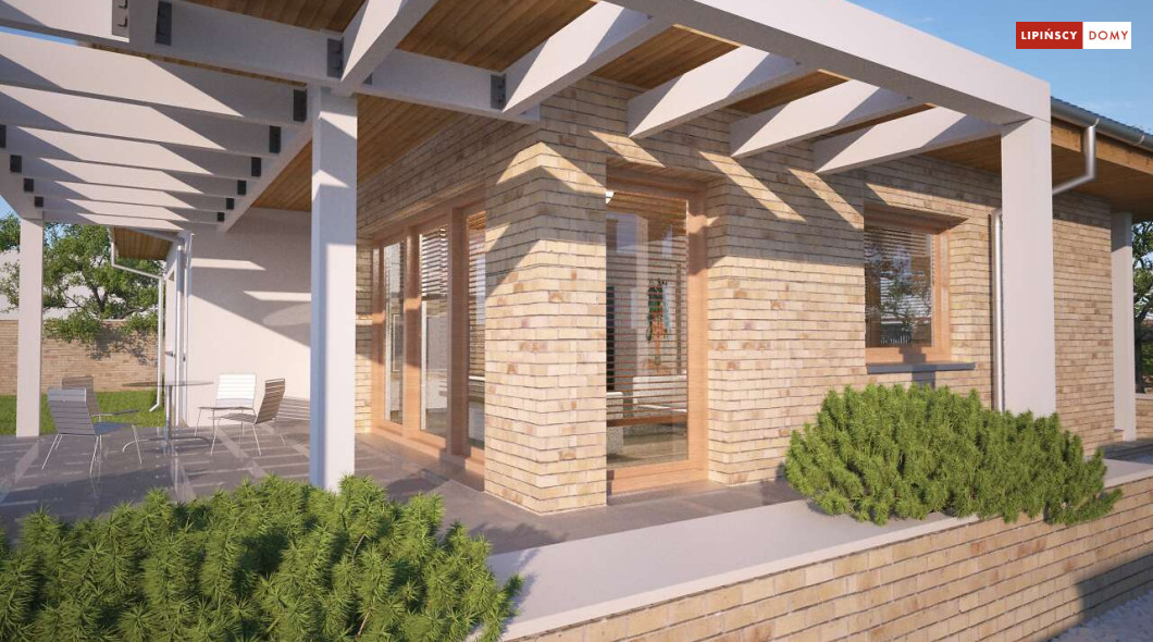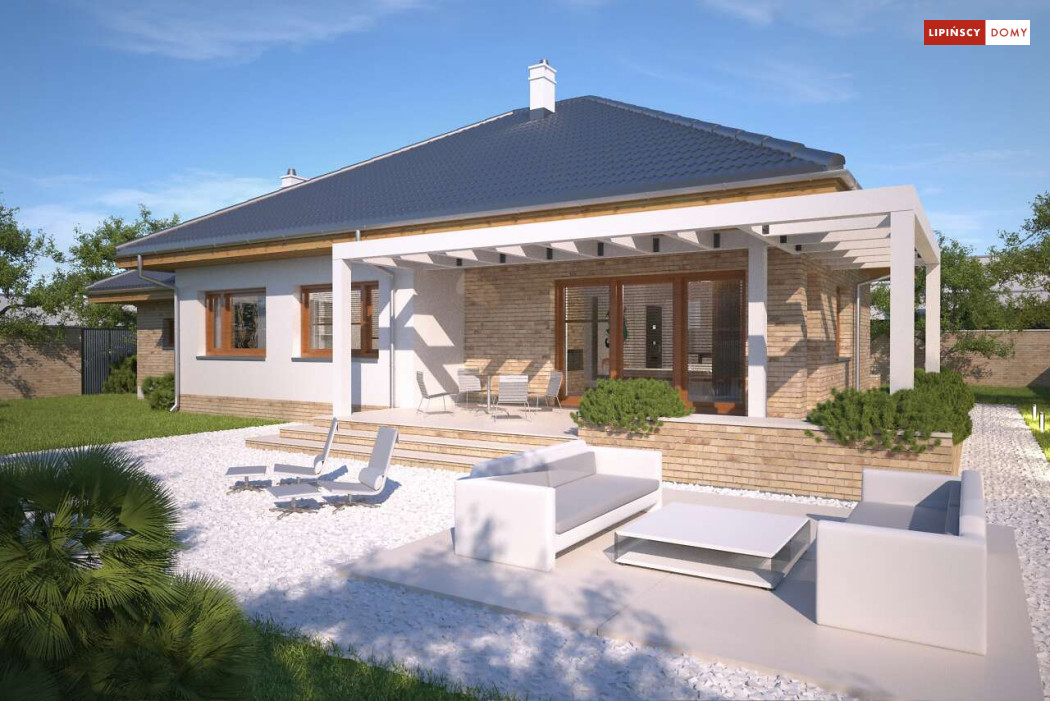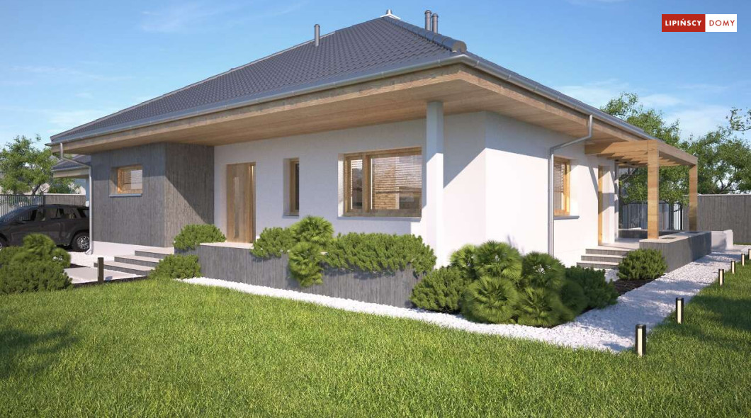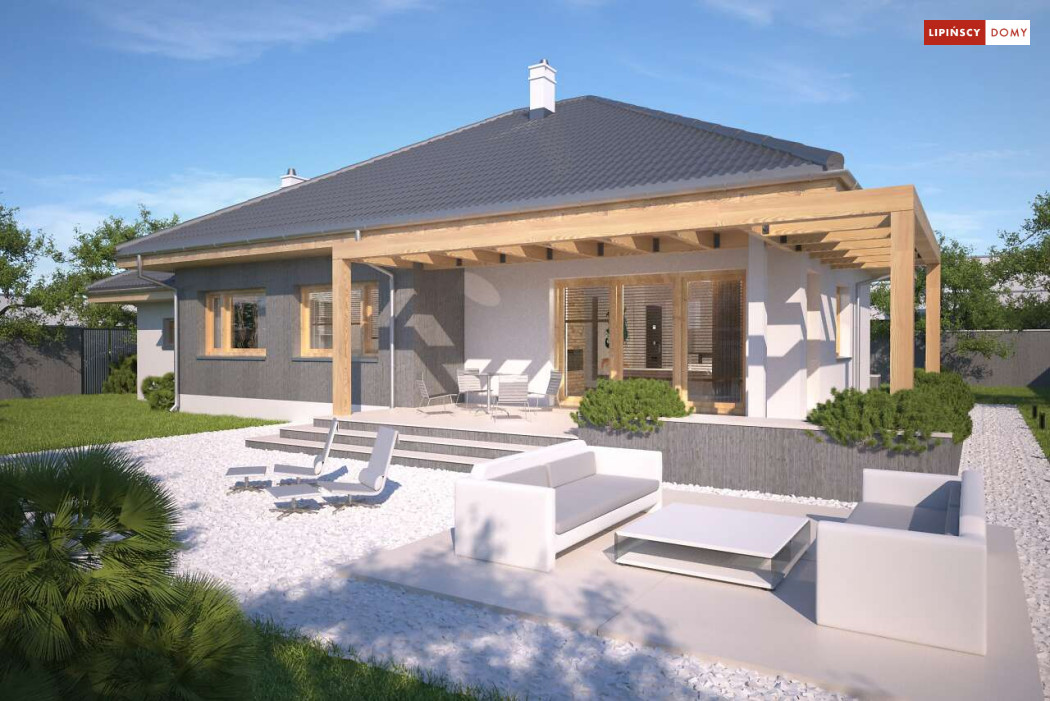 Prosty, elegancki i niewielki dom parterowy, z garażem. W projekcie przewidziano dwie ustawne sypialnie oraz obszerny salon połączony z kuchnią, w której zmieści się funkcjonalna wyspa oraz stół, doskonały do rodzinnego spożywania posiłków. Z salonu można wyjść na częściowo zadaszony taras, który dzięki dużym oknom, wydaje się niemal na wyciągnięcie ręki. Dużym atutem tego wygodnego domu jest duża, doświetlona naturalnym światłem łazienka, którą – dzięki sporym rozmiarom – można bardzo ciekawie zaaranżować.