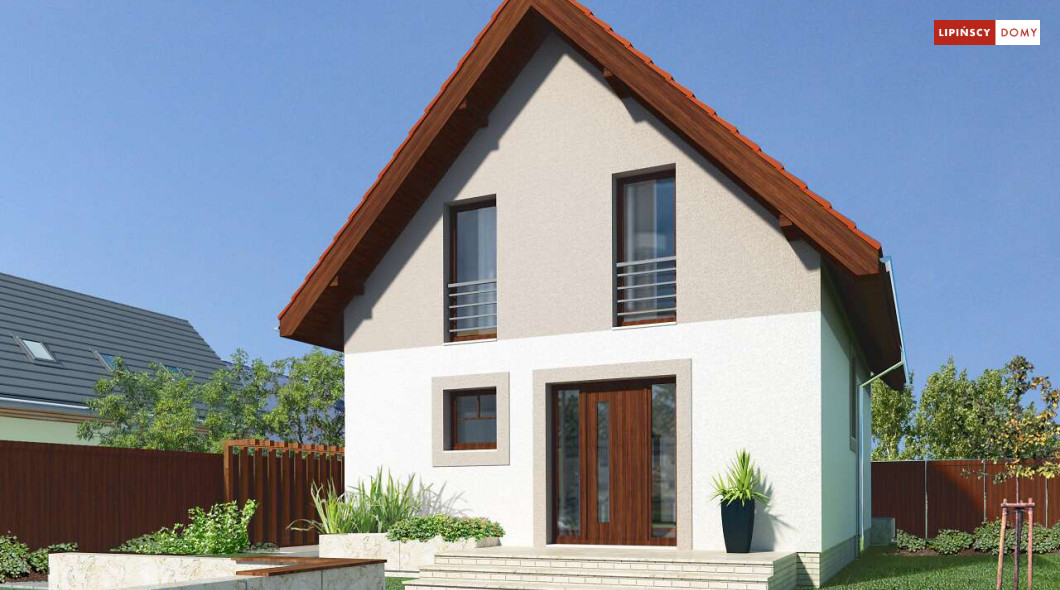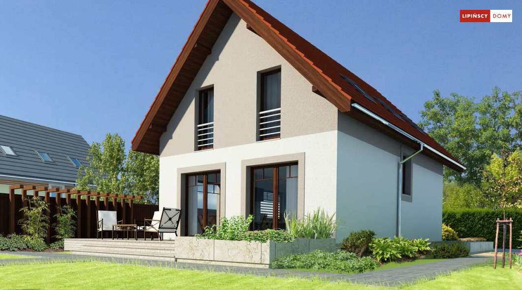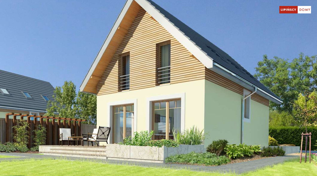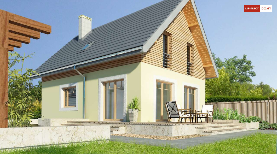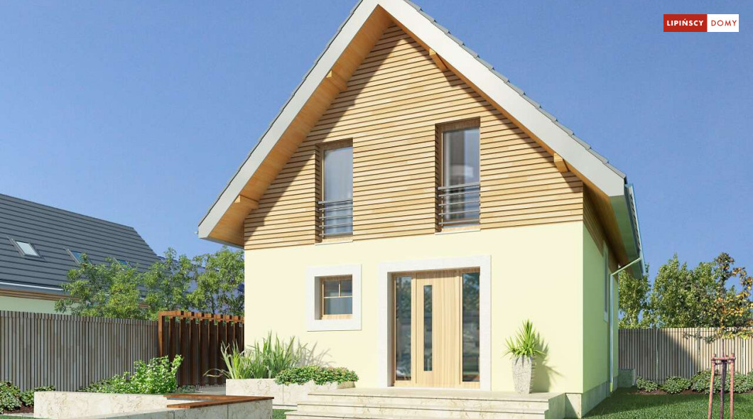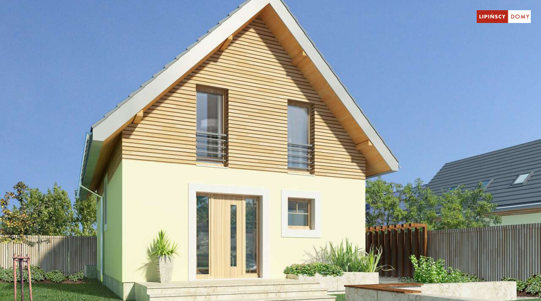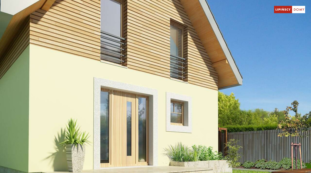 Prosty dom z użytkowym poddaszem, z wejściem szczytowym, o prostej, proporcjonalnej bryle, przekrytej dwuspadowym dachem. Dzięki temu budynek jest łatwy i niedrogi w budowie. Drewniane i metalowe elementy elewacji nadają bryle lekkości i nowoczesności. Mieszkańcy maja do dyspozycji na parterze salon, otwartą na niego kuchnię, toaletę i pomieszczenie gospodarcze. Dużym atutem tego projektu jest na pewno wygodny wiatrołap. Na poddaszu przewidziano dwa wygodne pokoje, w tym jeden z osobną garderobą i dużą, wspólną łazienkę. Projekt doskonale nadaje sie do budowy na niezbyt szerokiej działce.