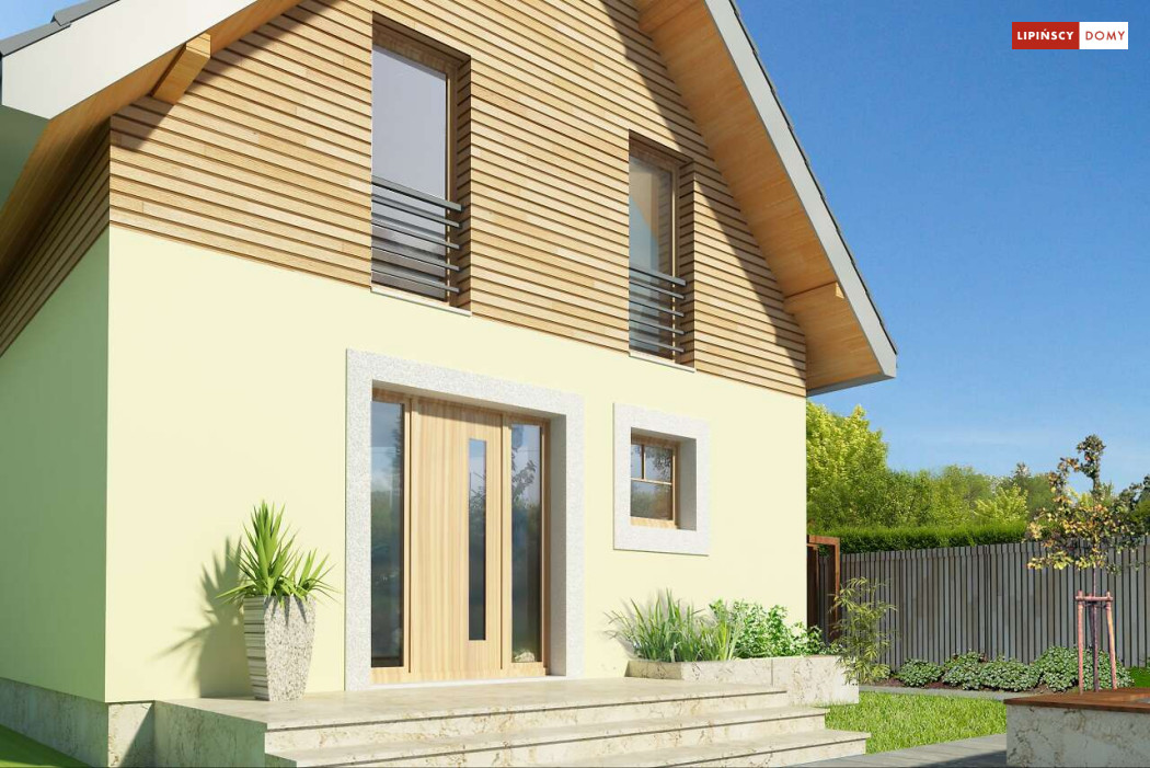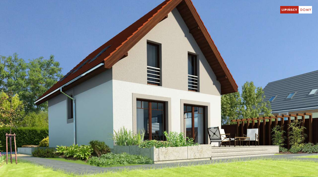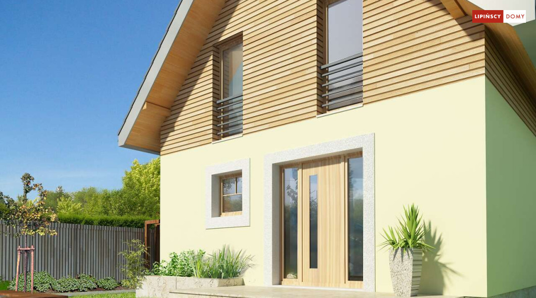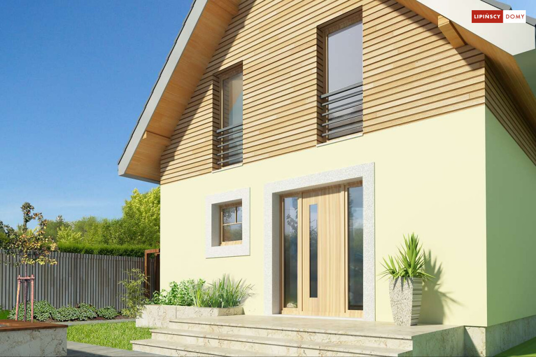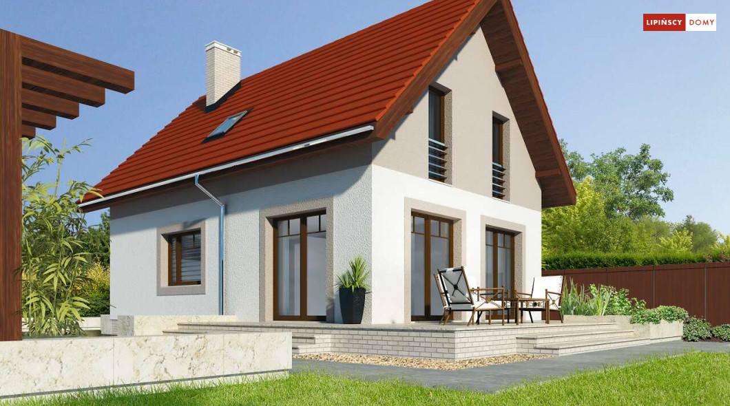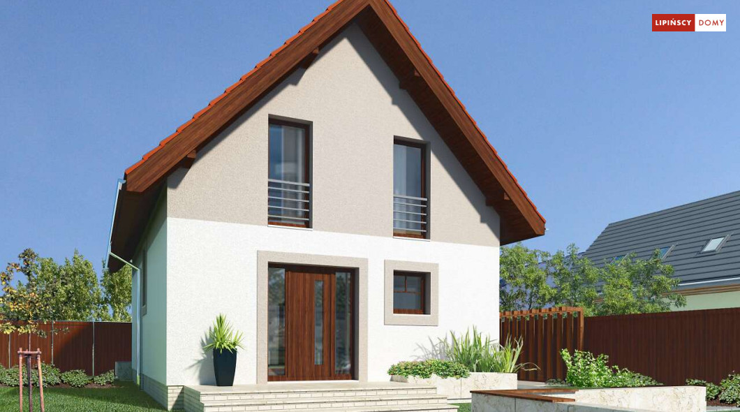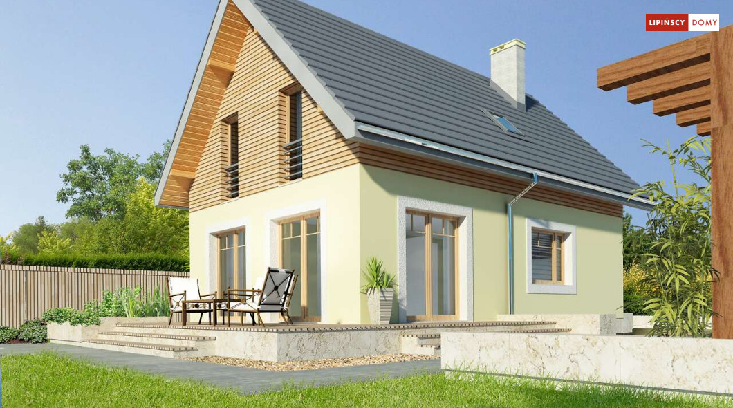 Prosty dom z użytkowym poddaszem, z wejściem szczytowym, o prostej, proporcjonalnej bryle, przekrytej dwuspadowym dachem. Dzięki temu budynek jest łatwy i niedrogi w budowie. Drewniane i metalowe elementy elewacji nadają bryle lekkości i nowoczesności. Mieszkańcy maja do dyspozycji na parterze salon, otwartą na niego kuchnię, toaletę i pomieszczenie gospodarcze. Dużym atutem tego projektu jest na pewno wygodny wiatrołap. Na poddaszu przewidziano dwa wygodne pokoje, w tym jeden z osobną garderobą i dużą, wspólną łazienkę. Projekt doskonale nadaje sie do budowy na niezbyt szerokiej działce.