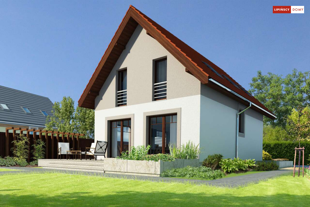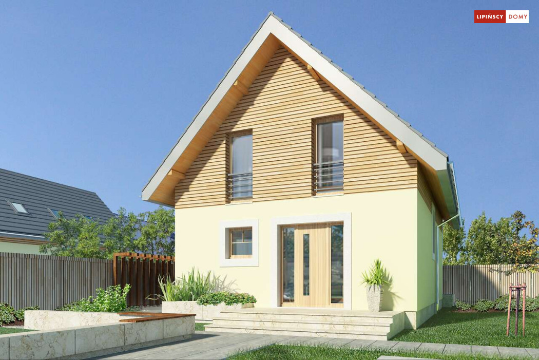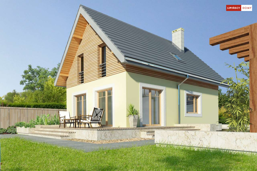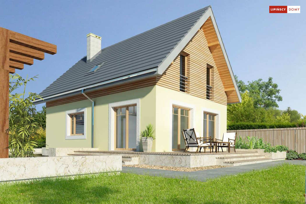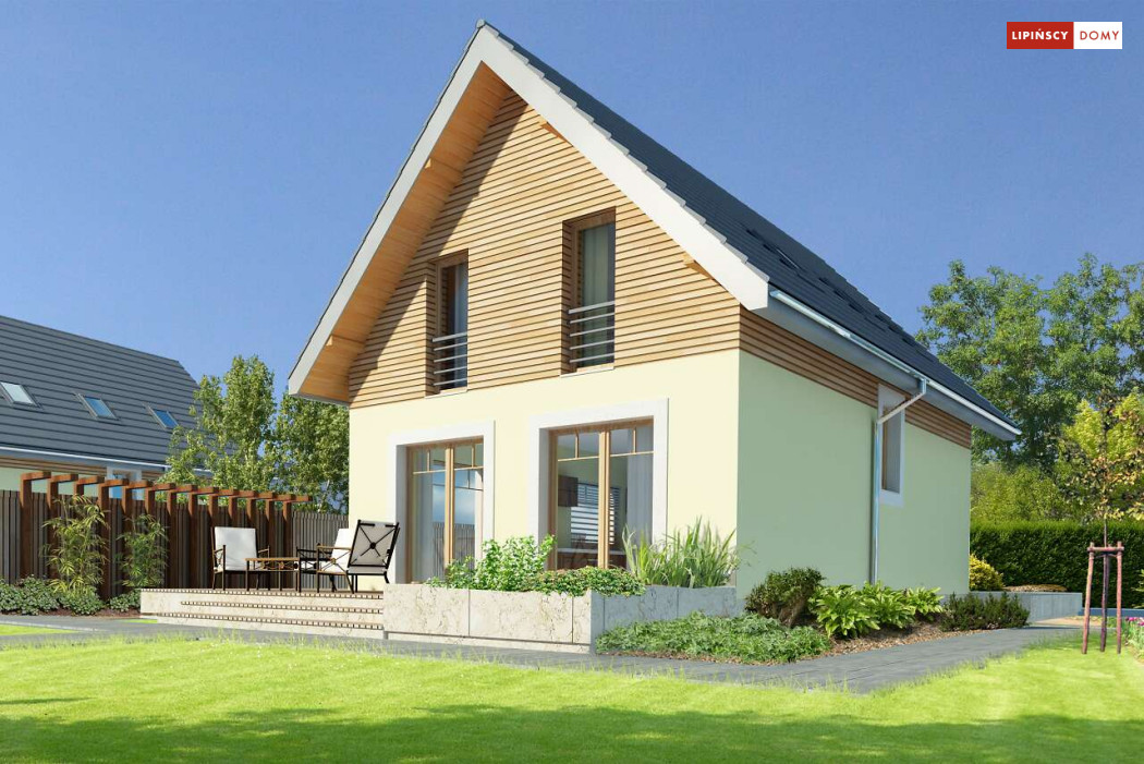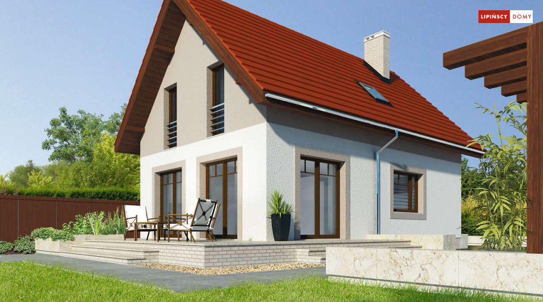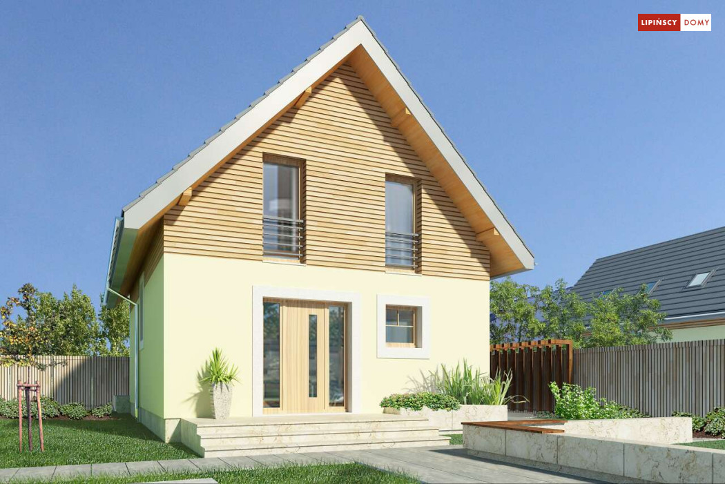 Prosty dom z użytkowym poddaszem, z wejściem szczytowym, o prostej, proporcjonalnej bryle, przekrytej dwuspadowym dachem. Dzięki temu budynek jest łatwy i niedrogi w budowie. Drewniane i metalowe elementy elewacji nadają bryle lekkości i nowoczesności. Mieszkańcy maja do dyspozycji na parterze salon, otwartą na niego kuchnię, toaletę i pomieszczenie gospodarcze. Dużym atutem tego projektu jest na pewno wygodny wiatrołap. Na poddaszu przewidziano dwa wygodne pokoje, w tym jeden z osobną garderobą i dużą, wspólną łazienkę. Projekt doskonale nadaje sie do budowy na niezbyt szerokiej działce.