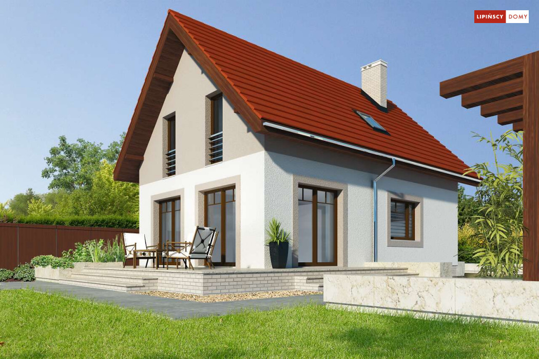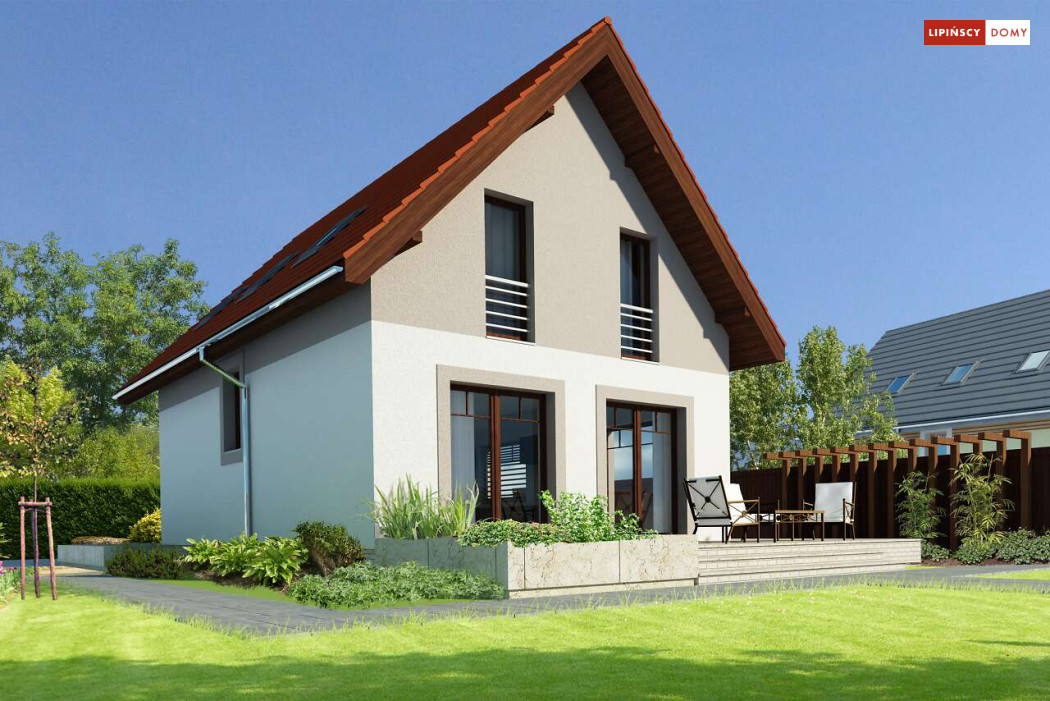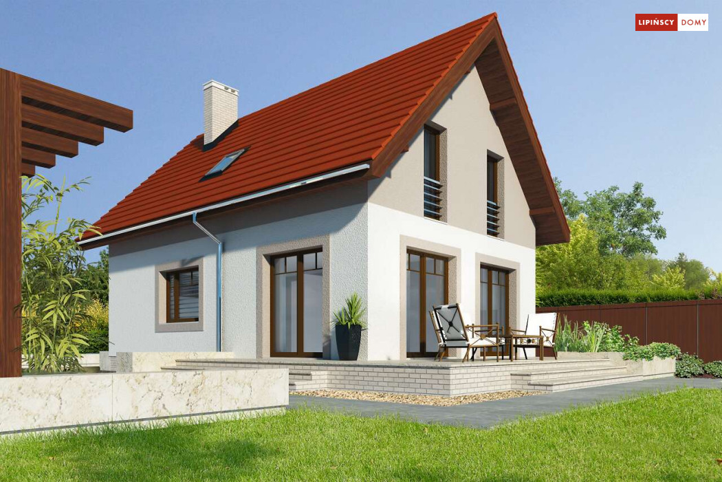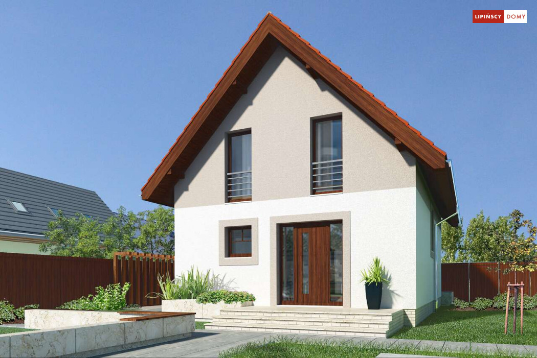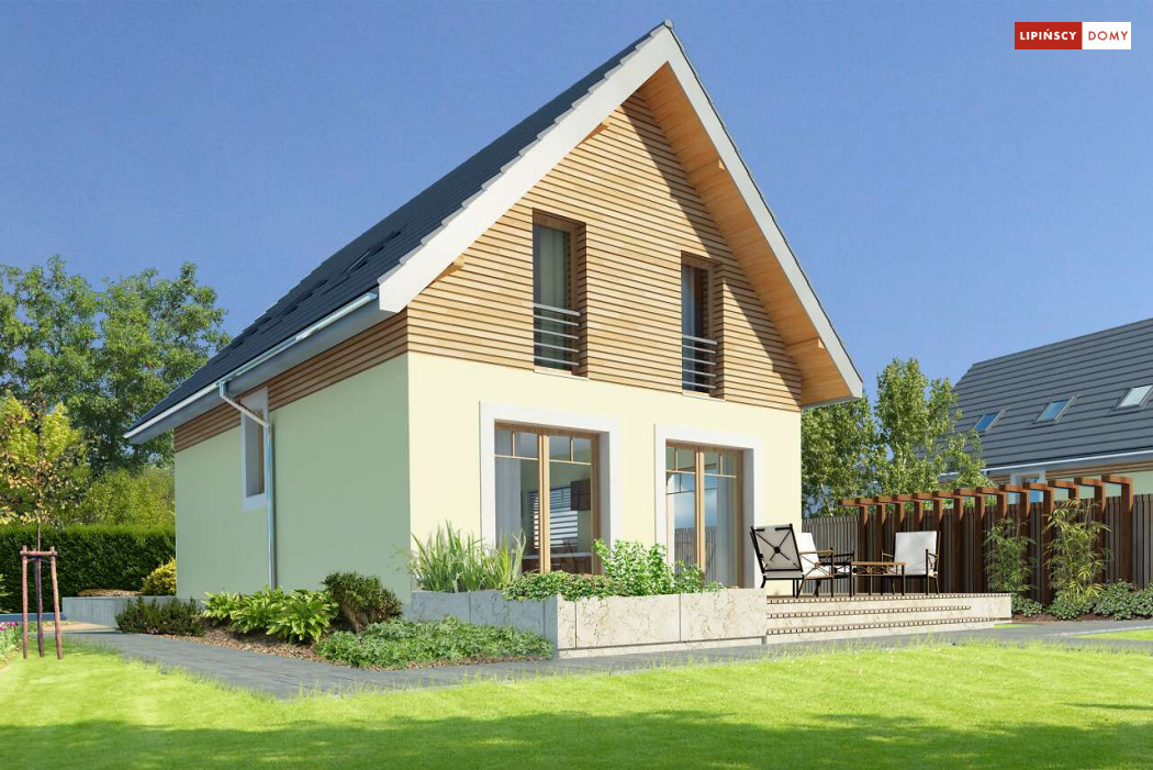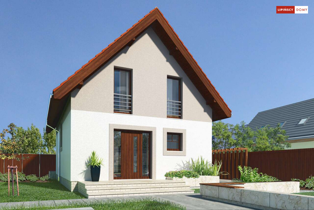 Prosty dom z użytkowym poddaszem, z wejściem szczytowym, o prostej, proporcjonalnej bryle, przekrytej dwuspadowym dachem. Dzięki temu budynek jest łatwy i niedrogi w budowie. Drewniane i metalowe elementy elewacji nadają bryle lekkości i nowoczesności. Mieszkańcy maja do dyspozycji na parterze salon, otwartą na niego kuchnię, toaletę i pomieszczenie gospodarcze. Dużym atutem tego projektu jest na pewno wygodny wiatrołap. Na poddaszu przewidziano dwa wygodne pokoje, w tym jeden z osobną garderobą i dużą, wspólną łazienkę. Projekt doskonale nadaje sie do budowy na niezbyt szerokiej działce.
