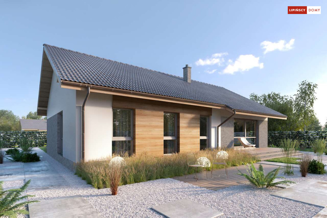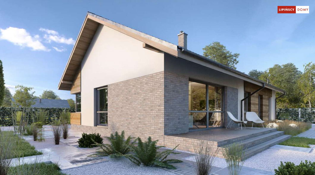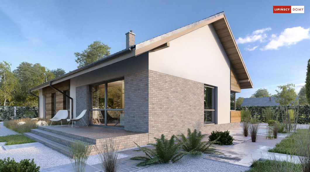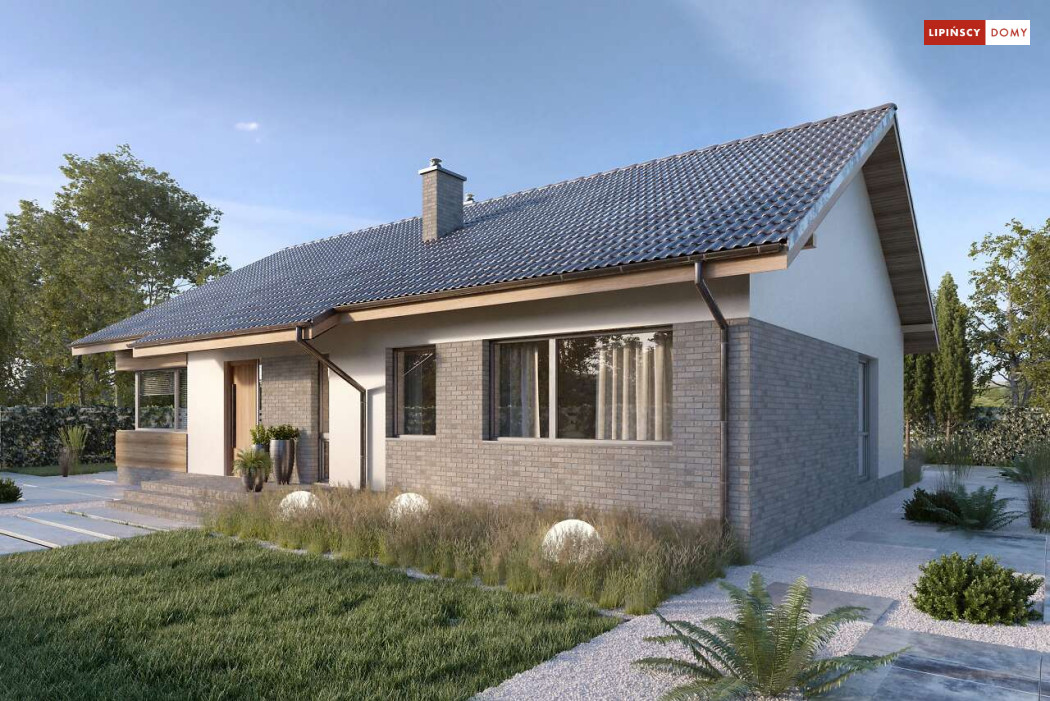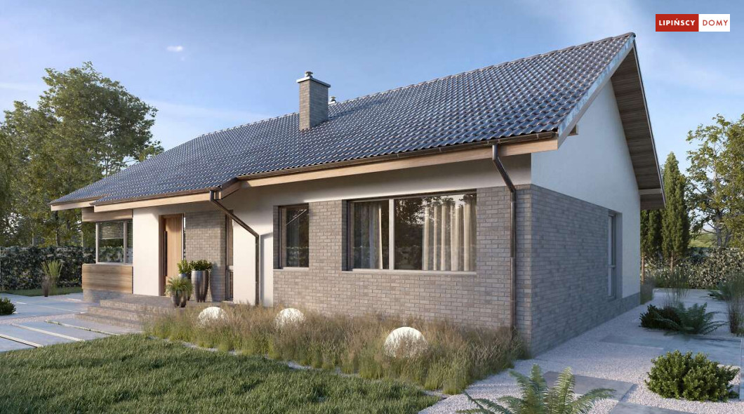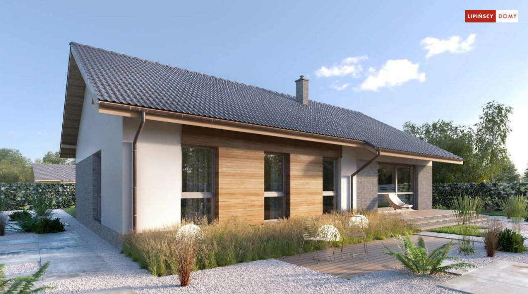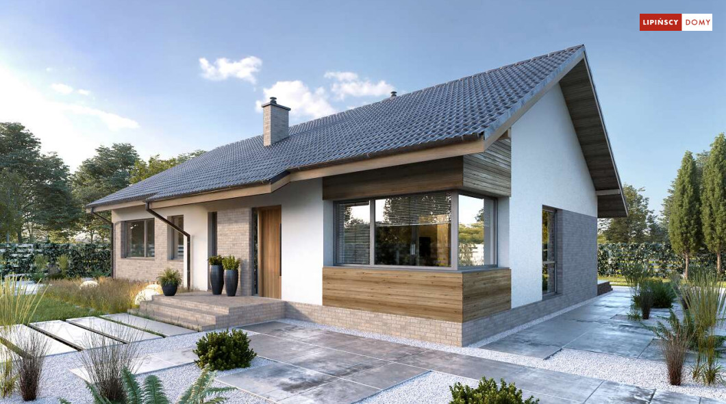 Nowoczesny, parterowy dom zaprojektowany nawet dla pięcioosobowej rodziny – posiada cztery wygodne sypialnie. Strefę dzienną stanowi przestronny, słoneczny salon z kominkiem oraz kuchnia. Jest to dom o prostej bryle, ale w nowoczesnej estetyce, która wzbogacają ciekawe rozwiązania elewacji. Prosta konstrukcja dachu powoduje, że dom jest bardzo ekonomiczny w realizacji.