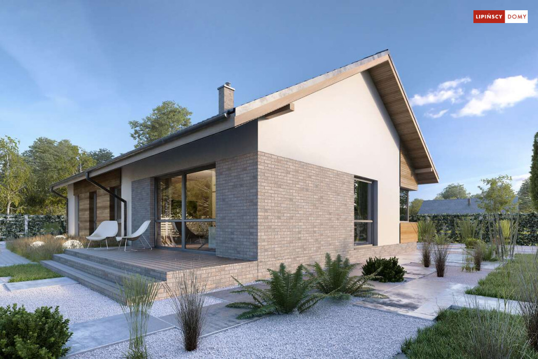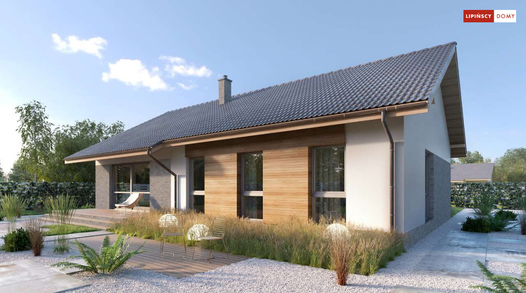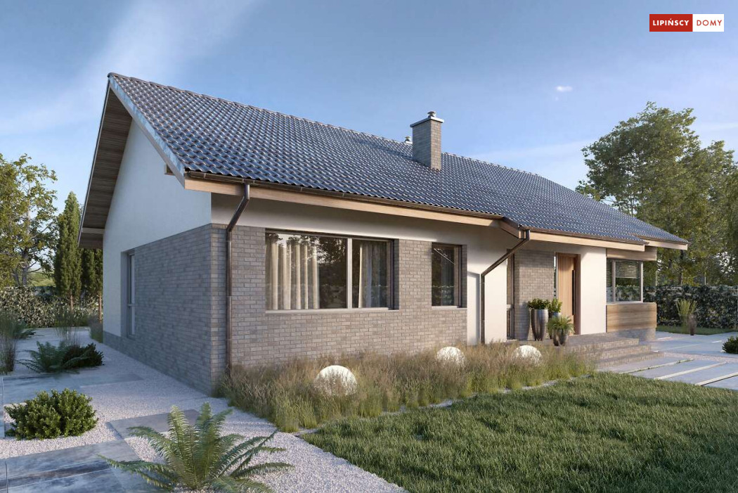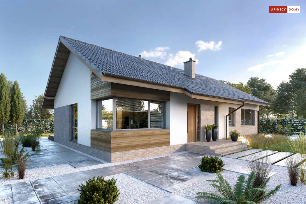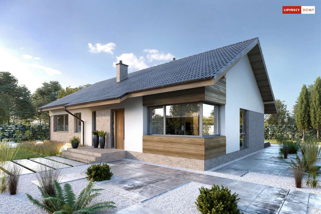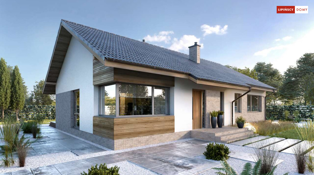 Nowoczesny, parterowy dom zaprojektowany nawet dla pięcioosobowej rodziny – posiada cztery wygodne sypialnie. Strefę dzienną stanowi przestronny, słoneczny salon z kominkiem oraz kuchnia. Jest to dom o prostej bryle, ale w nowoczesnej estetyce, która wzbogacają ciekawe rozwiązania elewacji. Prosta konstrukcja dachu powoduje, że dom jest bardzo ekonomiczny w realizacji.