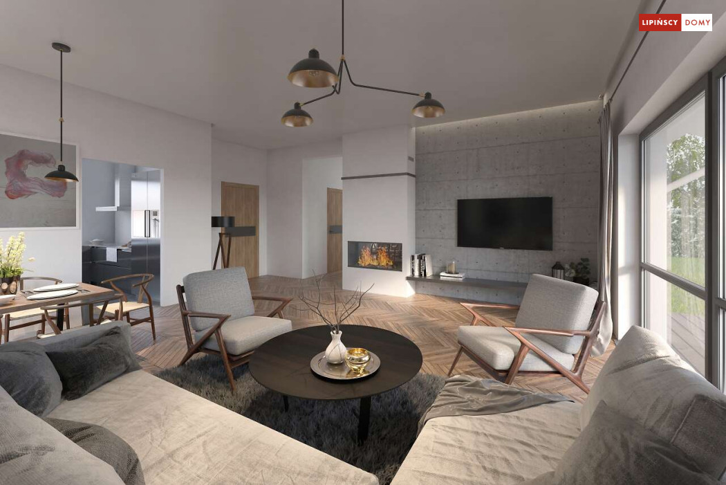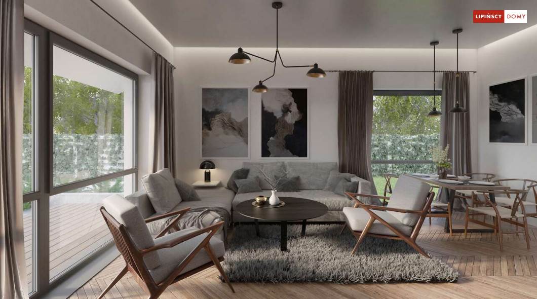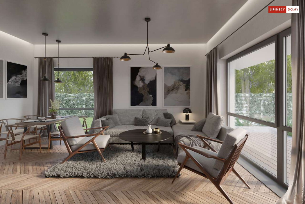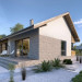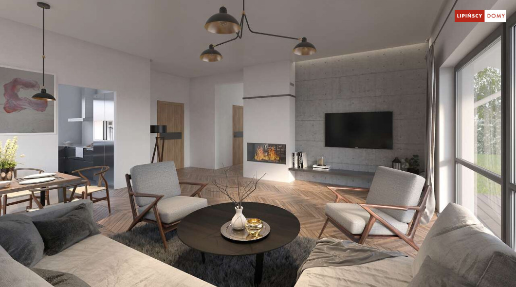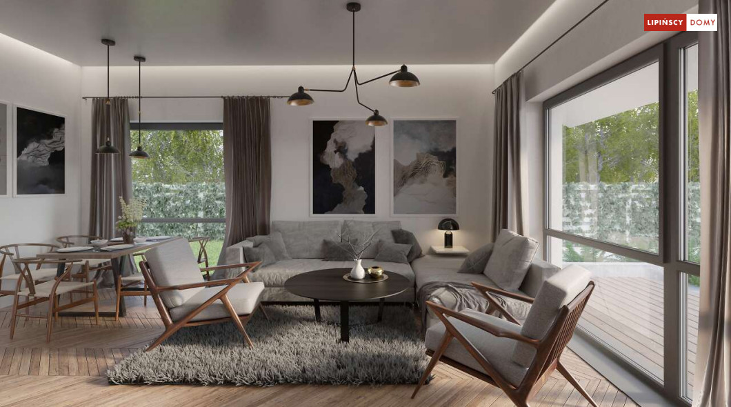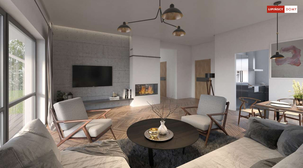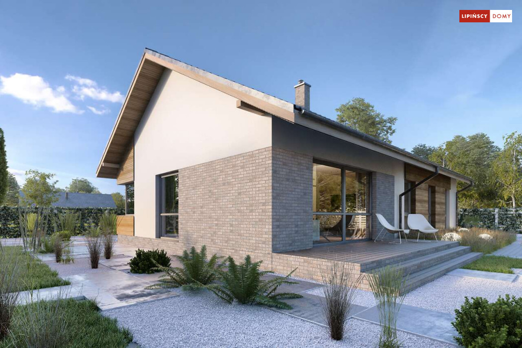 Nowoczesny, parterowy dom zaprojektowany nawet dla pięcioosobowej rodziny – posiada cztery wygodne sypialnie. Strefę dzienną stanowi przestronny, słoneczny salon z kominkiem oraz kuchnia. Jest to dom o prostej bryle, ale w nowoczesnej estetyce, która wzbogacają ciekawe rozwiązania elewacji. Prosta konstrukcja dachu powoduje, że dom jest bardzo ekonomiczny w realizacji.