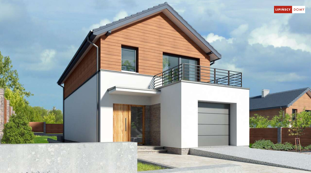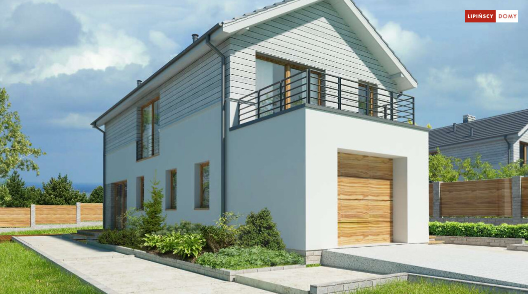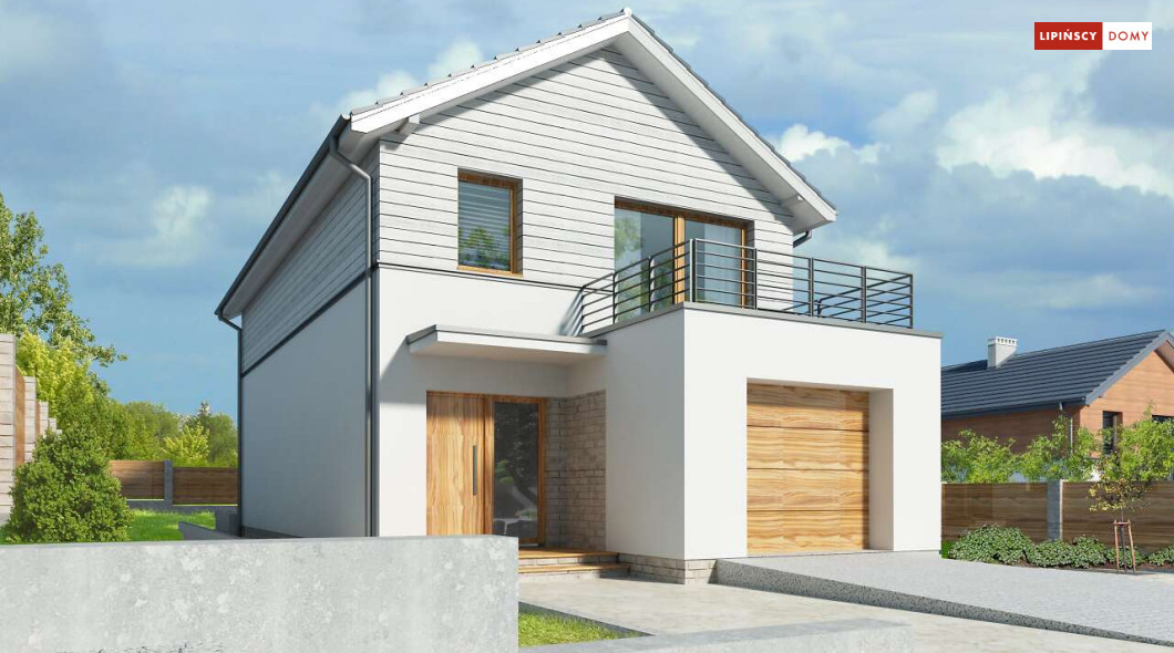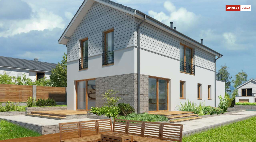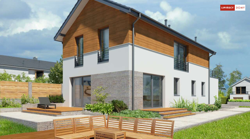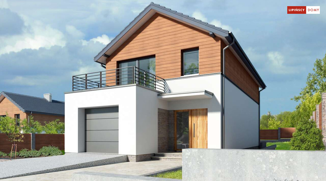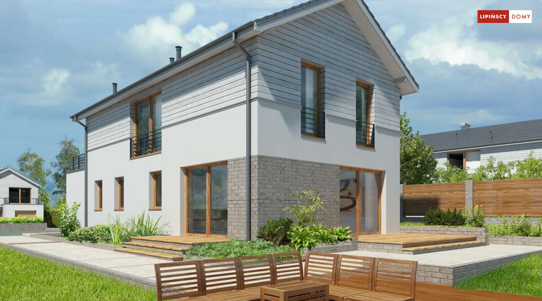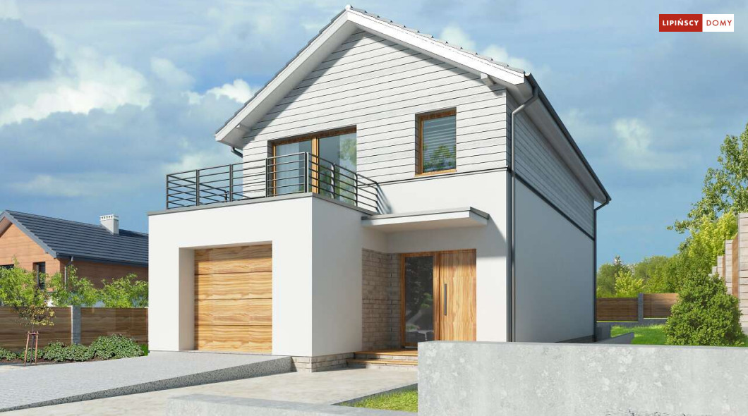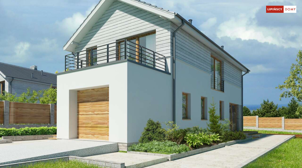 Dom piętrowy dla czteroosobowej rodziny, który będzie pasował nawet na bardzo wąską działkę. W przypadku realizacji na wąskiej działce ściana bez okien może zostać przesunięta nawet na 1,5m od granicy działki (jeżeli miejscowy plan zagospodarowania przestrzennego albo decyzja o warunkach zabudowy nie stanowi inaczej.). Wjazd i wejście jest od ściany szczytowej. Na parterze zaprojektowano przestronną strefę dzienną – salon z miejscem na rodzinny stół i kuchnię ze spiżarnią. Na piętrze znajdują się duża sypialnia z tarasem, dwie mniejsze sypialnie, jasna łazienka oraz miejsce do pracy przy komputerze.