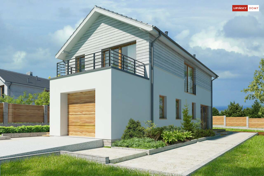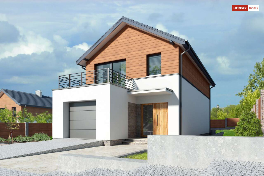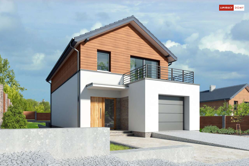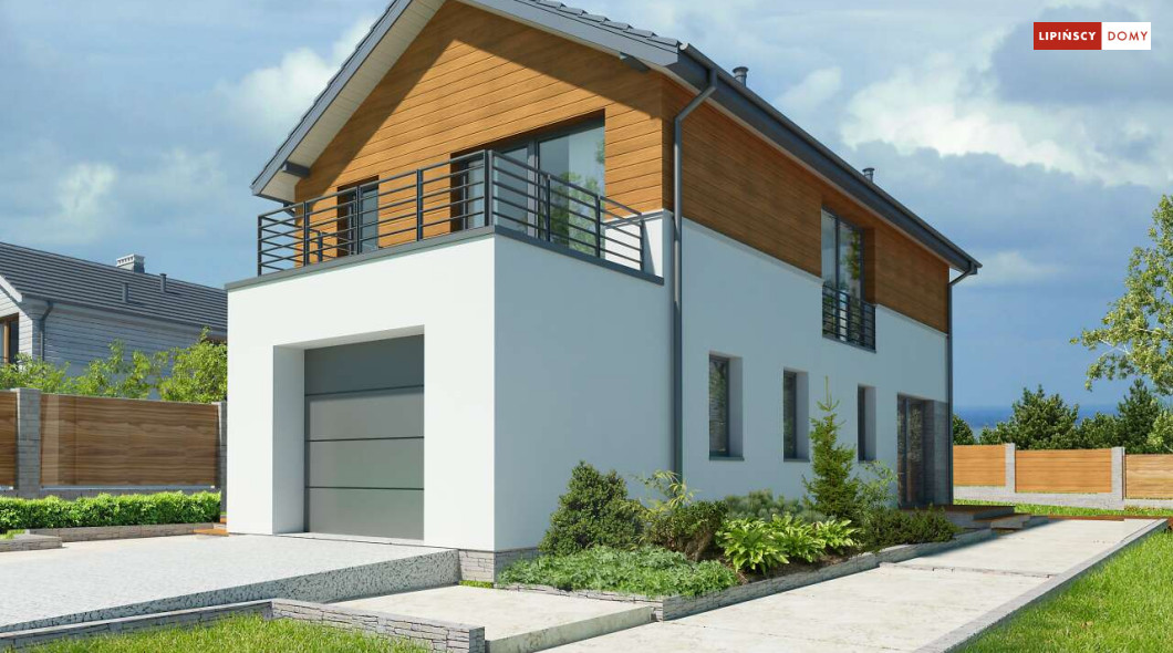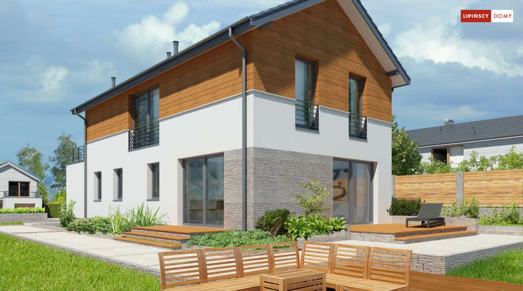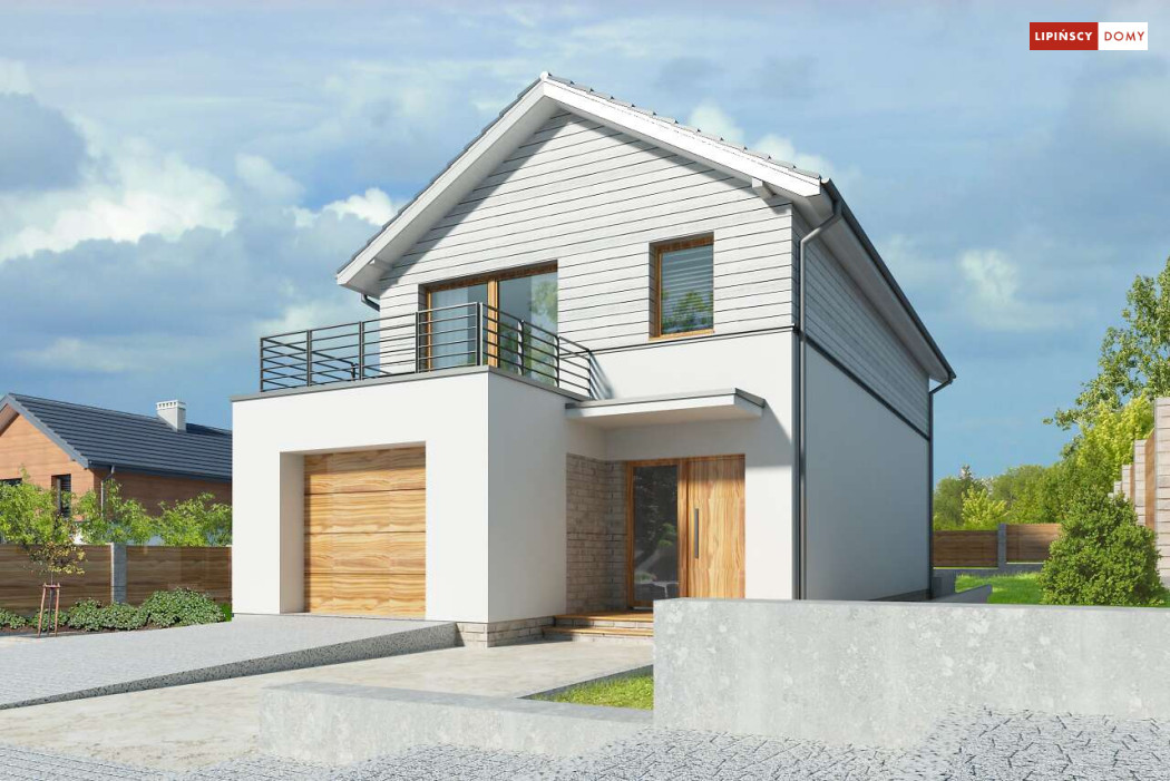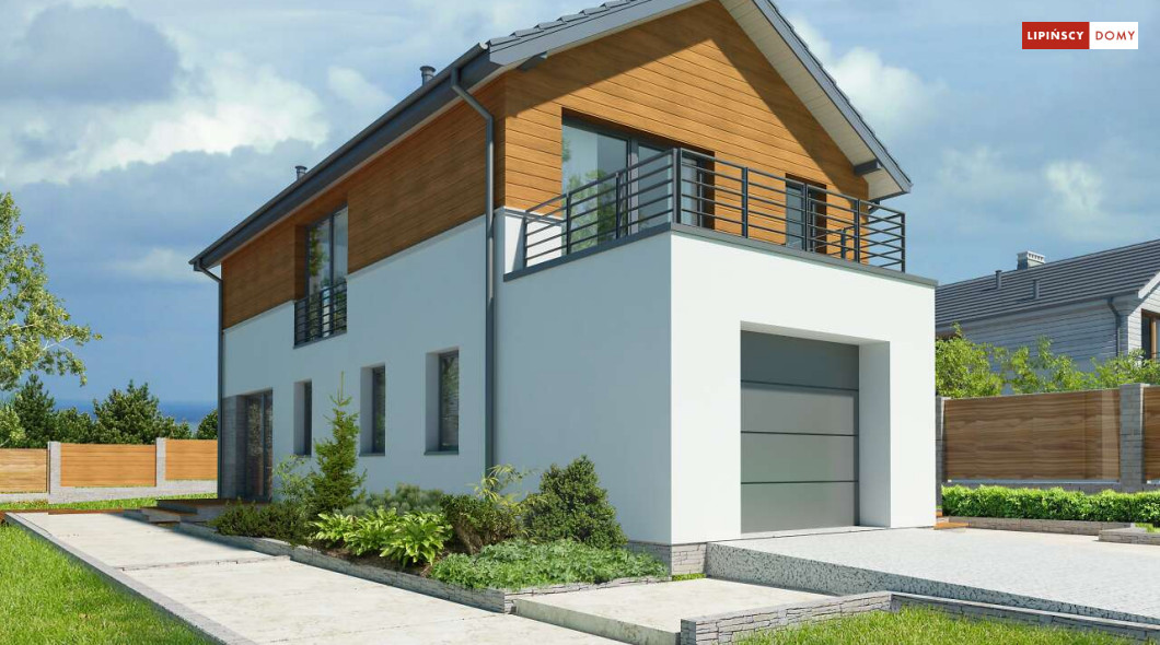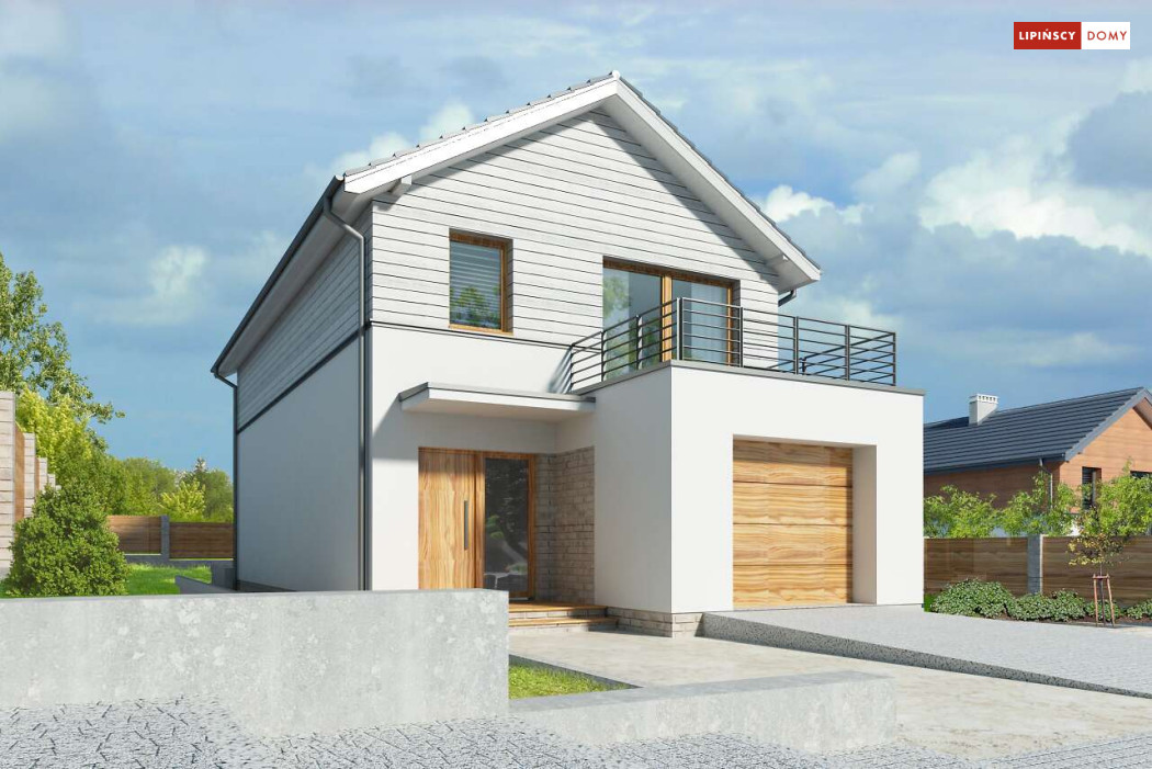 Dom piętrowy dla czteroosobowej rodziny, który będzie pasował nawet na bardzo wąską działkę. W przypadku realizacji na wąskiej działce ściana bez okien może zostać przesunięta nawet na 1,5m od granicy działki (jeżeli miejscowy plan zagospodarowania przestrzennego albo decyzja o warunkach zabudowy nie stanowi inaczej.). Wjazd i wejście jest od ściany szczytowej. Na parterze zaprojektowano przestronną strefę dzienną – salon z miejscem na rodzinny stół i kuchnię ze spiżarnią. Na piętrze znajdują się duża sypialnia z tarasem, dwie mniejsze sypialnie, jasna łazienka oraz miejsce do pracy przy komputerze.