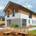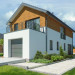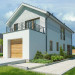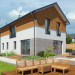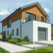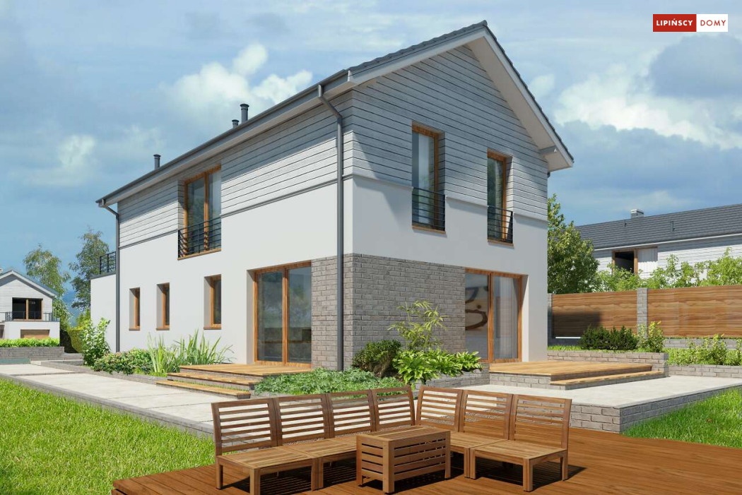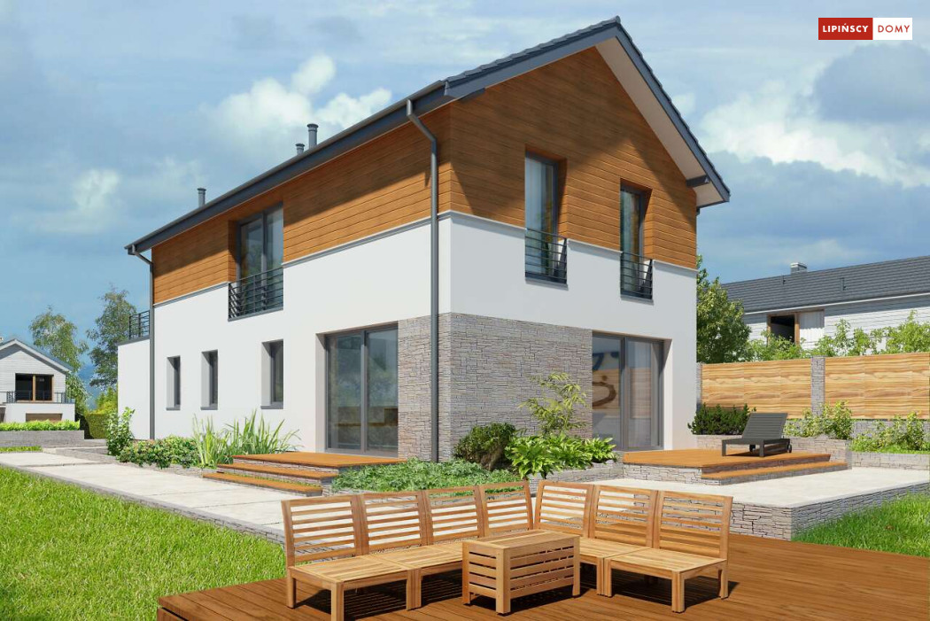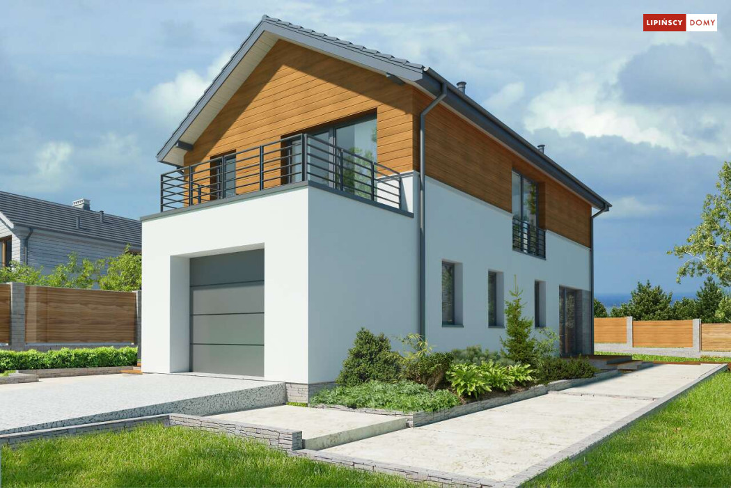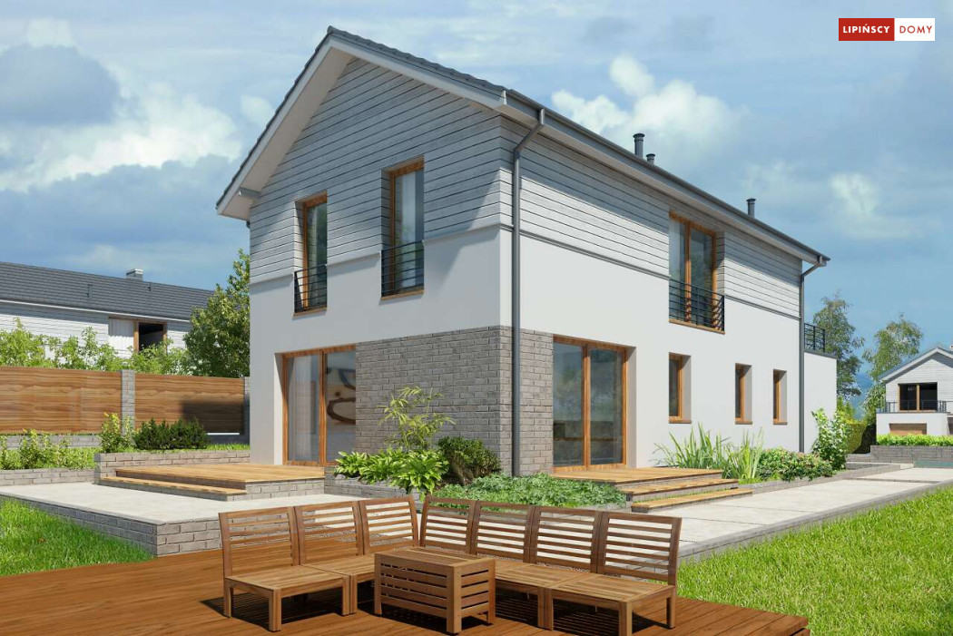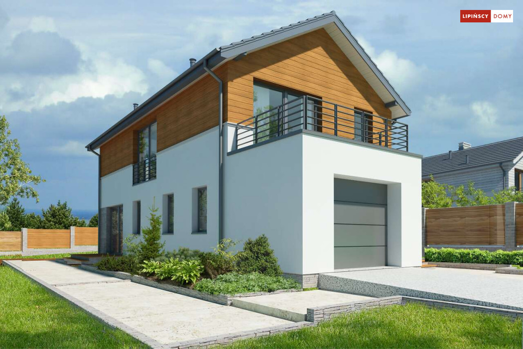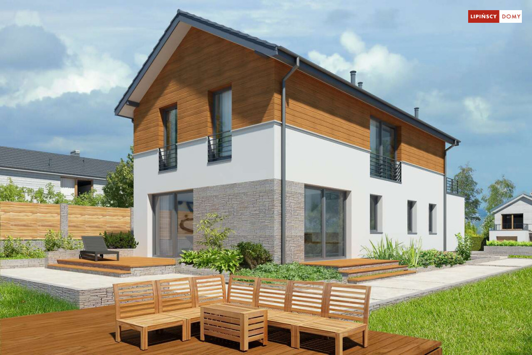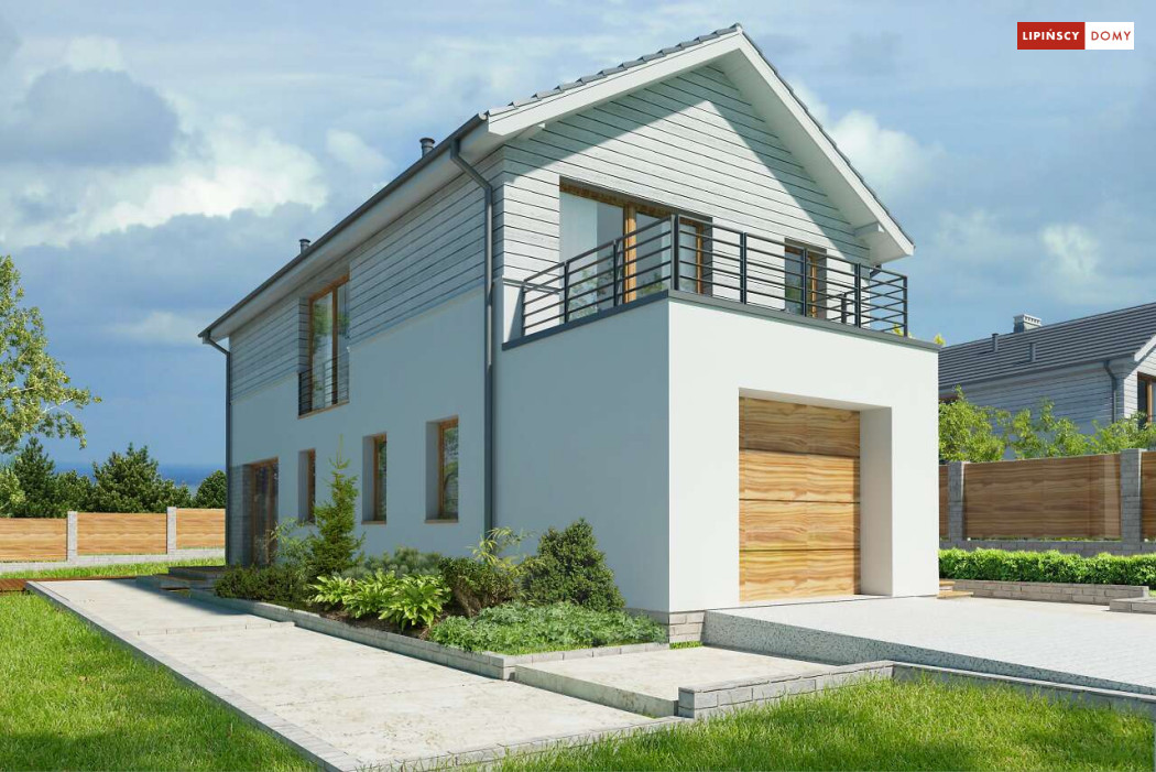 Dom piętrowy dla czteroosobowej rodziny, który będzie pasował nawet na bardzo wąską działkę. W przypadku realizacji na wąskiej działce ściana bez okien może zostać przesunięta nawet na 1,5m od granicy działki (jeżeli miejscowy plan zagospodarowania przestrzennego albo decyzja o warunkach zabudowy nie stanowi inaczej.). Wjazd i wejście jest od ściany szczytowej. Na parterze zaprojektowano przestronną strefę dzienną – salon z miejscem na rodzinny stół i kuchnię ze spiżarnią. Na piętrze znajdują się duża sypialnia z tarasem, dwie mniejsze sypialnie, jasna łazienka oraz miejsce do pracy przy komputerze.