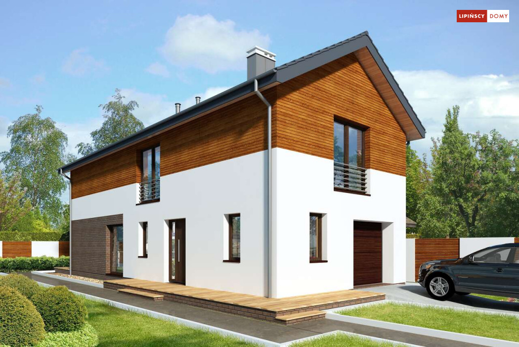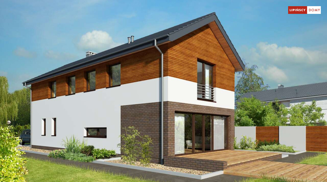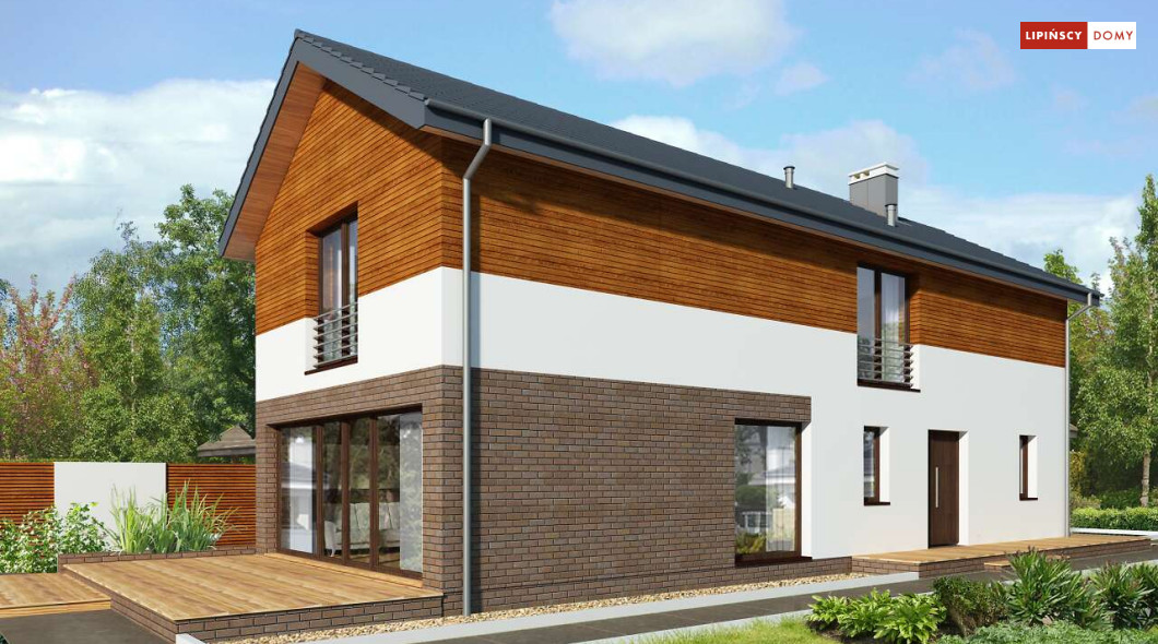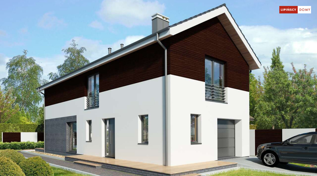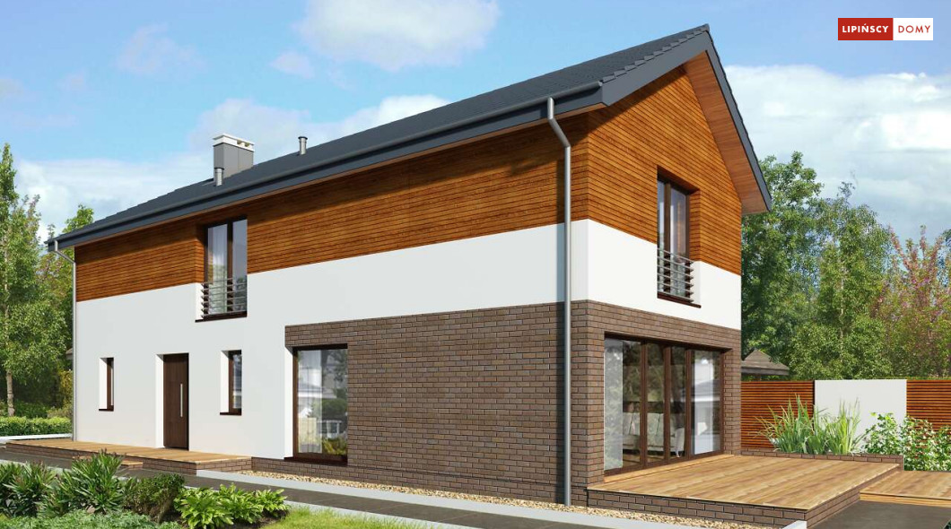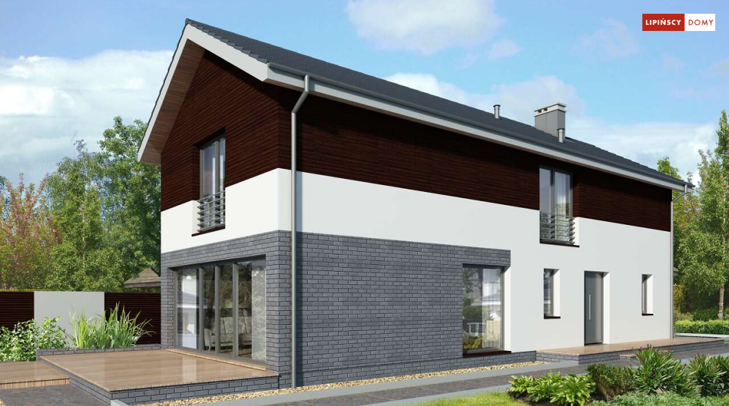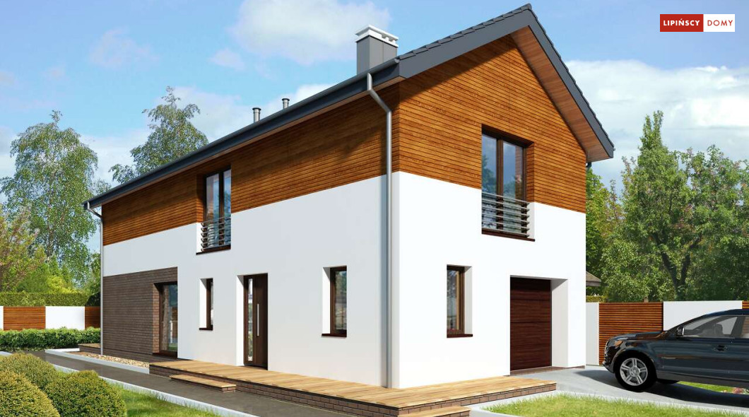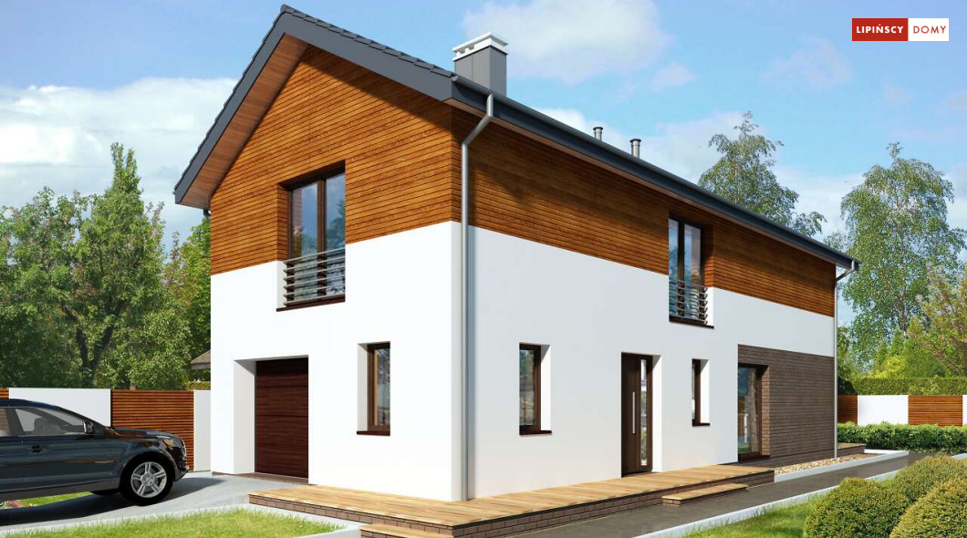 Projekt domu na wąską działkę idealny dla pięcioosobowej rodziny. Salon z przeszkloną ścianą południową pozwala obcować z naturą poprzez otwarcie na ogród. Znalazło się tu miejsce na rodzinny stół obok otwartej kuchni, która posiada praktyczną spiżarnię. Jest również toaleta oraz strefa garażowa z dużą kotłownią. Na piętrze znajduje się sypialnia rodziców z możliwością zaaranżowania garderoby oraz trzy pokoje dla dzieci i miejsce na pojemną szafę w zabudowie.