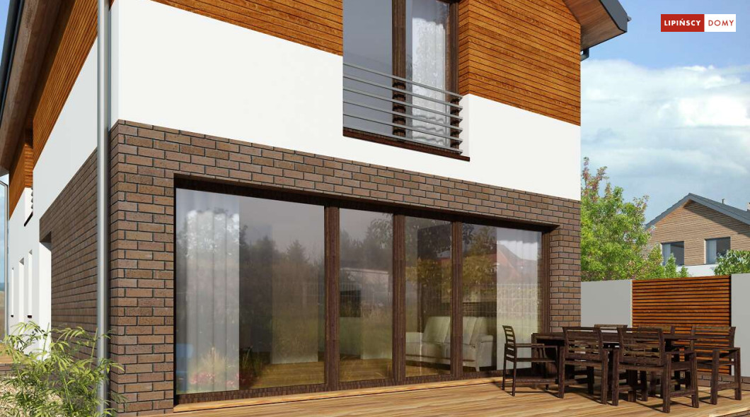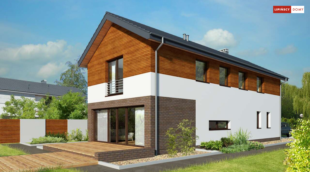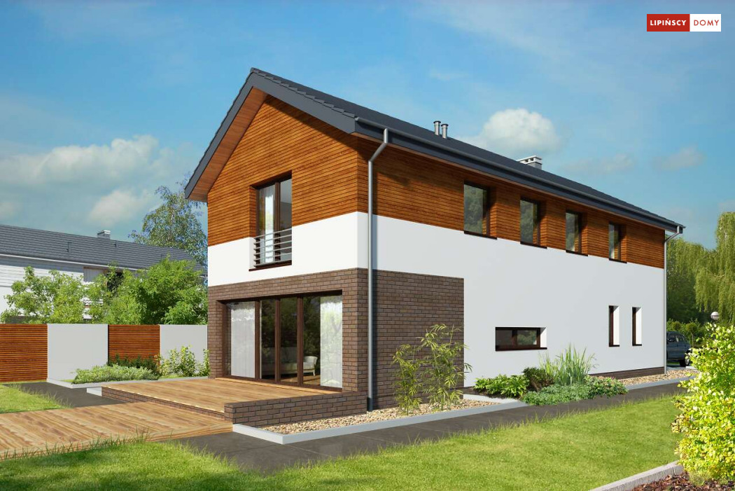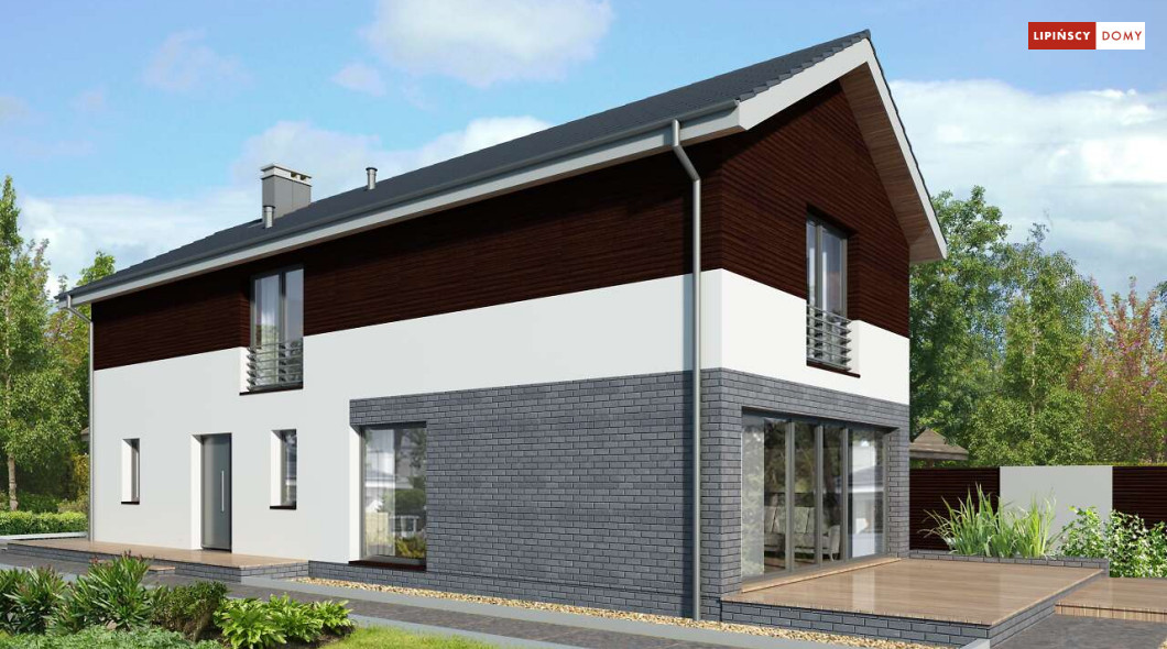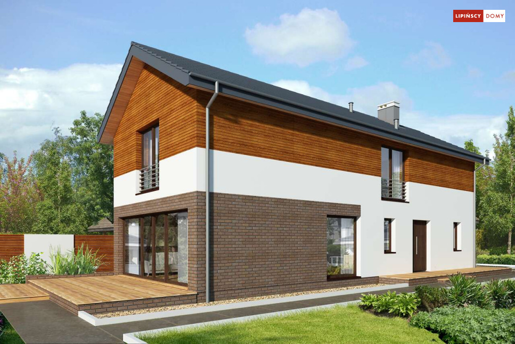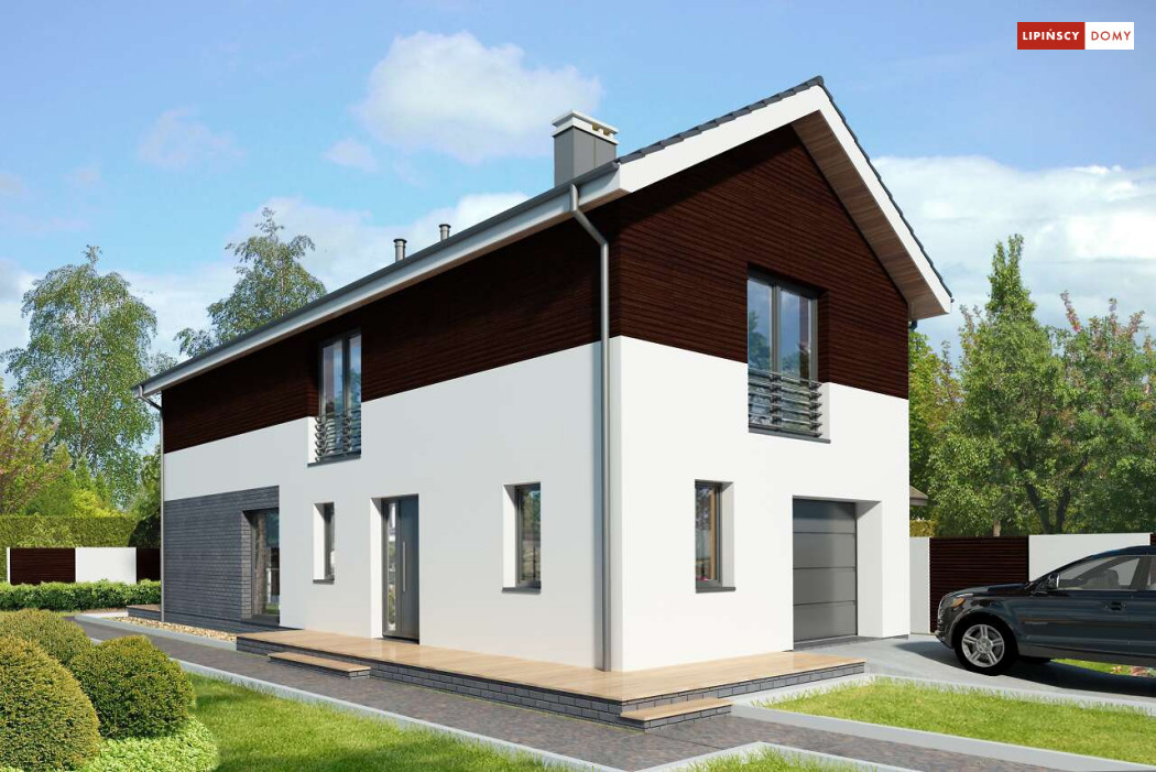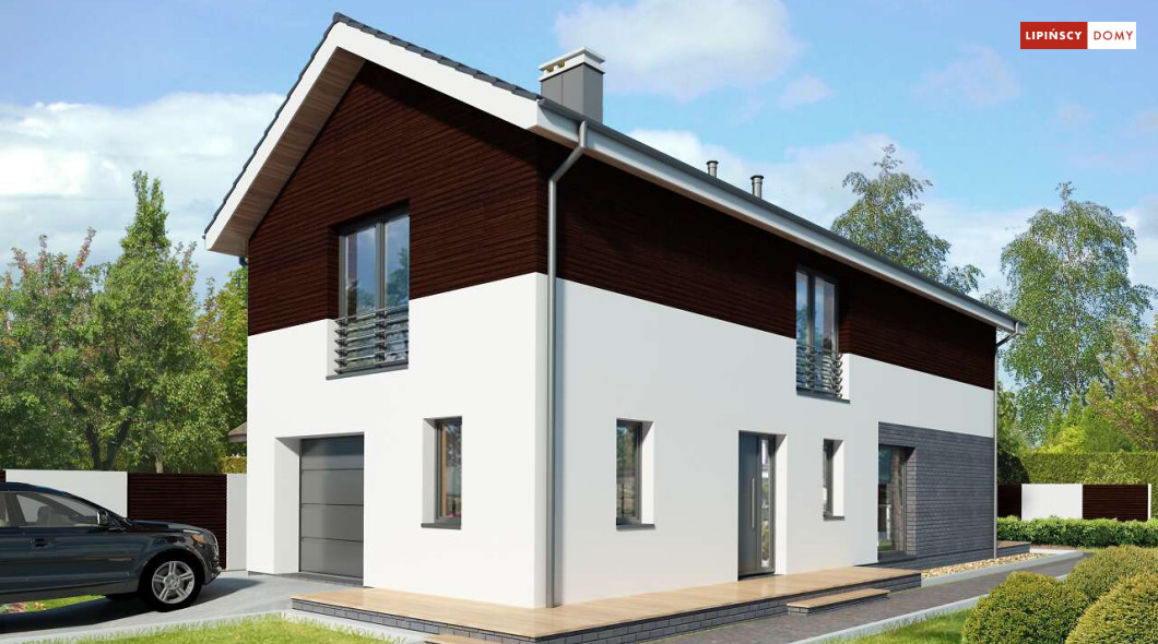 Projekt domu na wąską działkę idealny dla pięcioosobowej rodziny. Salon z przeszkloną ścianą południową pozwala obcować z naturą poprzez otwarcie na ogród. Znalazło się tu miejsce na rodzinny stół obok otwartej kuchni, która posiada praktyczną spiżarnię. Jest również toaleta oraz strefa garażowa z dużą kotłownią. Na piętrze znajduje się sypialnia rodziców z możliwością zaaranżowania garderoby oraz trzy pokoje dla dzieci i miejsce na pojemną szafę w zabudowie.