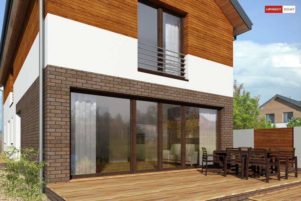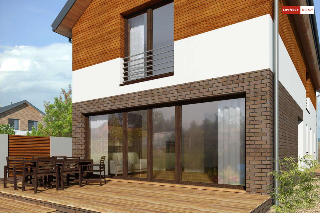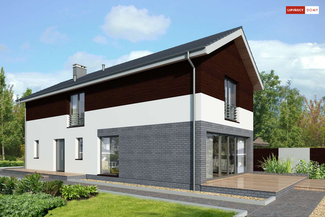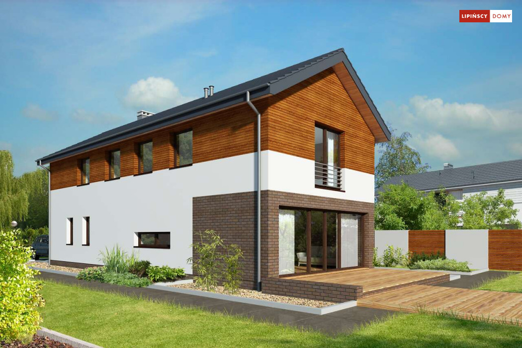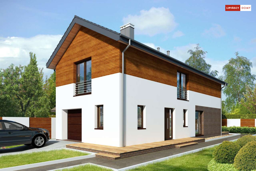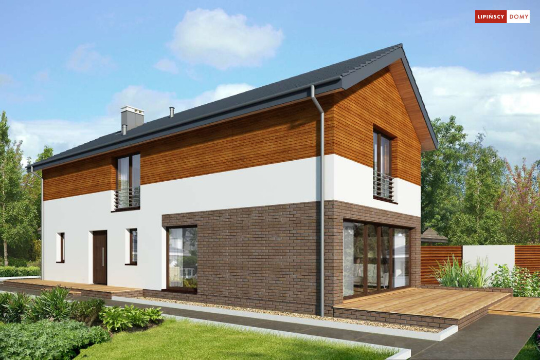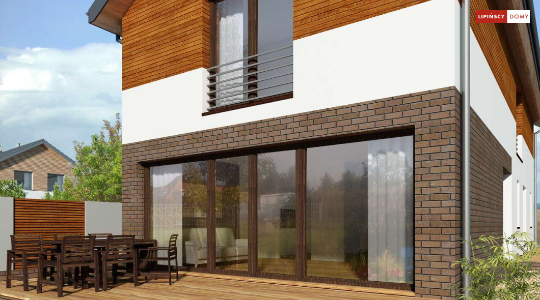 Projekt domu na wąską działkę idealny dla pięcioosobowej rodziny. Salon z przeszkloną ścianą południową pozwala obcować z naturą poprzez otwarcie na ogród. Znalazło się tu miejsce na rodzinny stół obok otwartej kuchni, która posiada praktyczną spiżarnię. Jest również toaleta oraz strefa garażowa z dużą kotłownią. Na piętrze znajduje się sypialnia rodziców z możliwością zaaranżowania garderoby oraz trzy pokoje dla dzieci i miejsce na pojemną szafę w zabudowie.