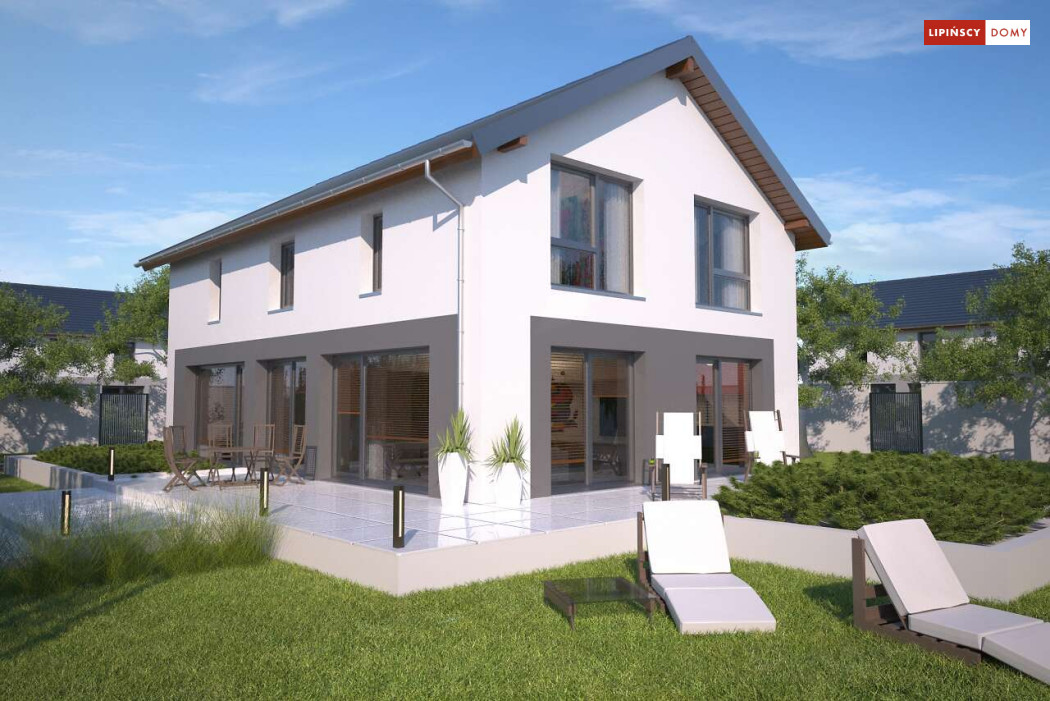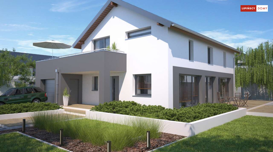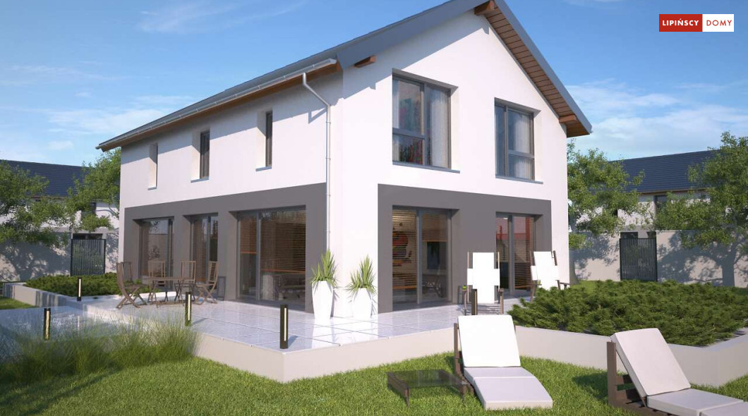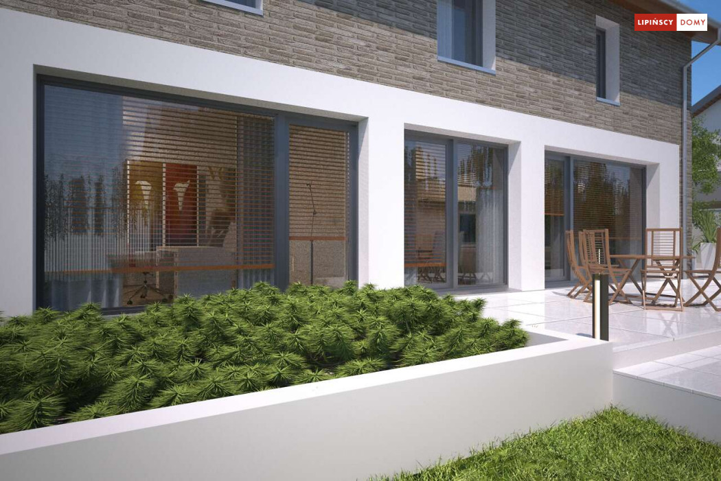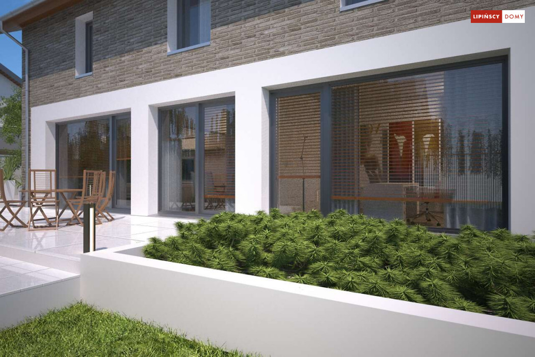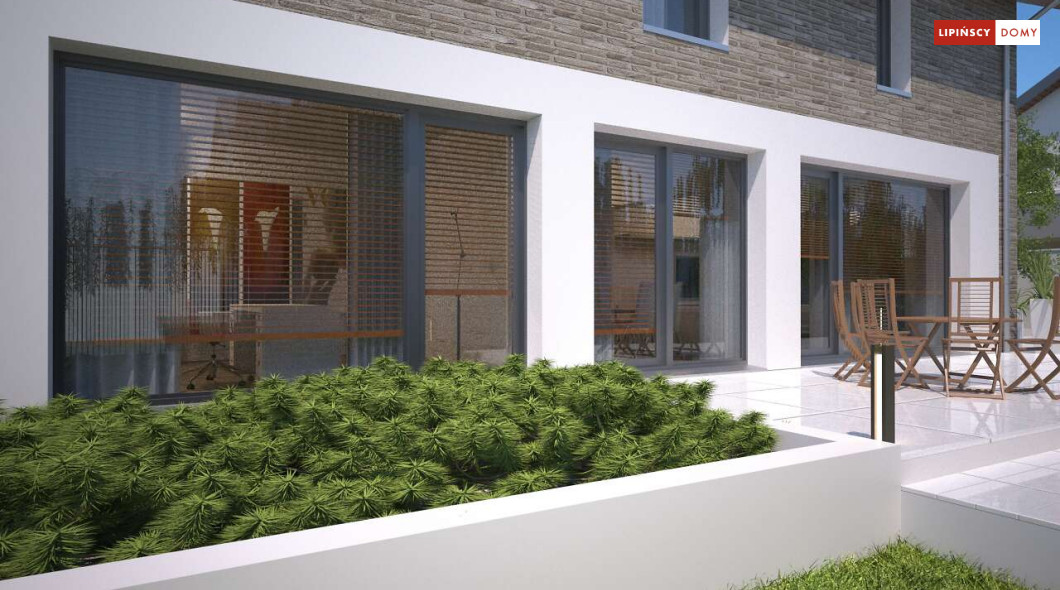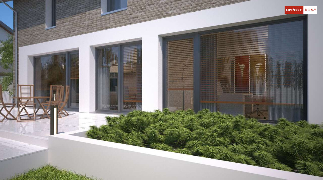 Duży, efektowny dom energooszczędny, w którym niewątpliwym atutem są przeszklenia i tarasy. Dom jest otwarty na ogród. Do dyspozycji mieszkańców są trzy przestronne sypialnie i komfortowa łazienka. Na parterze salon z jadalną jest miejscem idealnym do spędzania wspólnie wolnego czasu. Dodatkowy pokój na parterze może być zaaranżowany jako gabinet lub sypialnia dla gości. W projekcie znalazło się miejsce na wiele pomieszczeń pomocniczych. Jest pralnia, gdzie umieszczono rekuperator, pomieszczenie gospodarcze, w którym zlokalizowana jest jednostka pompy ciepła, spiżarnia dostępna z kuchni oraz garaż i pomieszczenie z niezależnym wyjściem na zewnątrz, gdzie można przechowywać meble ogrodowe i rowery. Dostępna jest wersja projektu z kotłownią za garażem z piecem gazowym.