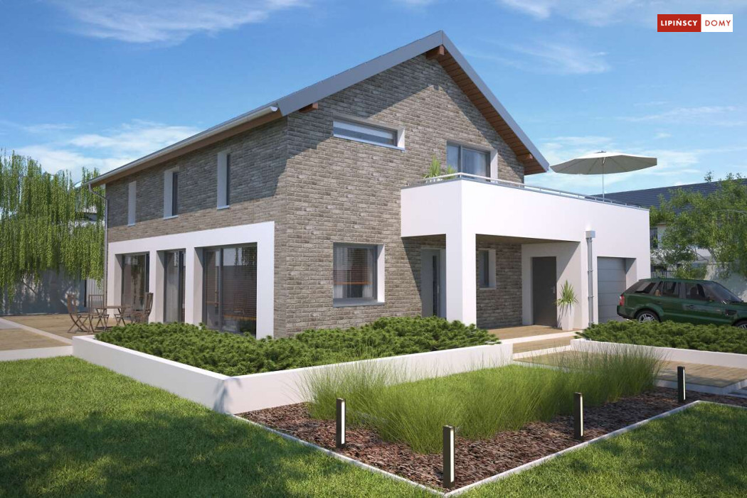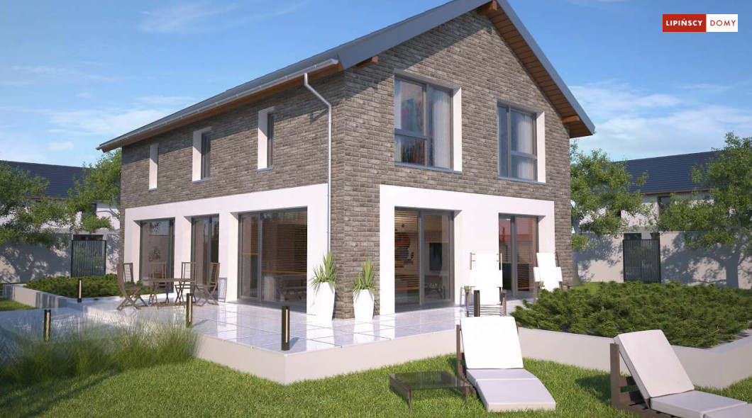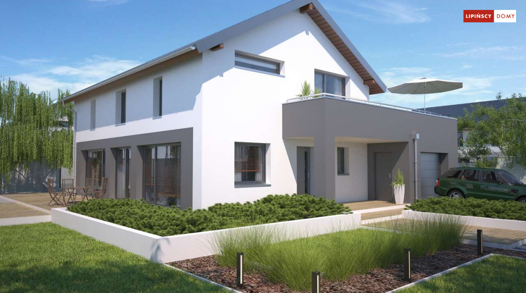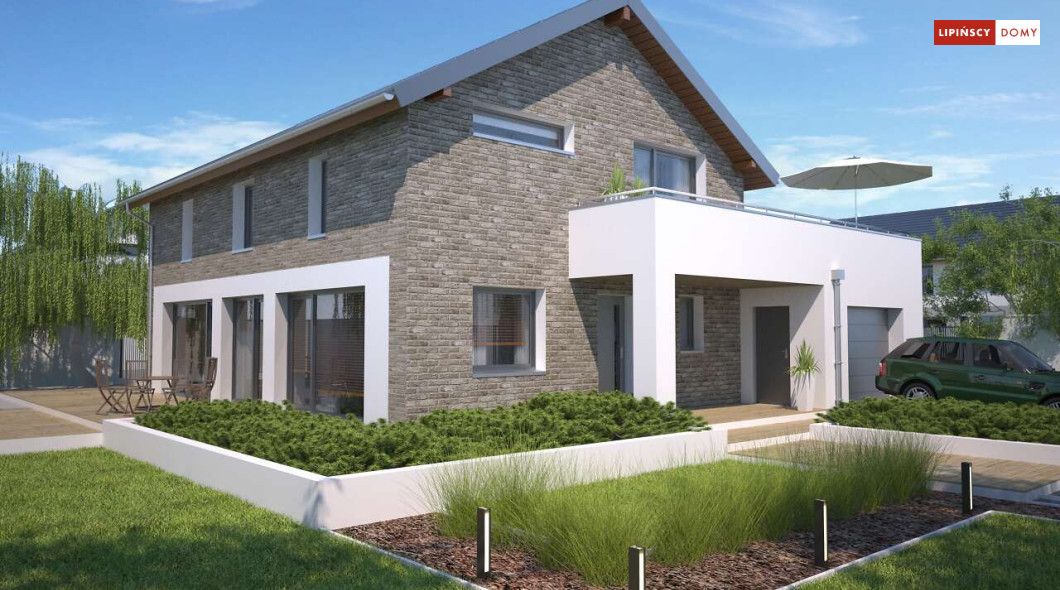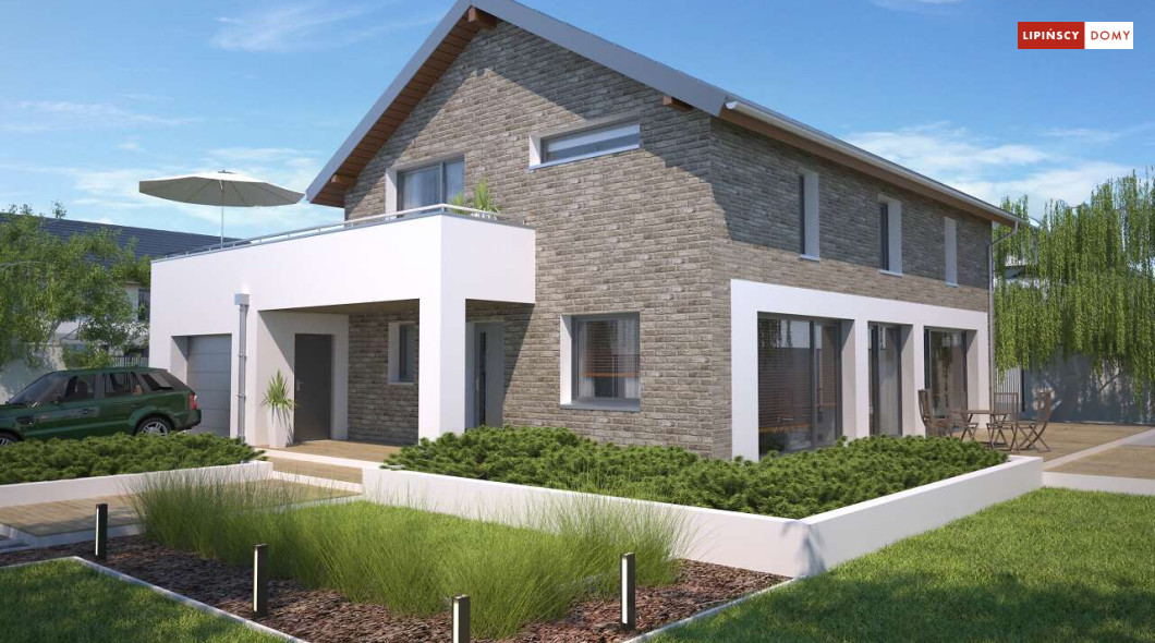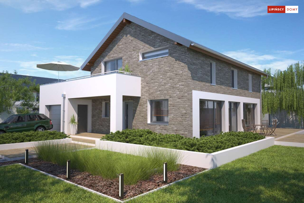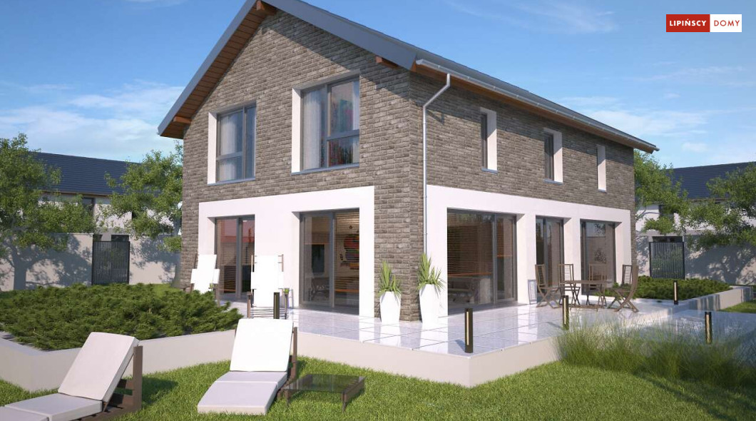 Duży, efektowny dom energooszczędny, w którym niewątpliwym atutem są przeszklenia i tarasy. Dom jest otwarty na ogród. Do dyspozycji mieszkańców są trzy przestronne sypialnie i komfortowa łazienka. Na parterze salon z jadalną jest miejscem idealnym do spędzania wspólnie wolnego czasu. Dodatkowy pokój na parterze może być zaaranżowany jako gabinet lub sypialnia dla gości. W projekcie znalazło się miejsce na wiele pomieszczeń pomocniczych. Jest pralnia, gdzie umieszczono rekuperator, pomieszczenie gospodarcze, w którym zlokalizowana jest jednostka pompy ciepła, spiżarnia dostępna z kuchni oraz garaż i pomieszczenie z niezależnym wyjściem na zewnątrz, gdzie można przechowywać meble ogrodowe i rowery. Dostępna jest wersja projektu z kotłownią za garażem z piecem gazowym.