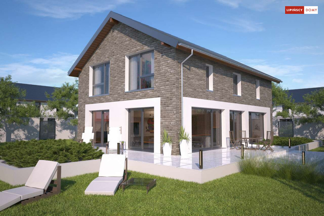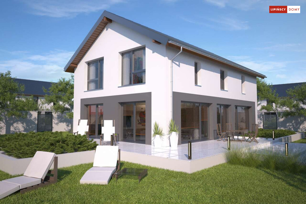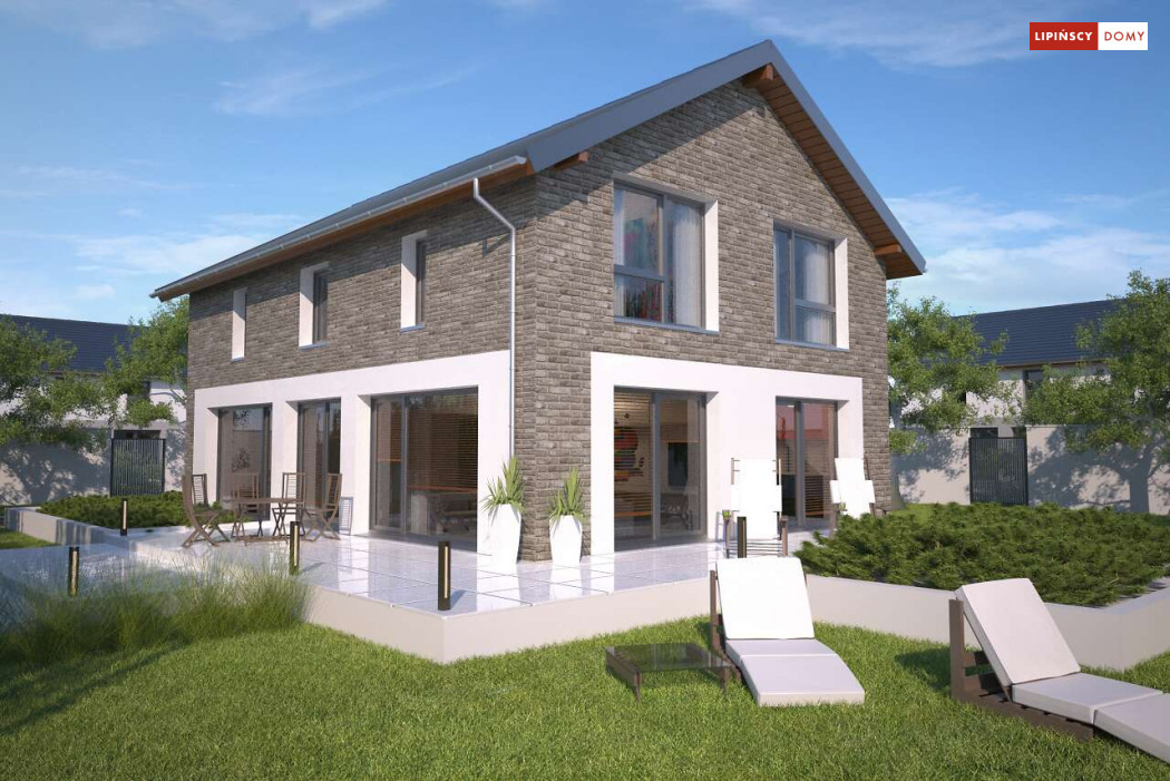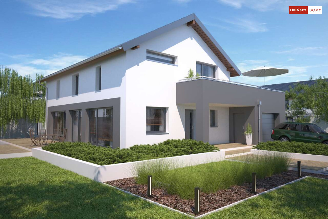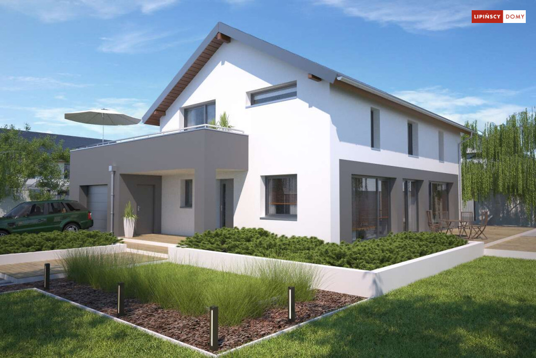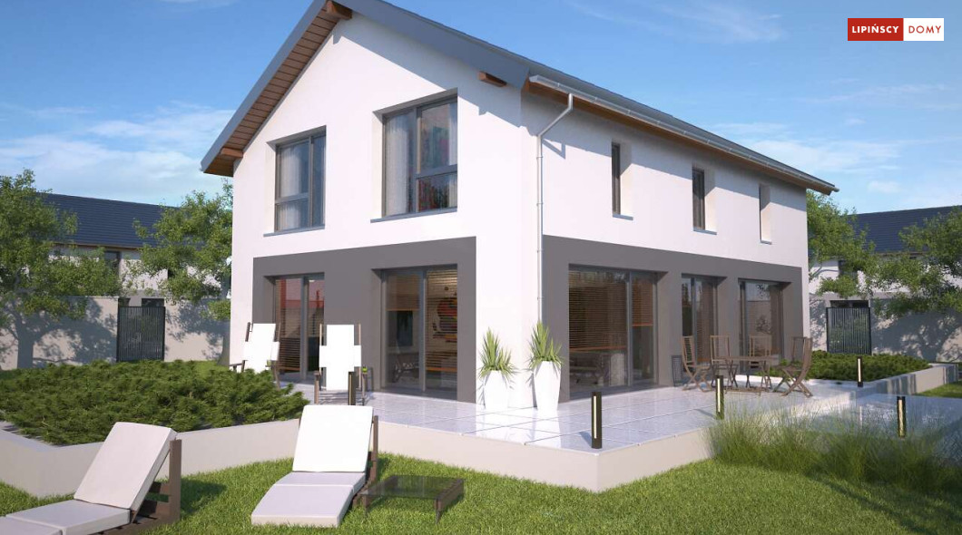 Duży, efektowny dom energooszczędny, w którym niewątpliwym atutem są przeszklenia i tarasy. Dom jest otwarty na ogród. Do dyspozycji mieszkańców są trzy przestronne sypialnie i komfortowa łazienka. Na parterze salon z jadalną jest miejscem idealnym do spędzania wspólnie wolnego czasu. Dodatkowy pokój na parterze może być zaaranżowany jako gabinet lub sypialnia dla gości. W projekcie znalazło się miejsce na wiele pomieszczeń pomocniczych. Jest pralnia, gdzie umieszczono rekuperator, pomieszczenie gospodarcze, w którym zlokalizowana jest jednostka pompy ciepła, spiżarnia dostępna z kuchni oraz garaż i pomieszczenie z niezależnym wyjściem na zewnątrz, gdzie można przechowywać meble ogrodowe i rowery. Dostępna jest wersja projektu z kotłownią za garażem z piecem gazowym.