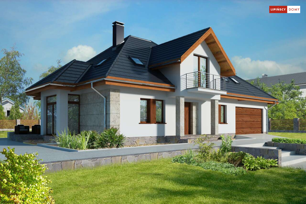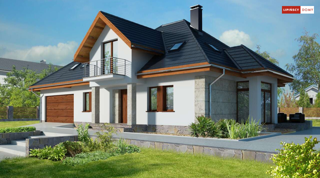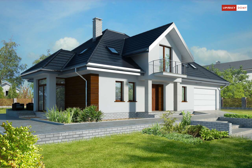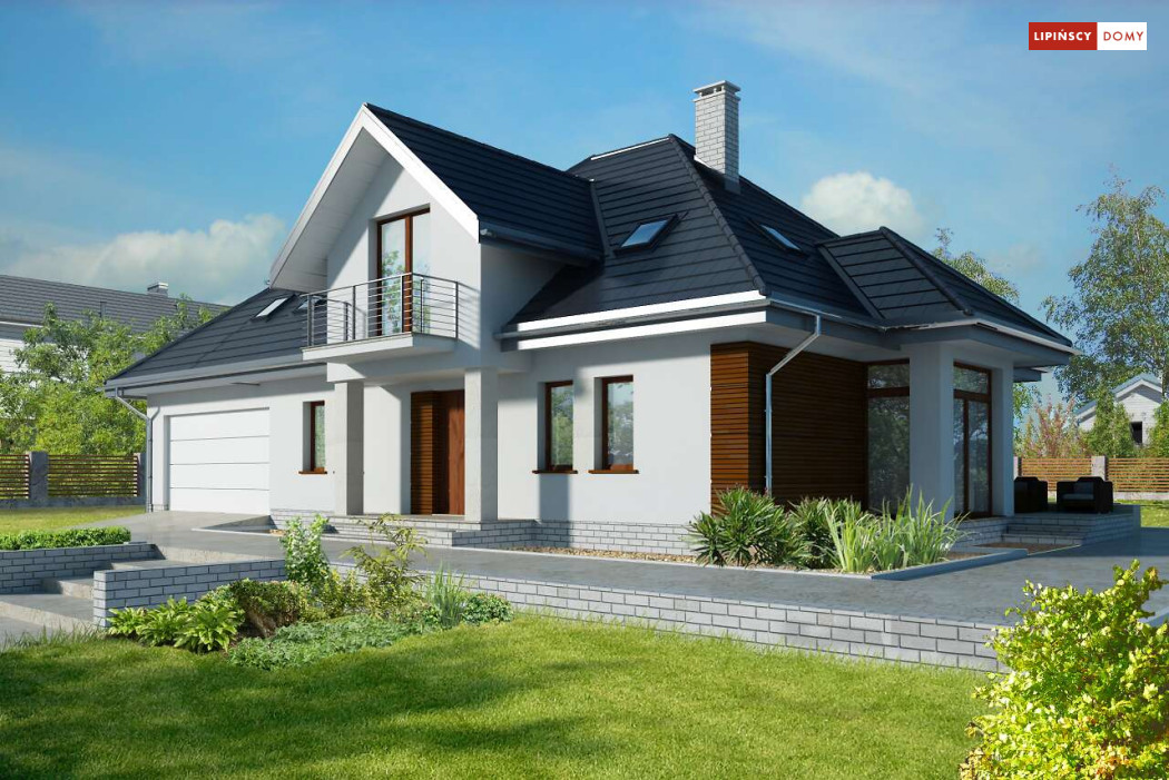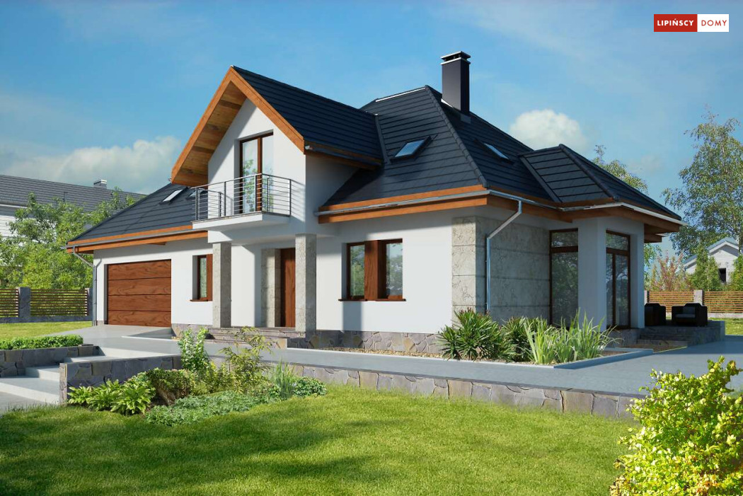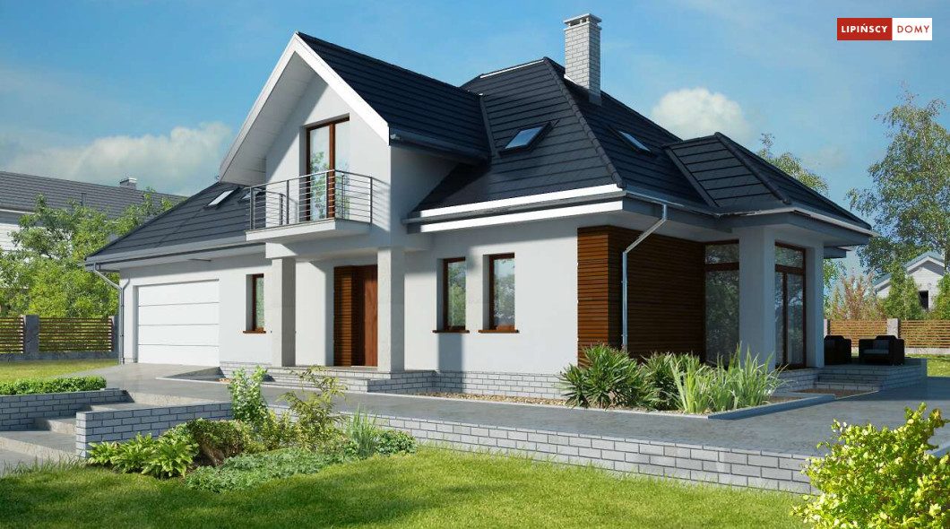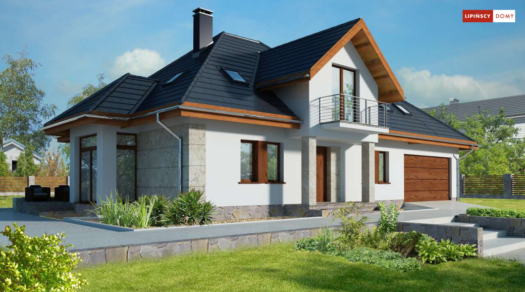 Wygodny dom energooszczędny z użytkowym poddaszem, idealny dla osób ceniących wygodę i przestronne wnętrza. Salon na parterze tworzy jedną przestrzeń z jadalnią, a jego centrum stanowi nadający klimatu kominek. Półotwarta kuchnia - duża i funkcjonalnie rozplanowana, to niewątpliwy atut projektu. Podobnie jak dodatkowy pokój na parterze, doskonale nadający się jako pokój dla gości lub gabinet i wygodna łazienka. Poddasze to strefa prywatna, do której przynależy sypialnia z garderobą, trzy pokoje oraz duża łazienka i pomieszczenie gospodarcze. W bryłę budynku harmonijnie wpisuje się garaż na dwa auta, za którym zlokalizowano dużą kotłownię z możliwością zastosowania pieca na paliwo stałe. Do garażu można przejść bezpośrednio z domu przez pomieszczenie gospodarcze.