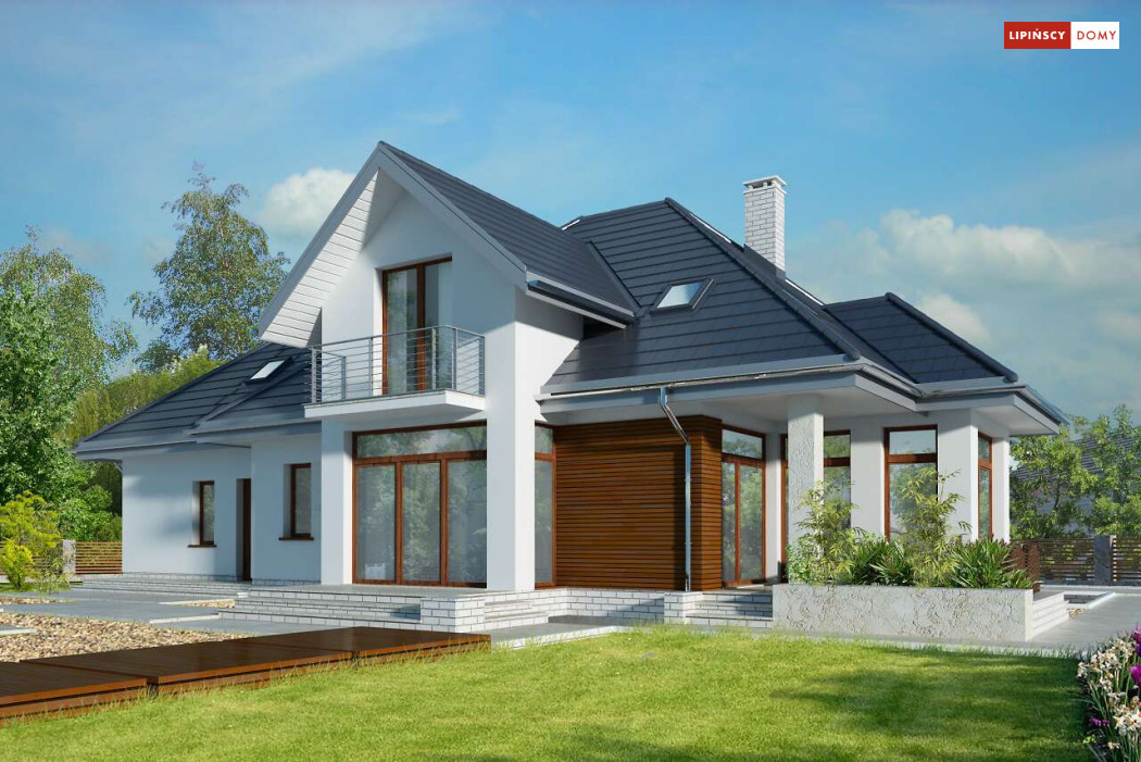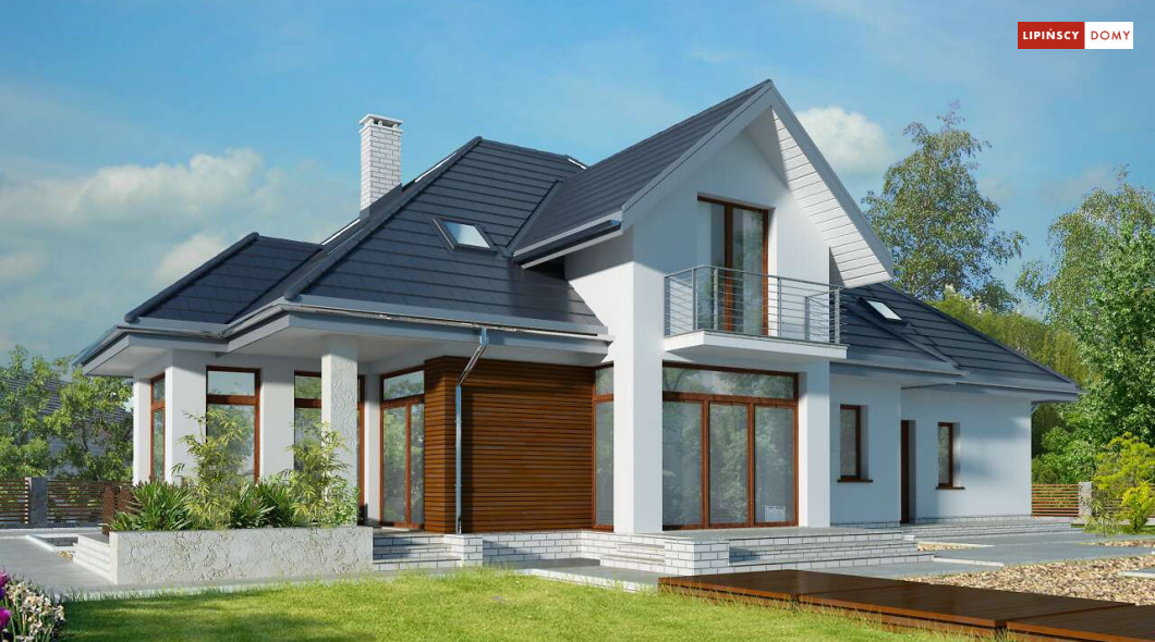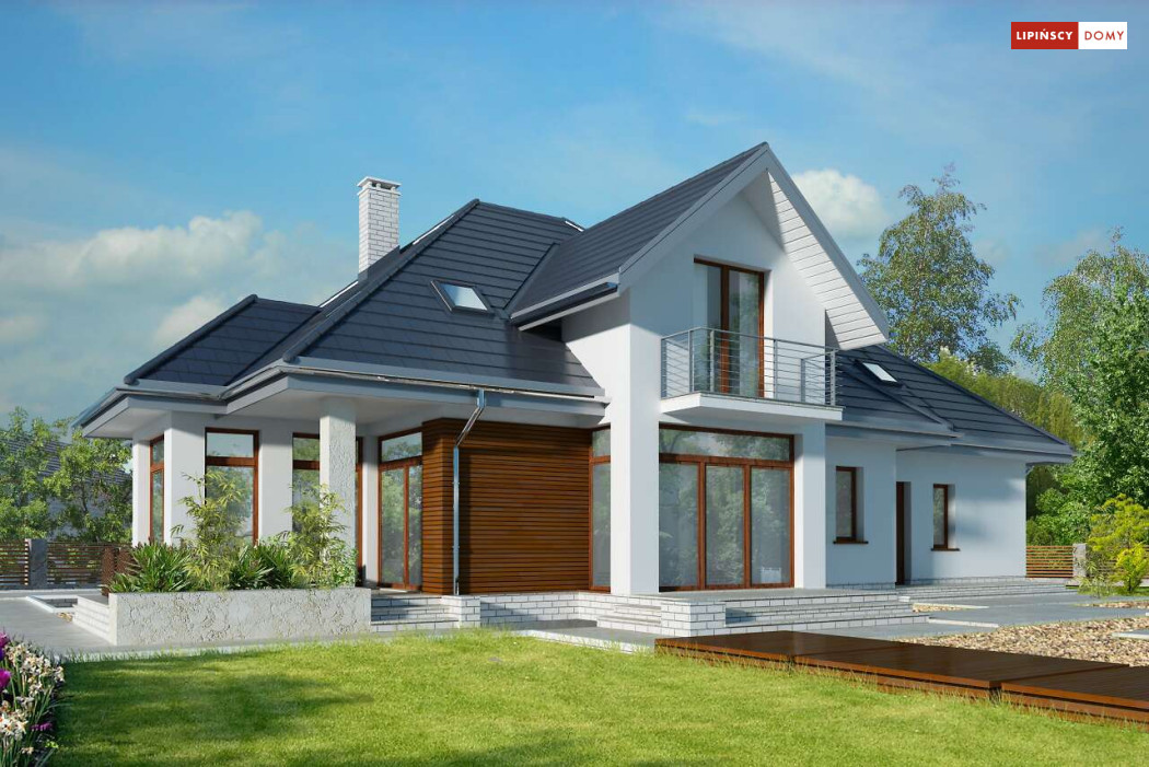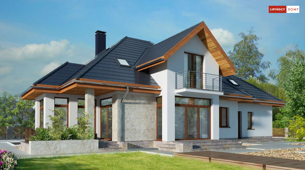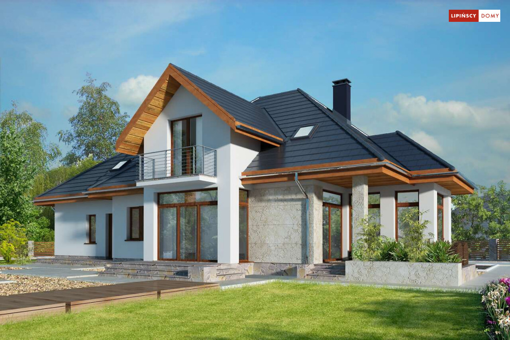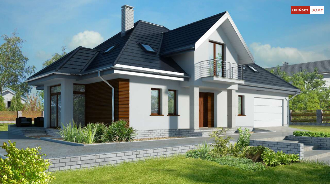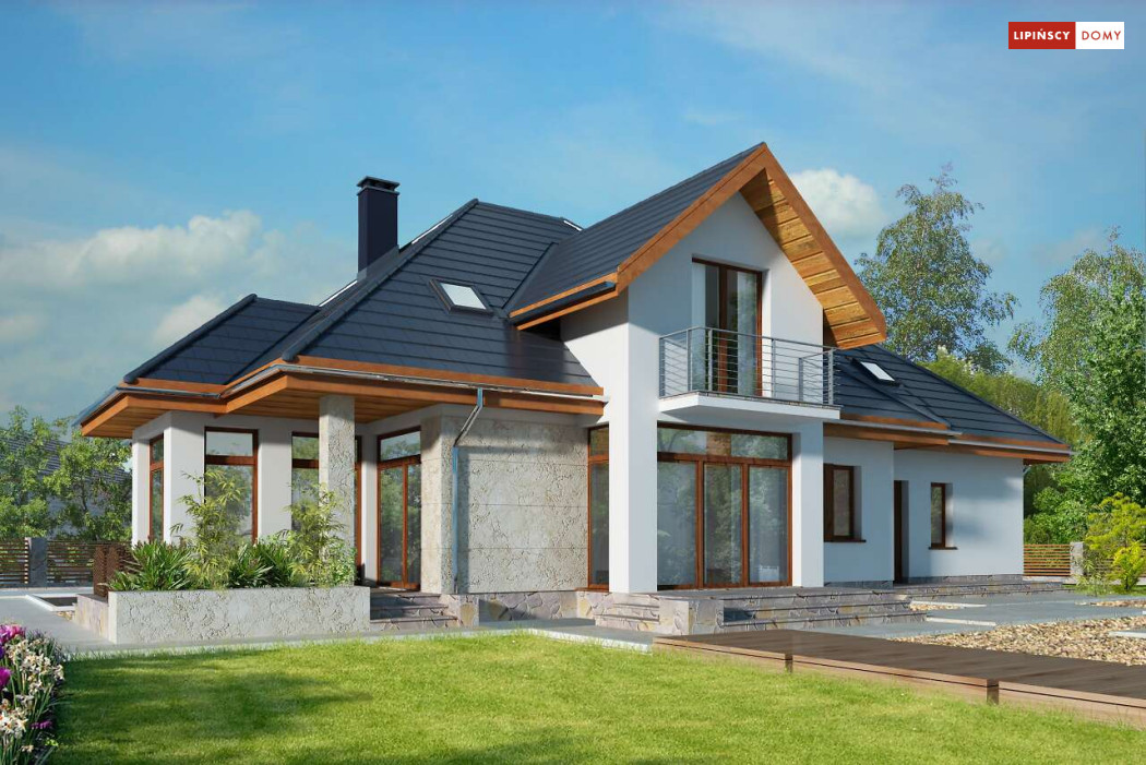 Wygodny dom energooszczędny z użytkowym poddaszem, idealny dla osób ceniących wygodę i przestronne wnętrza. Salon na parterze tworzy jedną przestrzeń z jadalnią, a jego centrum stanowi nadający klimatu kominek. Półotwarta kuchnia - duża i funkcjonalnie rozplanowana, to niewątpliwy atut projektu. Podobnie jak dodatkowy pokój na parterze, doskonale nadający się jako pokój dla gości lub gabinet i wygodna łazienka. Poddasze to strefa prywatna, do której przynależy sypialnia z garderobą, trzy pokoje oraz duża łazienka i pomieszczenie gospodarcze. W bryłę budynku harmonijnie wpisuje się garaż na dwa auta, za którym zlokalizowano dużą kotłownię z możliwością zastosowania pieca na paliwo stałe. Do garażu można przejść bezpośrednio z domu przez pomieszczenie gospodarcze.