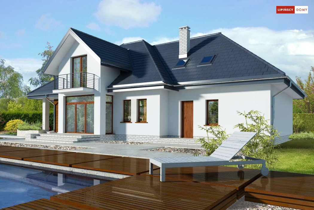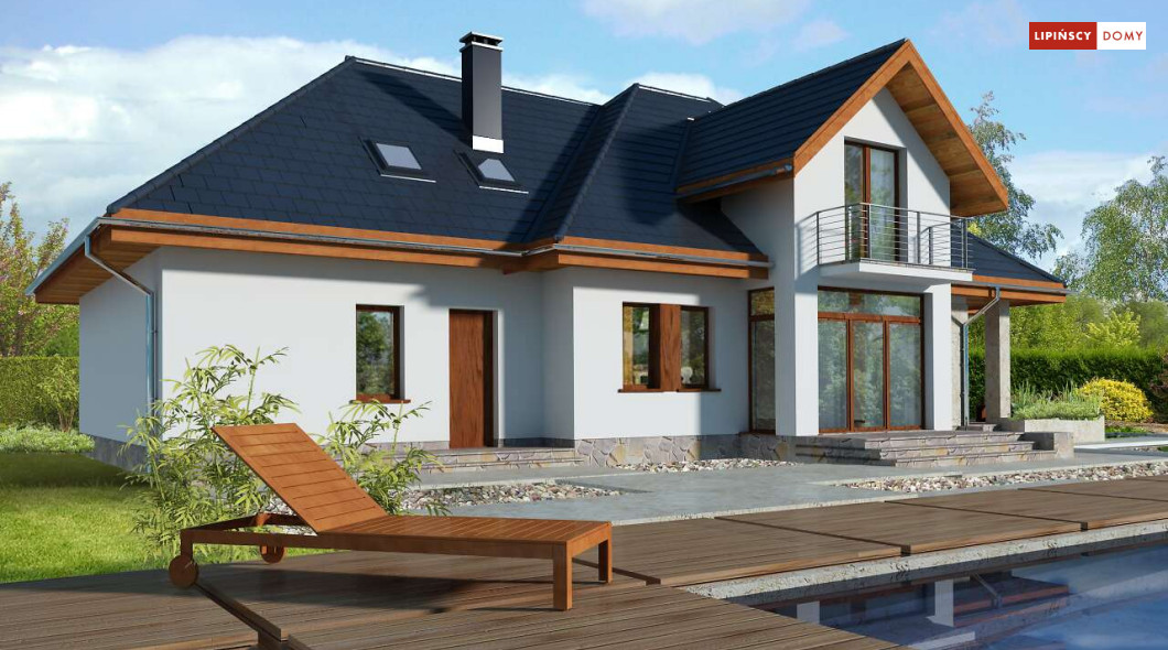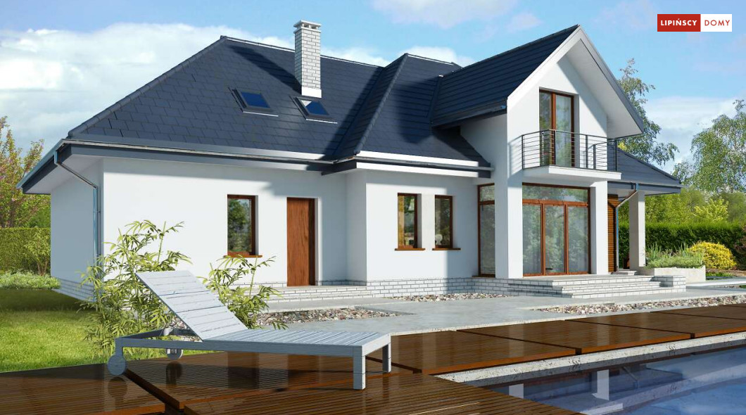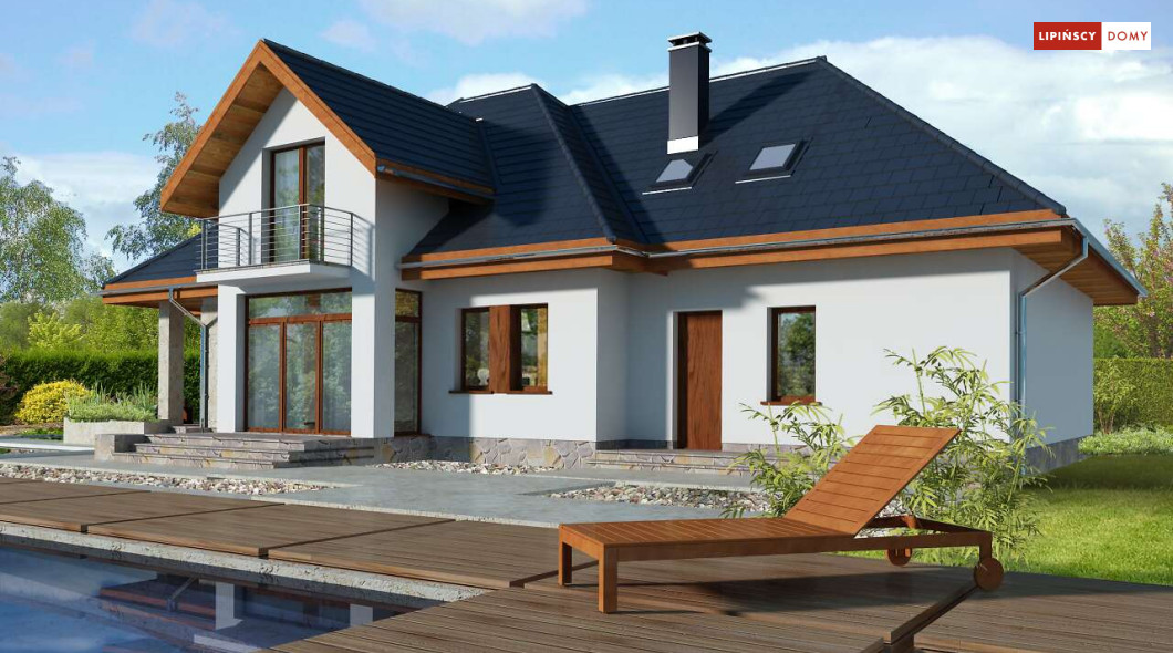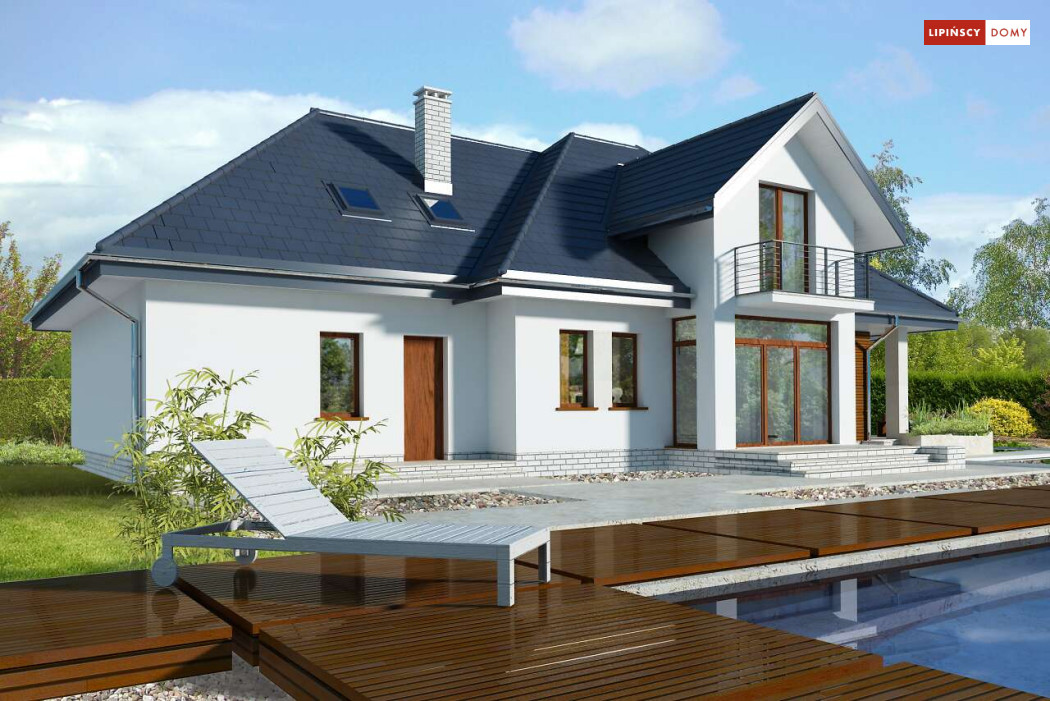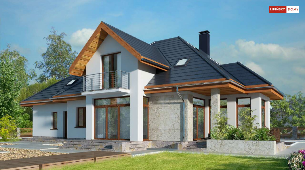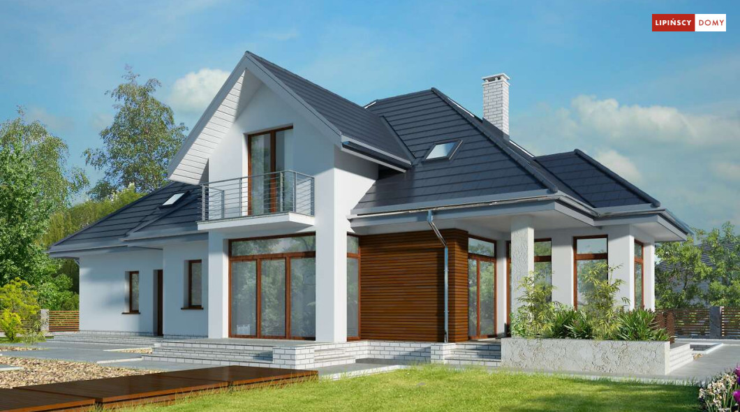 Wygodny dom energooszczędny z użytkowym poddaszem, idealny dla osób ceniących wygodę i przestronne wnętrza. Salon na parterze tworzy jedną przestrzeń z jadalnią, a jego centrum stanowi nadający klimatu kominek. Półotwarta kuchnia - duża i funkcjonalnie rozplanowana, to niewątpliwy atut projektu. Podobnie jak dodatkowy pokój na parterze, doskonale nadający się jako pokój dla gości lub gabinet i wygodna łazienka. Poddasze to strefa prywatna, do której przynależy sypialnia z garderobą, trzy pokoje oraz duża łazienka i pomieszczenie gospodarcze. W bryłę budynku harmonijnie wpisuje się garaż na dwa auta, za którym zlokalizowano dużą kotłownię z możliwością zastosowania pieca na paliwo stałe. Do garażu można przejść bezpośrednio z domu przez pomieszczenie gospodarcze.
