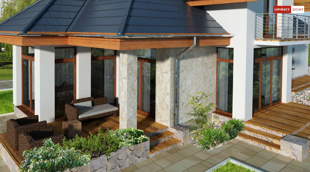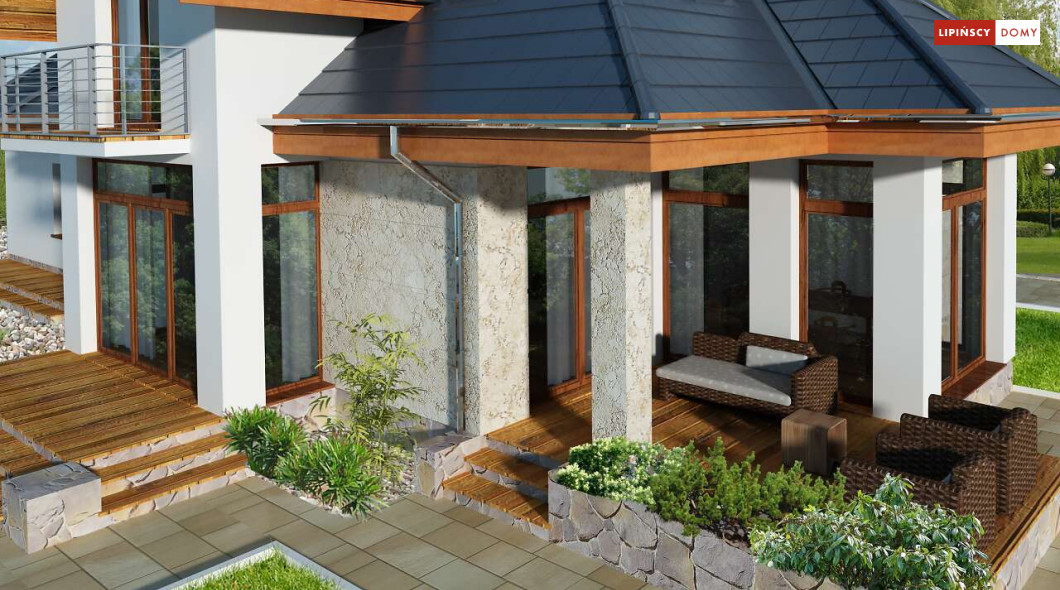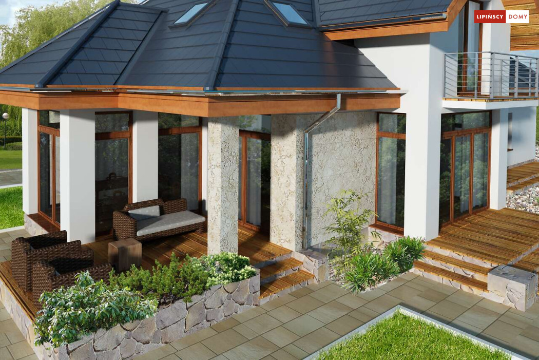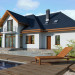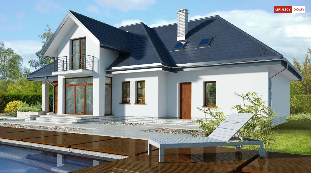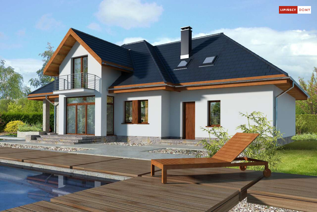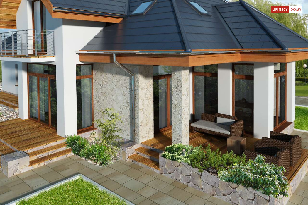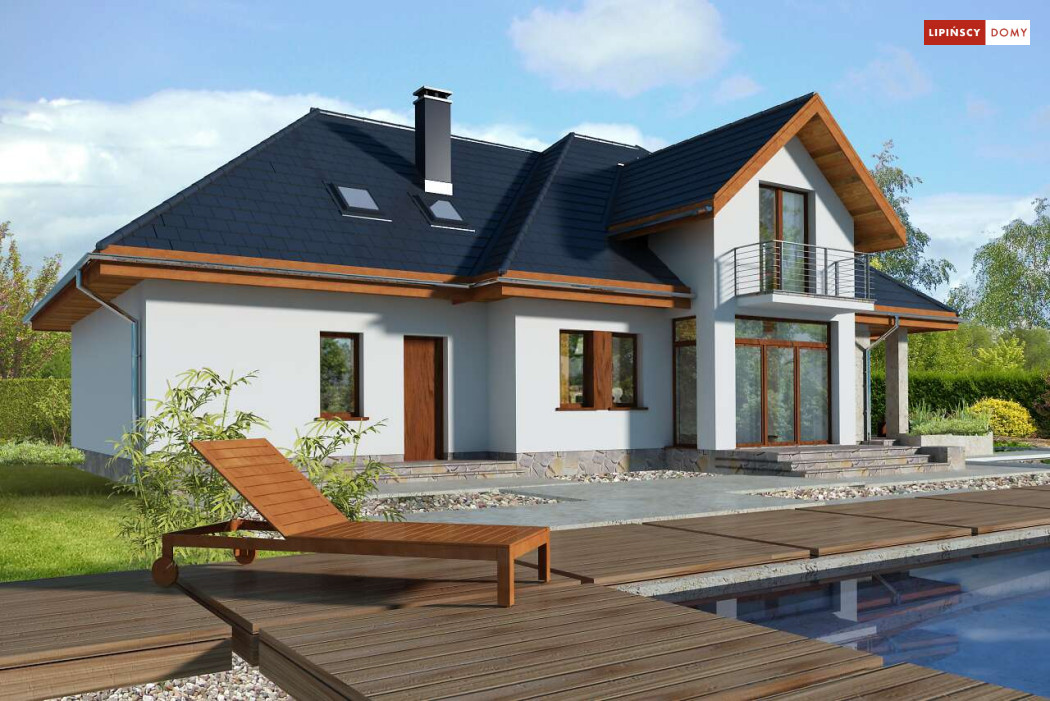 Wygodny dom energooszczędny z użytkowym poddaszem, idealny dla osób ceniących wygodę i przestronne wnętrza. Salon na parterze tworzy jedną przestrzeń z jadalnią, a jego centrum stanowi nadający klimatu kominek. Półotwarta kuchnia - duża i funkcjonalnie rozplanowana, to niewątpliwy atut projektu. Podobnie jak dodatkowy pokój na parterze, doskonale nadający się jako pokój dla gości lub gabinet i wygodna łazienka. Poddasze to strefa prywatna, do której przynależy sypialnia z garderobą, trzy pokoje oraz duża łazienka i pomieszczenie gospodarcze. W bryłę budynku harmonijnie wpisuje się garaż na dwa auta, za którym zlokalizowano dużą kotłownię z możliwością zastosowania pieca na paliwo stałe. Do garażu można przejść bezpośrednio z domu przez pomieszczenie gospodarcze.