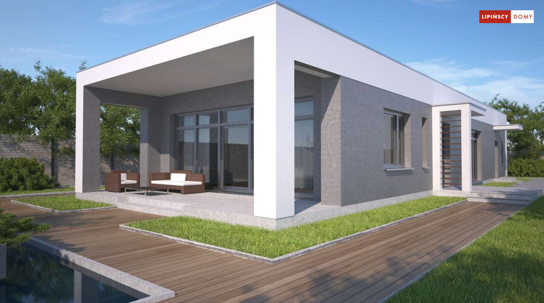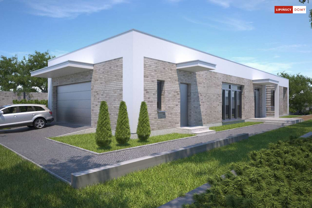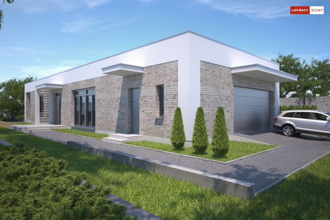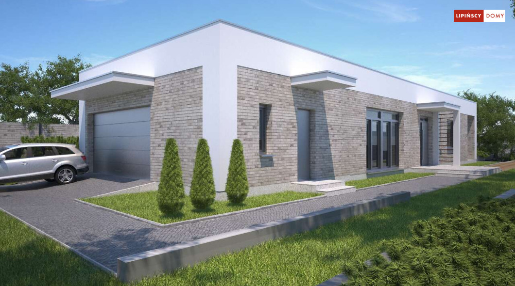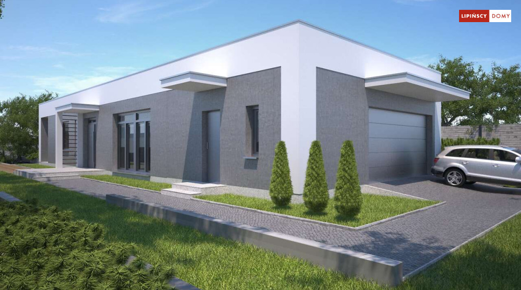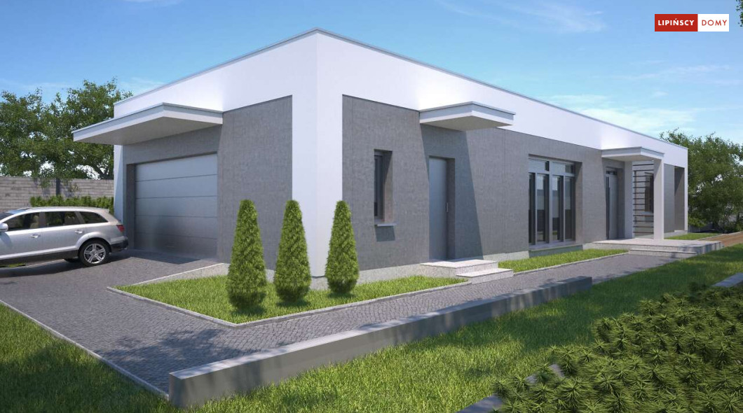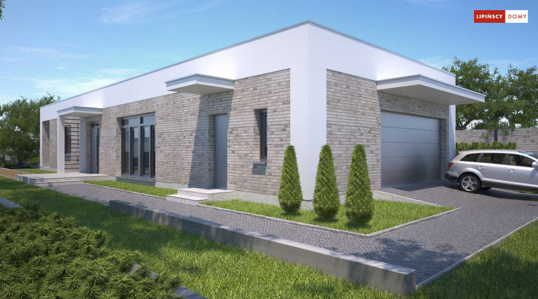 Kolejna odsłona nowoczesnego, funkcjonalnie zaplanowanego domu z płaskim dachem. Dzięki temu, że wjazd do dwustanowiskowego garażu zlokalizowany został z boku, dom można wybudować nawet na niezbyt szerokiej działce. Duże przeszklenia są nie tylko bardzo dekoracyjne, ale przede wszystkim doskonale doświetlają przestronne wnętrze, w szczególności salon i otwartą kuchnię, obok której znajduje się zadaszony, przestronny taras. Trzy sypialnie stanowią prywatną część domu. Do dyspozycji mieszkańców jest również wygodna łazienka, osobna toaleta, a obok kuchni zaplanowano podręczną spiżarnię. W projekcie przewidziano ogrzewanie kotłem na gaz. Możliwa jest zmiana ogrzewania na pompę ciepła.