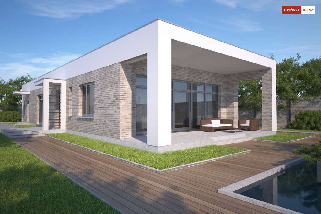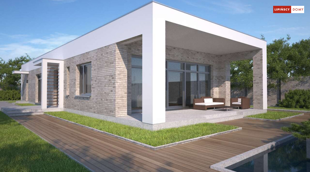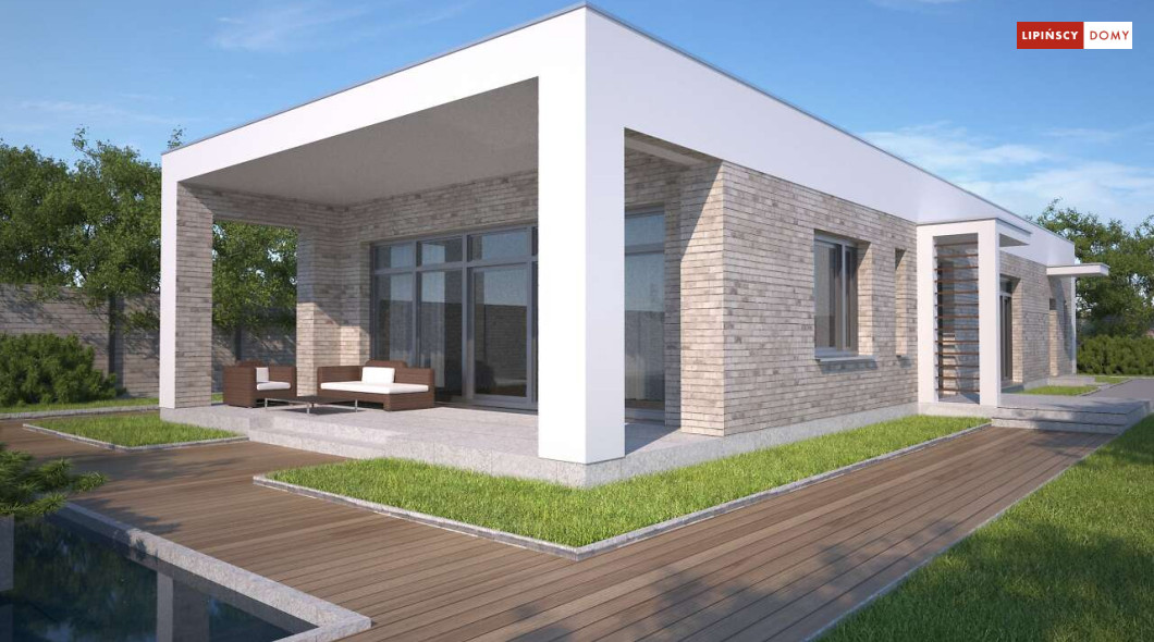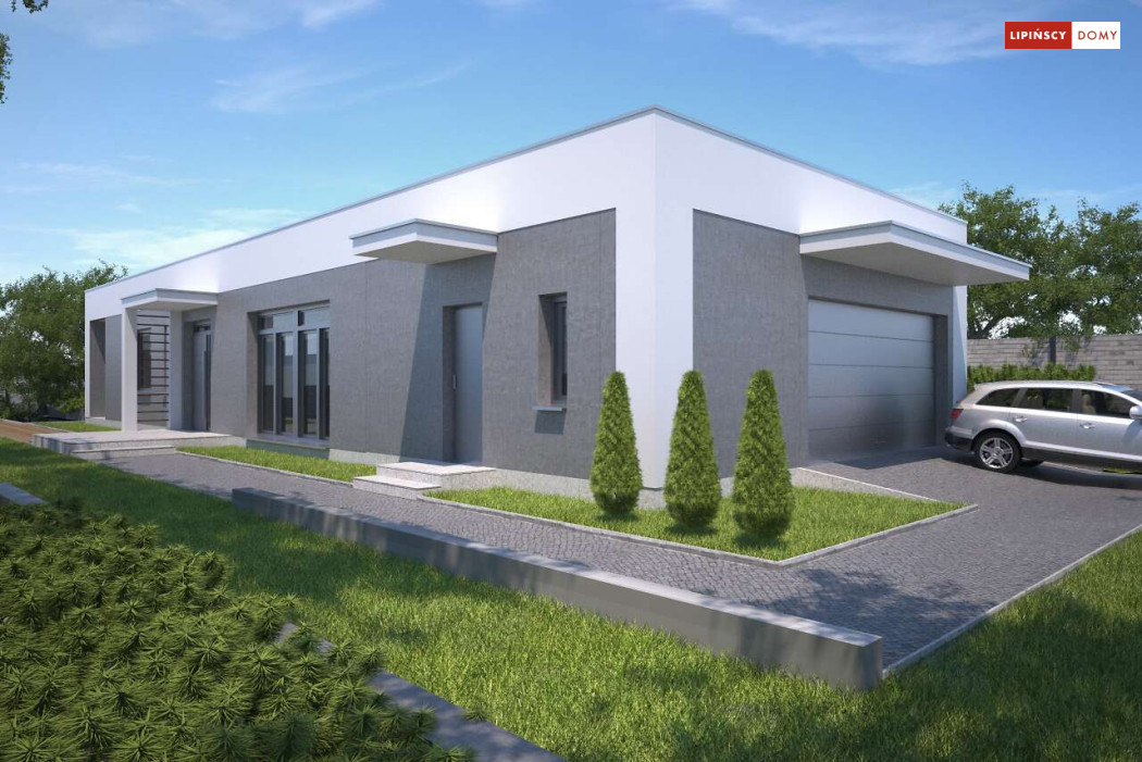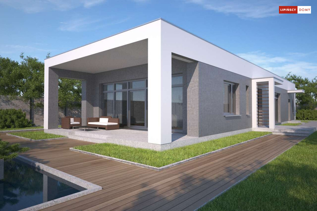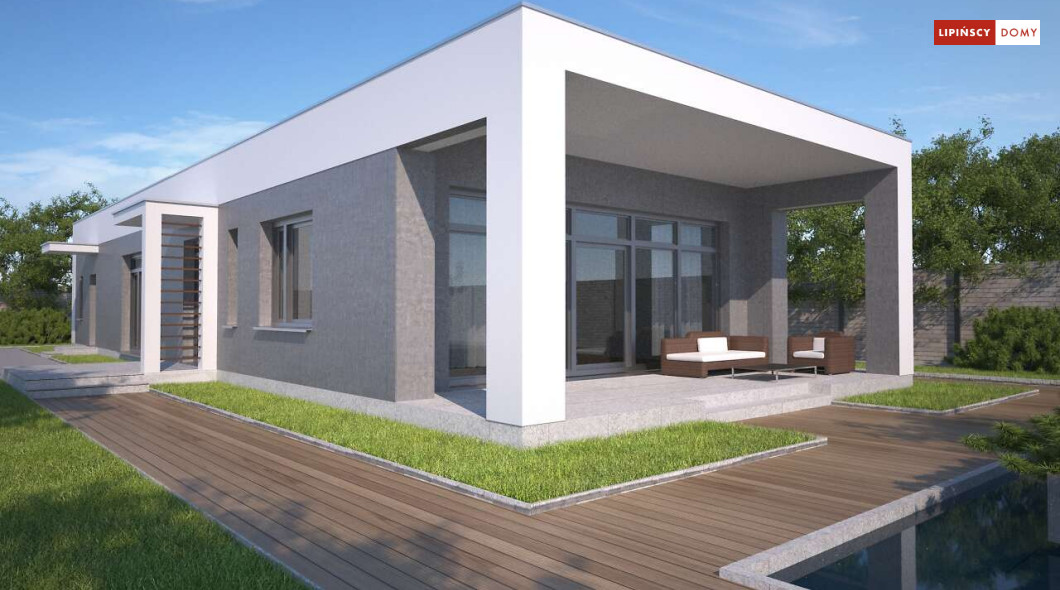 Kolejna odsłona nowoczesnego, funkcjonalnie zaplanowanego domu z płaskim dachem. Dzięki temu, że wjazd do dwustanowiskowego garażu zlokalizowany został z boku, dom można wybudować nawet na niezbyt szerokiej działce. Duże przeszklenia są nie tylko bardzo dekoracyjne, ale przede wszystkim doskonale doświetlają przestronne wnętrze, w szczególności salon i otwartą kuchnię, obok której znajduje się zadaszony, przestronny taras. Trzy sypialnie stanowią prywatną część domu. Do dyspozycji mieszkańców jest również wygodna łazienka, osobna toaleta, a obok kuchni zaplanowano podręczną spiżarnię. W projekcie przewidziano ogrzewanie kotłem na gaz. Możliwa jest zmiana ogrzewania na pompę ciepła.