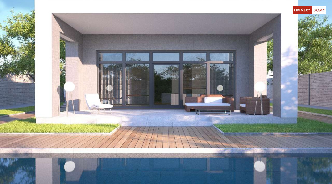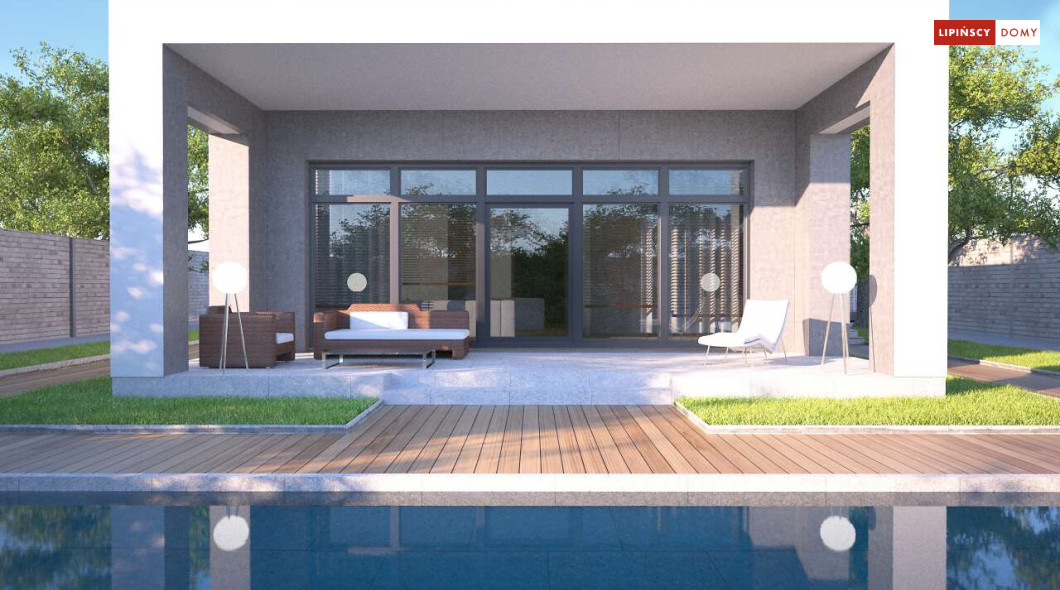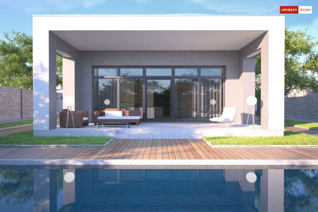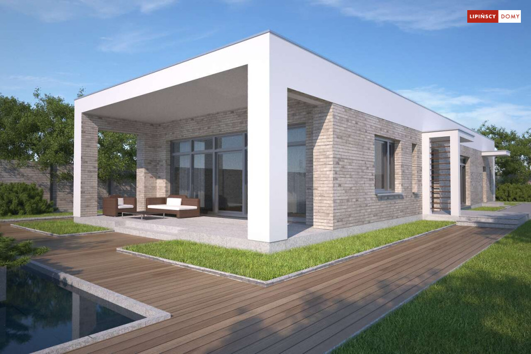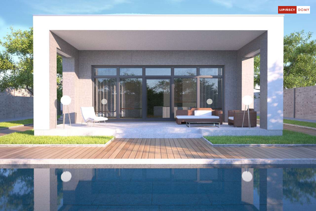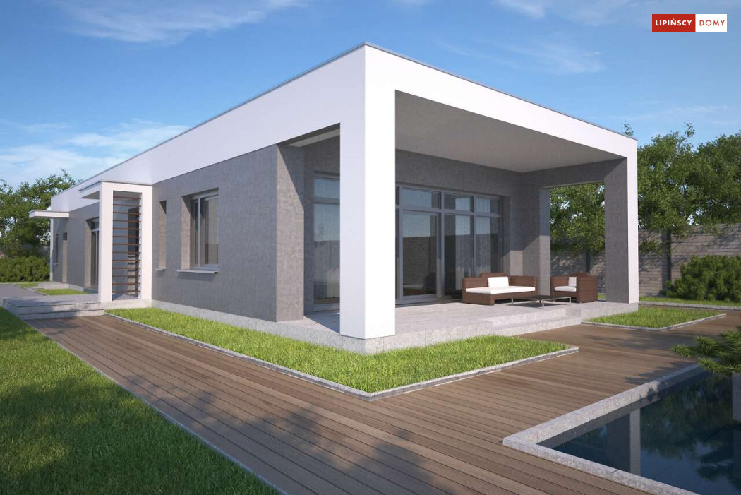 Kolejna odsłona nowoczesnego, funkcjonalnie zaplanowanego domu z płaskim dachem. Dzięki temu, że wjazd do dwustanowiskowego garażu zlokalizowany został z boku, dom można wybudować nawet na niezbyt szerokiej działce. Duże przeszklenia są nie tylko bardzo dekoracyjne, ale przede wszystkim doskonale doświetlają przestronne wnętrze, w szczególności salon i otwartą kuchnię, obok której znajduje się zadaszony, przestronny taras. Trzy sypialnie stanowią prywatną część domu. Do dyspozycji mieszkańców jest również wygodna łazienka, osobna toaleta, a obok kuchni zaplanowano podręczną spiżarnię. W projekcie przewidziano ogrzewanie kotłem na gaz. Możliwa jest zmiana ogrzewania na pompę ciepła.