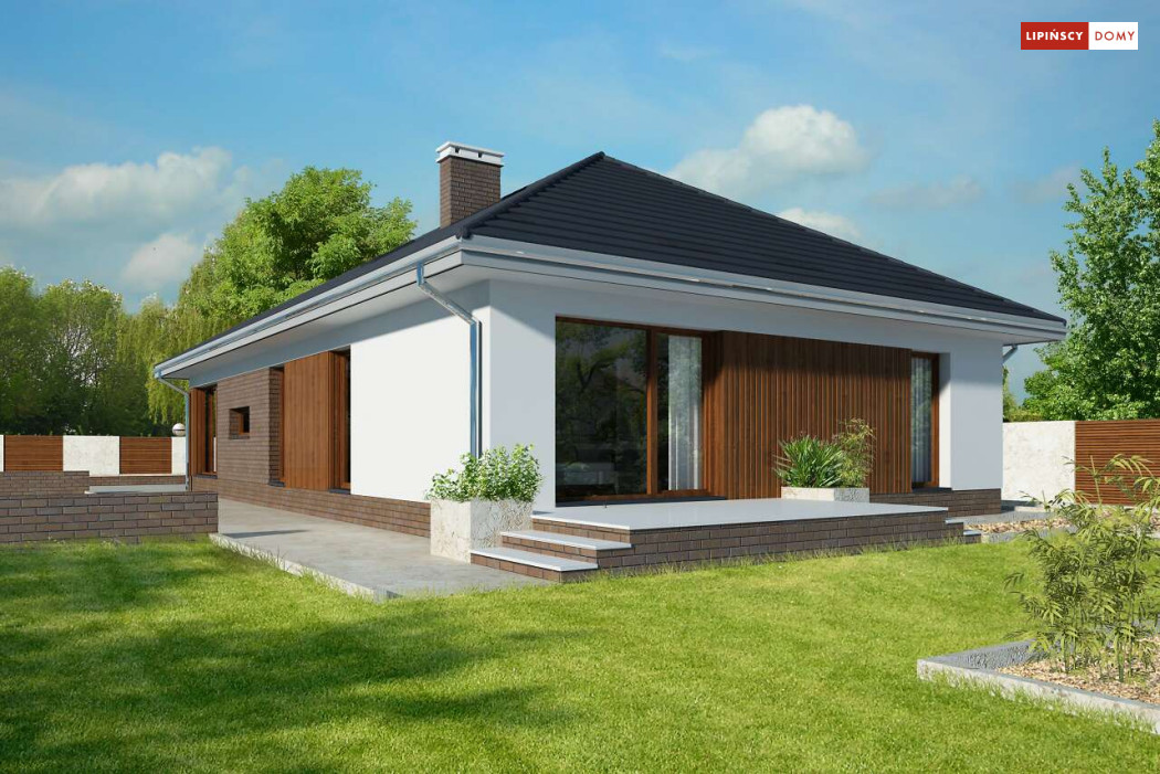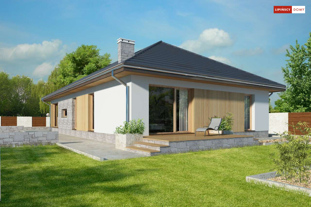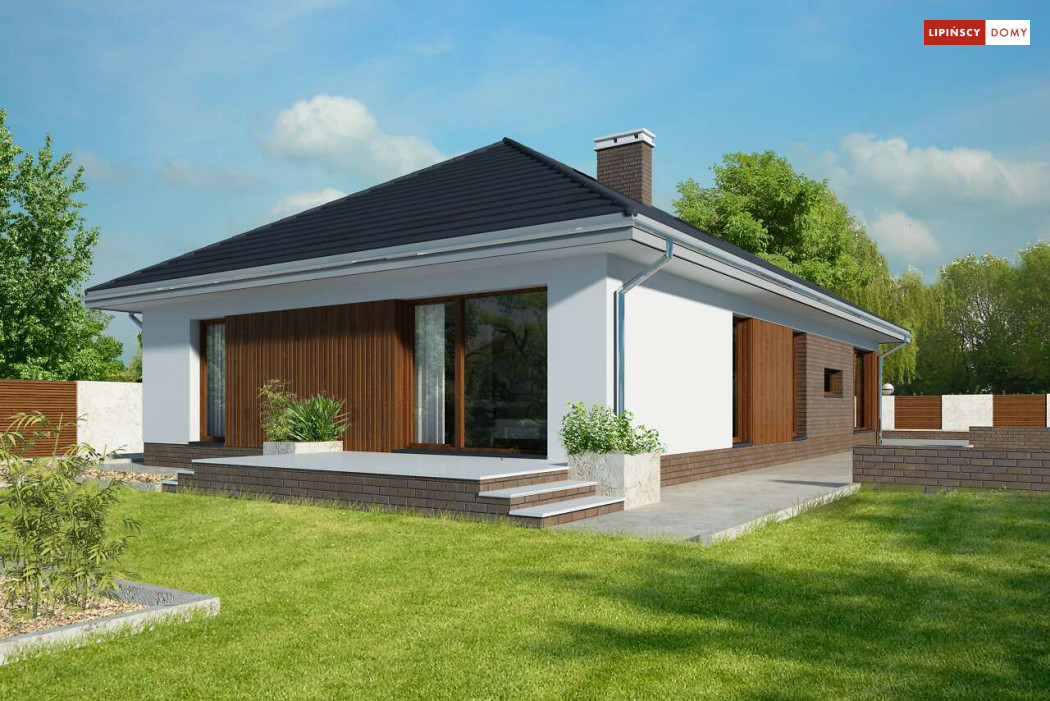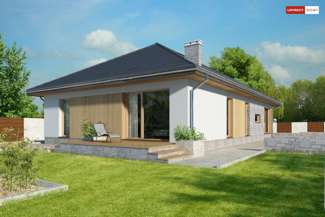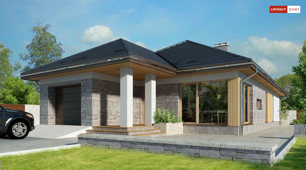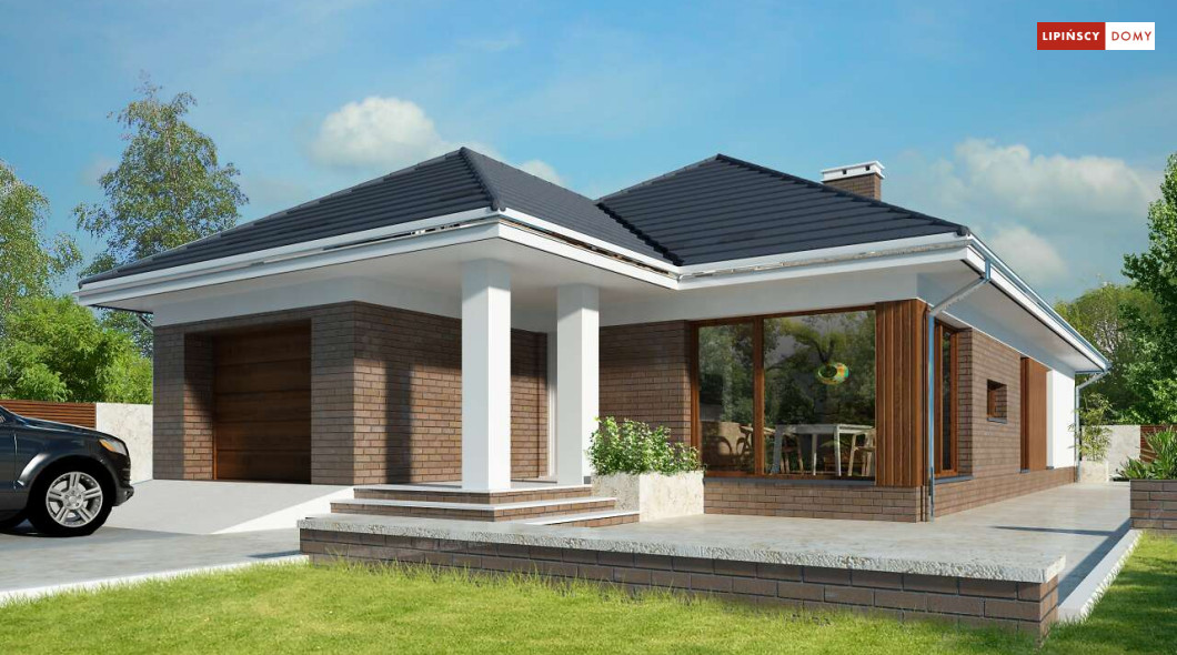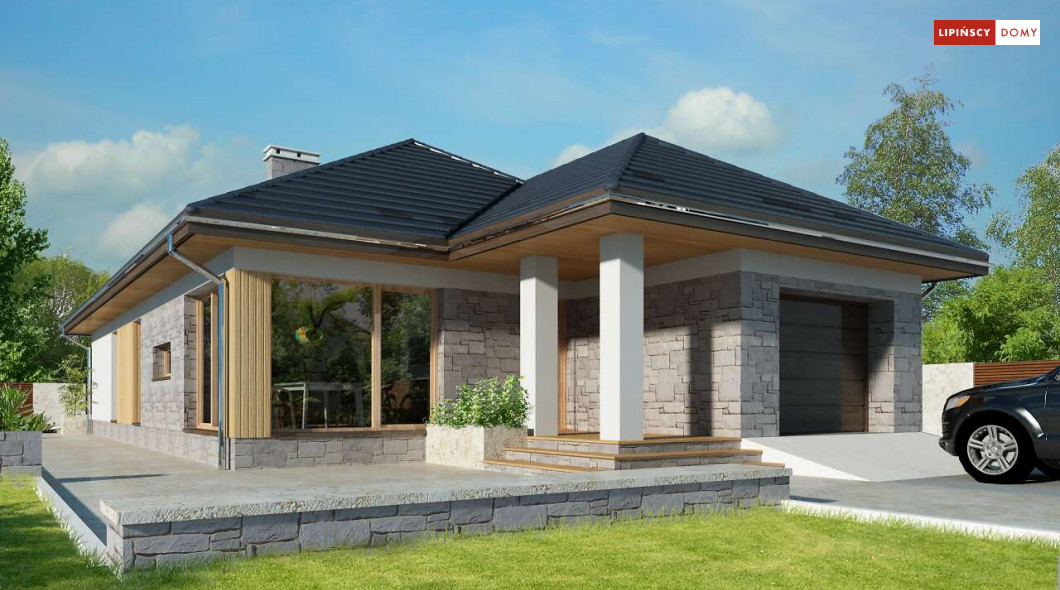 Wygodny dom parterowy, w standardzie energooszczędnym. Dzięki frontowemu usytuowaniu wjazdu do garażu, dom można postawić na działce o niewielkiej szerokości. Centrum domu stanowi duży salon, graniczący z obszerną kuchnią z wyspą, obok której – w ciekawie zaaranżowanej przestrzeni - stworzono kącik jadalniany. Część prywatna domu to trzy sypialnie, jedna z własną łazienką i garderobą. Dla wygody mieszkańców zaprojektowano osobną pralnię, gdzie umieszczony został kocioł gazowy. W projekcie przewidziano ogrzewanie kotłem na gaz. Możliwa jest zmiana ogrzewania na pompę ciepła.