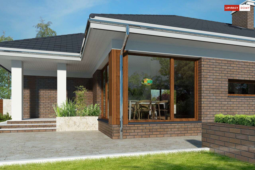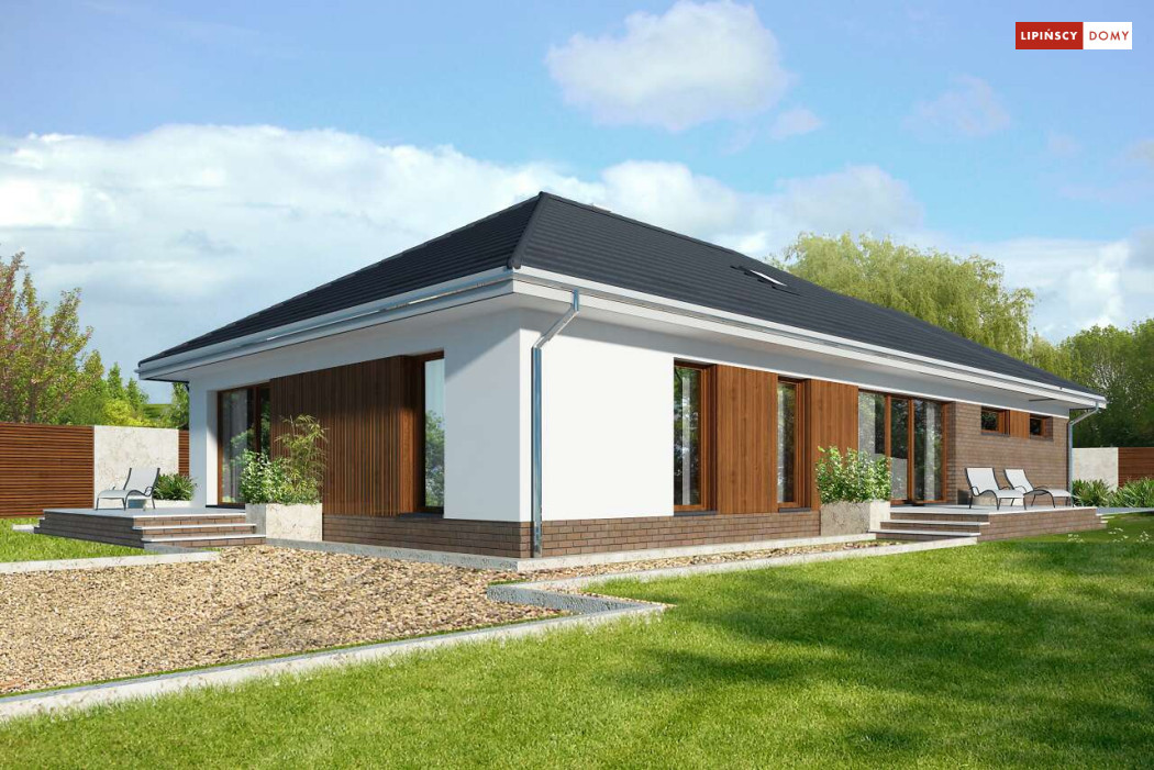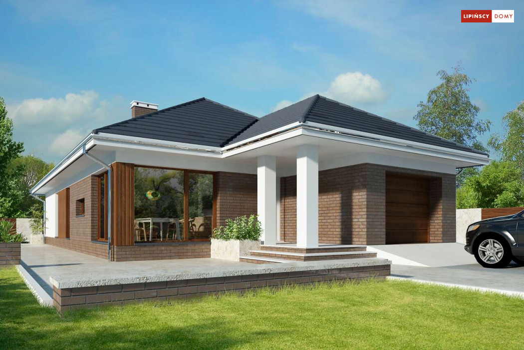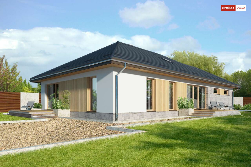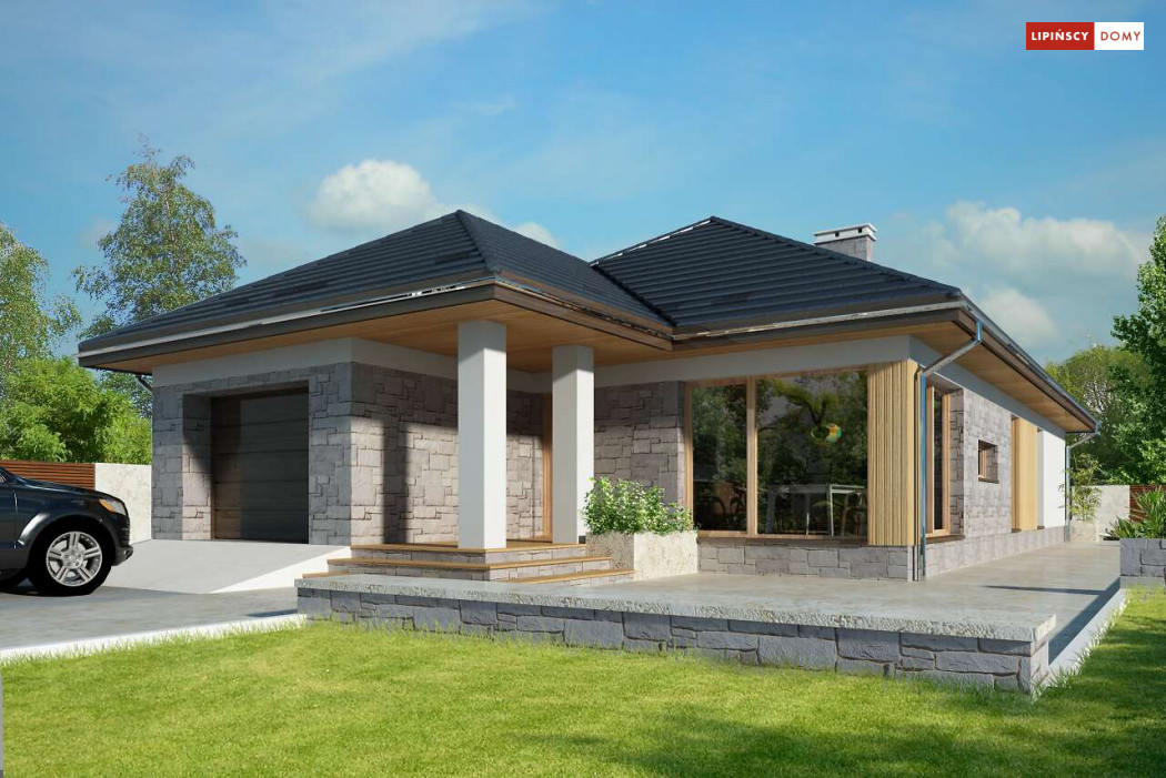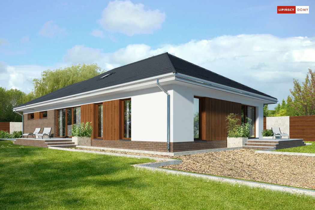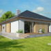 Wygodny dom parterowy, w standardzie energooszczędnym. Dzięki frontowemu usytuowaniu wjazdu do garażu, dom można postawić na działce o niewielkiej szerokości. Centrum domu stanowi duży salon, graniczący z obszerną kuchnią z wyspą, obok której – w ciekawie zaaranżowanej przestrzeni - stworzono kącik jadalniany. Część prywatna domu to trzy sypialnie, jedna z własną łazienką i garderobą. Dla wygody mieszkańców zaprojektowano osobną pralnię, gdzie umieszczony został kocioł gazowy. W projekcie przewidziano ogrzewanie kotłem na gaz. Możliwa jest zmiana ogrzewania na pompę ciepła.