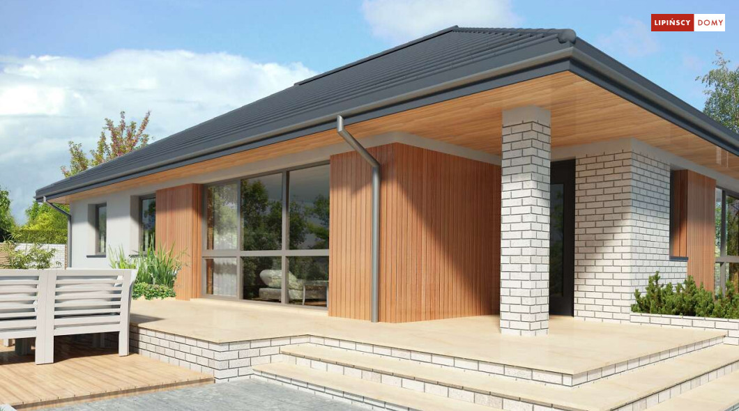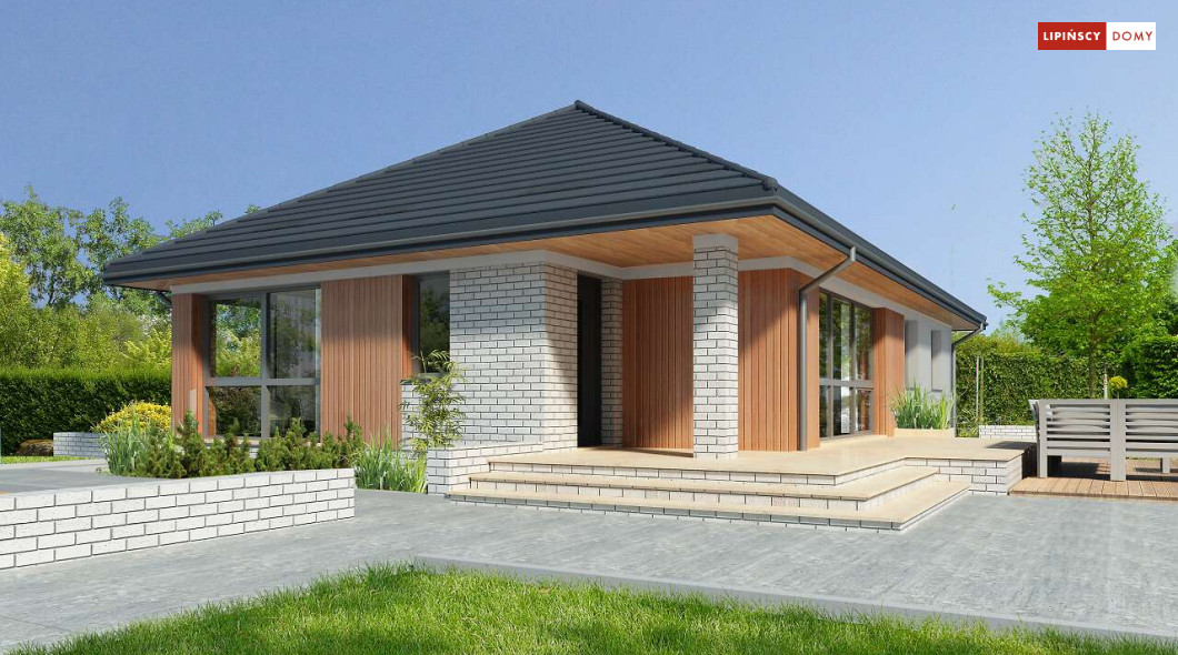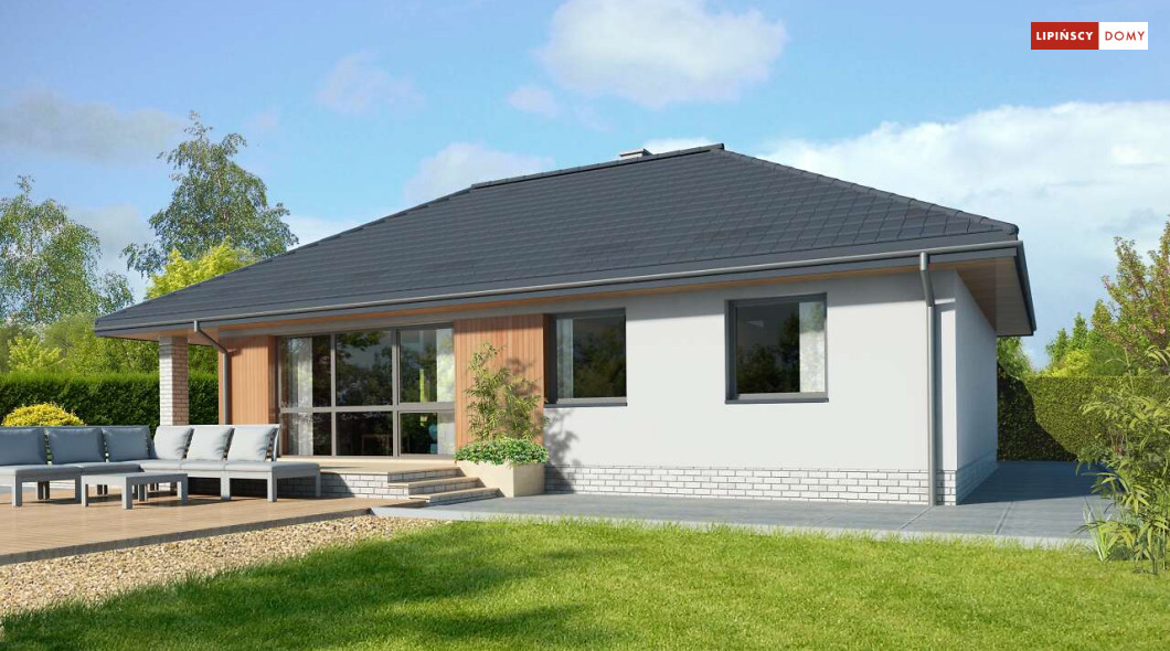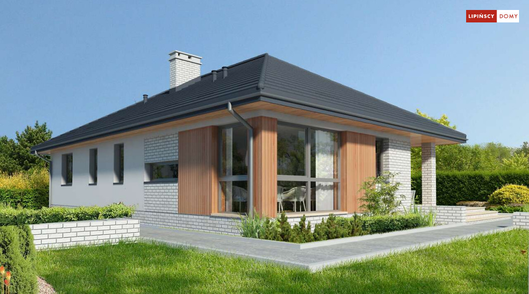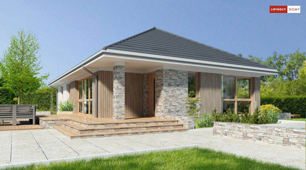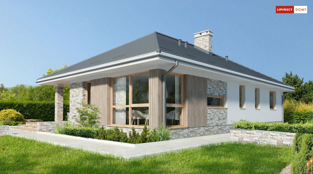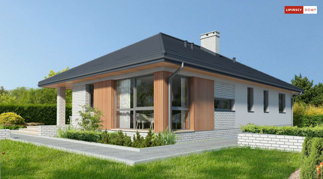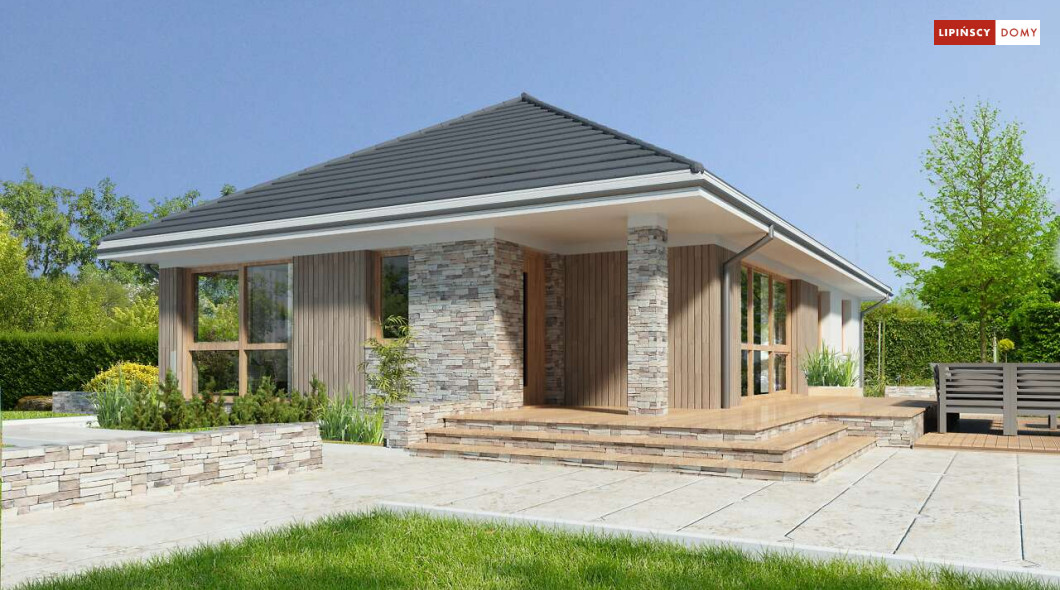 Niewielki dom parterowy z wejściem od strony szczytowej, co pozwala zlokalizować go na wąskiej działce. Do części dziennej należy duży salon, z wydzielonym miejscem do pracy. Obok salonu znajduje się kuchnia z wyspą i kącik z jadalnią. Przy kuchni jest kotłownia z gazowym kotłem grzewczym. Pomieszczenie to może również służyć jako spiżarnia lub pralnia. W części wspólnej zaplanowano również osobną toaletę. W części prywatnej znajdują się trzy sypialnie oraz wygodna, doświetlona oknem łazienka. Atutem domu jest prosta i elegancka bryła. Możliwa jest zmiana ogrzewania na pompę ciepła.