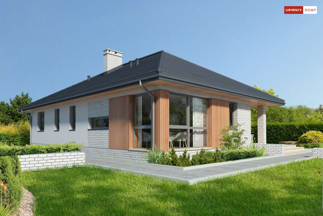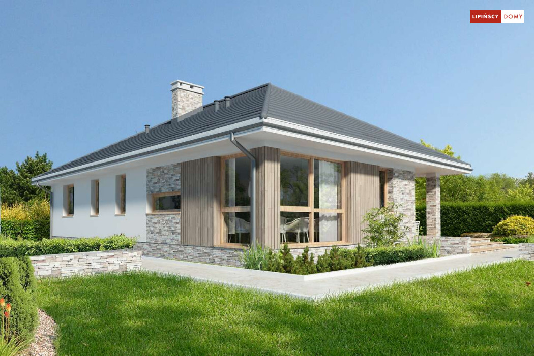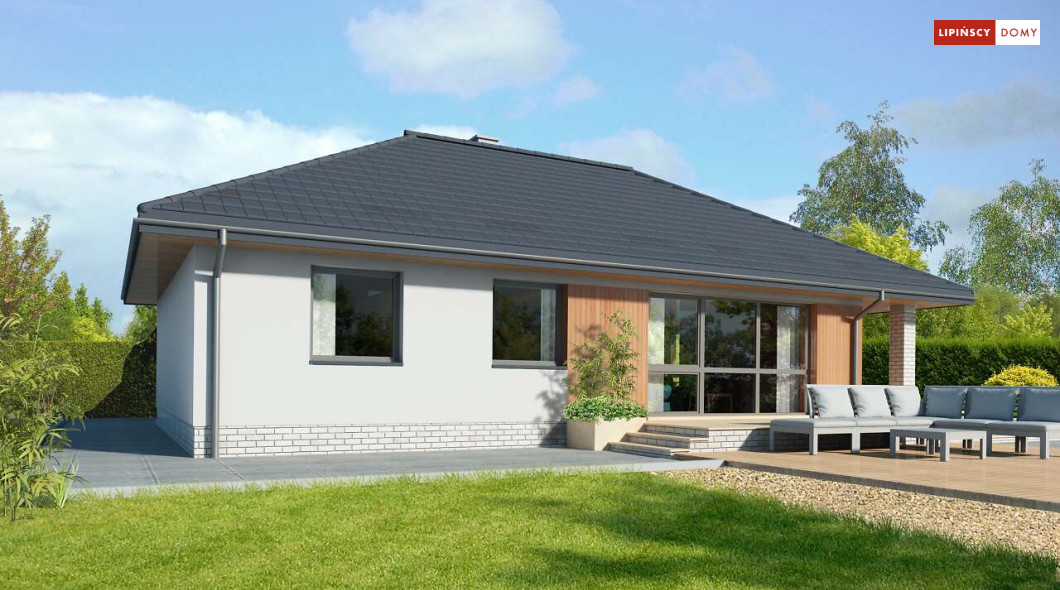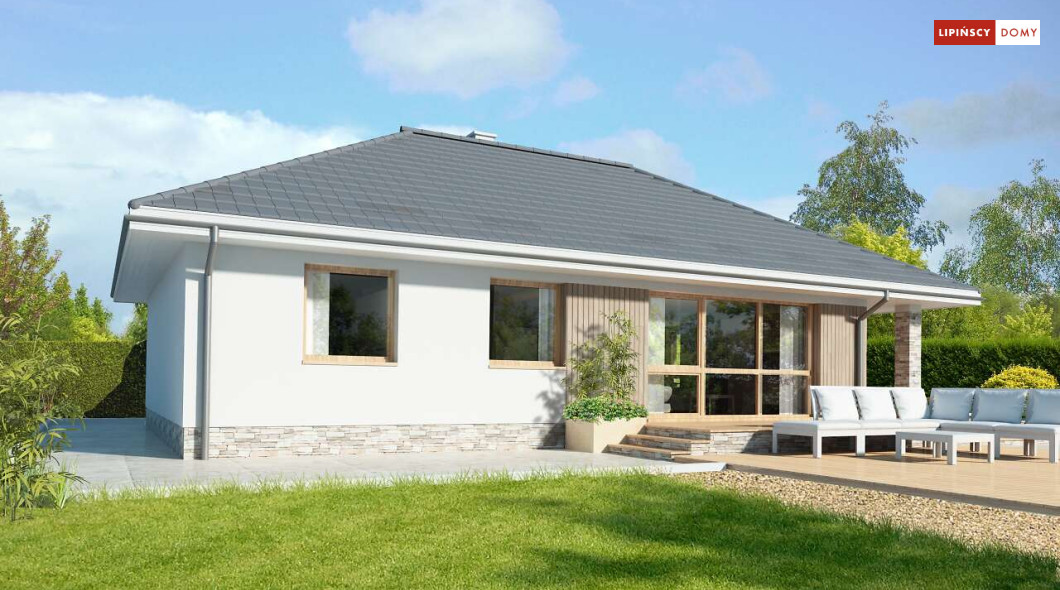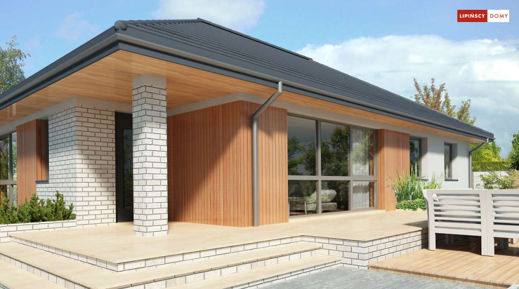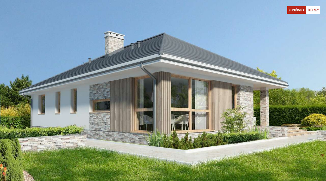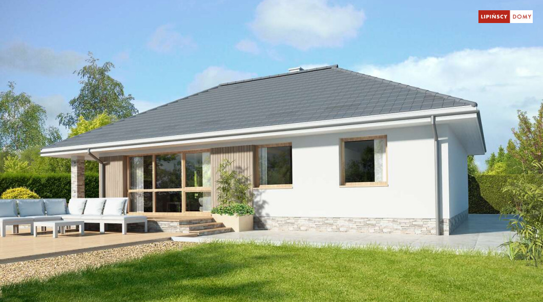 Niewielki dom parterowy z wejściem od strony szczytowej, co pozwala zlokalizować go na wąskiej działce. Do części dziennej należy duży salon, z wydzielonym miejscem do pracy. Obok salonu znajduje się kuchnia z wyspą i kącik z jadalnią. Przy kuchni jest kotłownia z gazowym kotłem grzewczym. Pomieszczenie to może również służyć jako spiżarnia lub pralnia. W części wspólnej zaplanowano również osobną toaletę. W części prywatnej znajdują się trzy sypialnie oraz wygodna, doświetlona oknem łazienka. Atutem domu jest prosta i elegancka bryła. Możliwa jest zmiana ogrzewania na pompę ciepła.