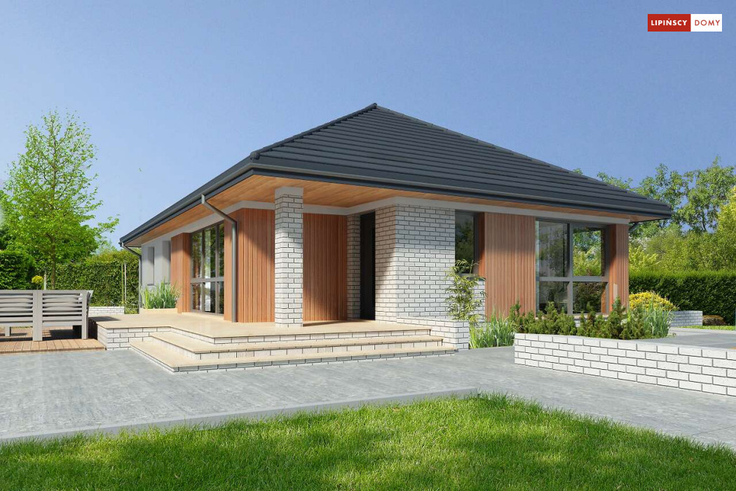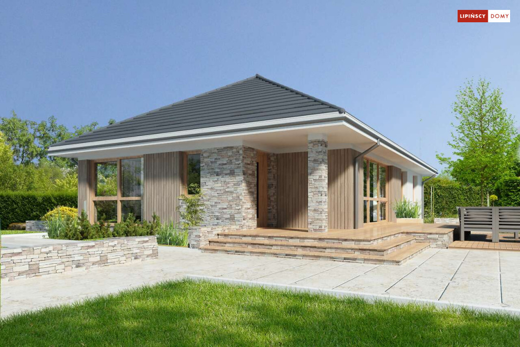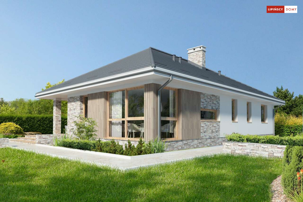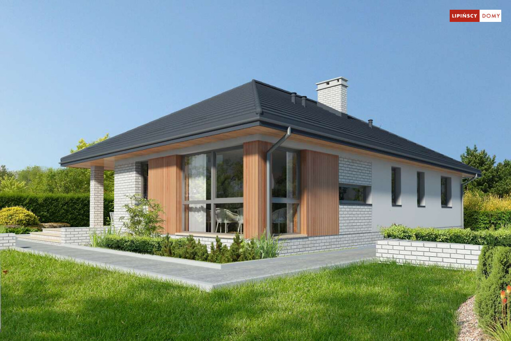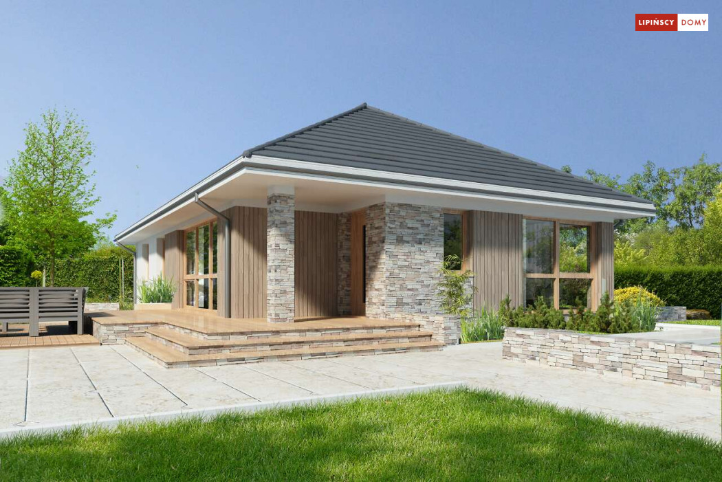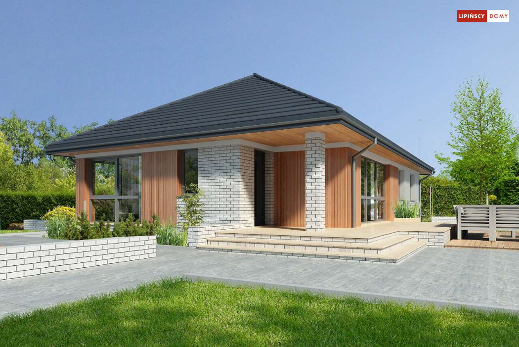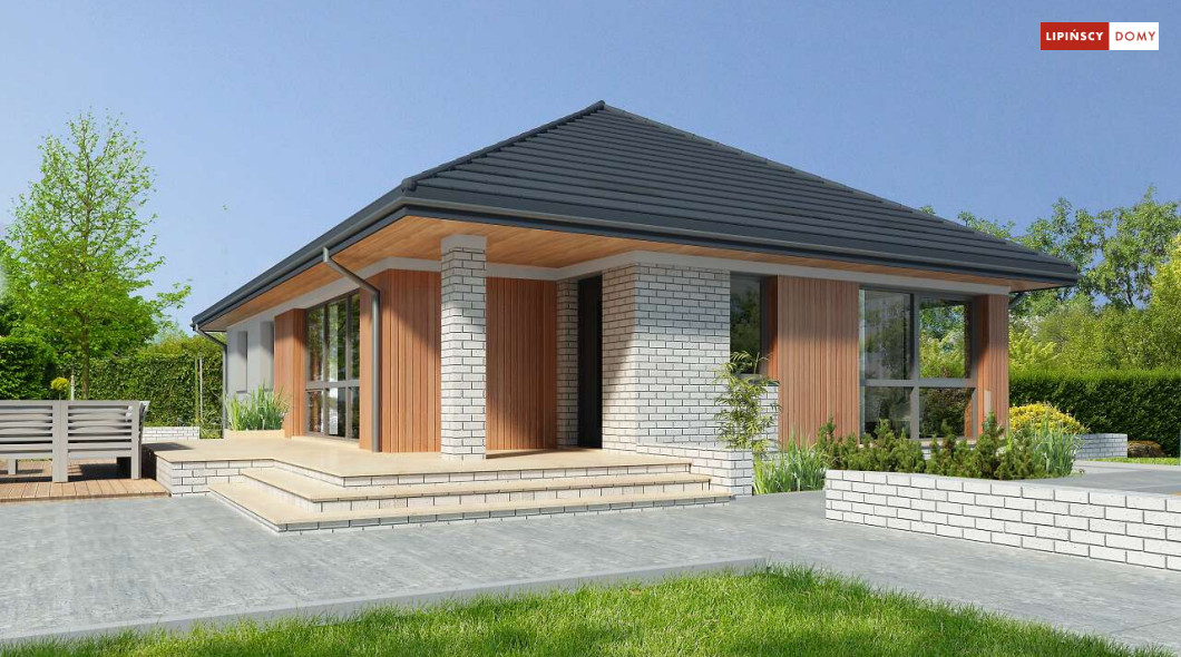 Niewielki dom parterowy z wejściem od strony szczytowej, co pozwala zlokalizować go na wąskiej działce. Do części dziennej należy duży salon, z wydzielonym miejscem do pracy. Obok salonu znajduje się kuchnia z wyspą i kącik z jadalnią. Przy kuchni jest kotłownia z gazowym kotłem grzewczym. Pomieszczenie to może również służyć jako spiżarnia lub pralnia. W części wspólnej zaplanowano również osobną toaletę. W części prywatnej znajdują się trzy sypialnie oraz wygodna, doświetlona oknem łazienka. Atutem domu jest prosta i elegancka bryła. Możliwa jest zmiana ogrzewania na pompę ciepła.
