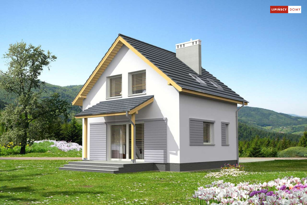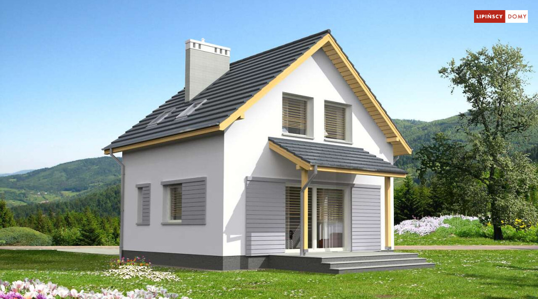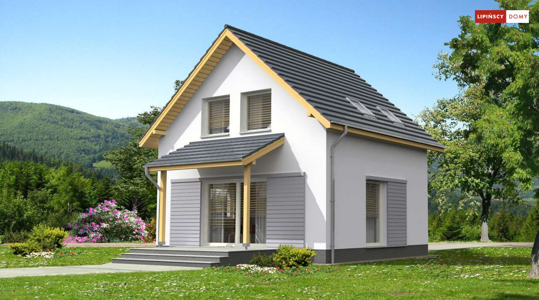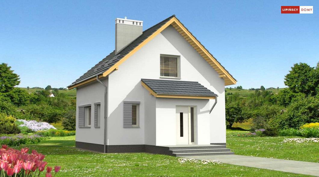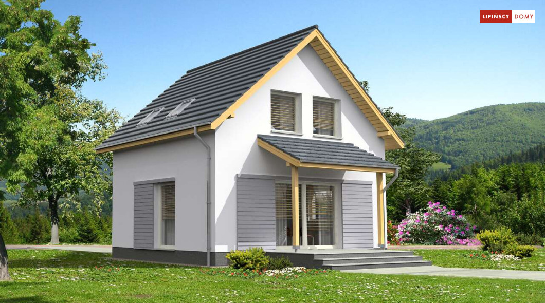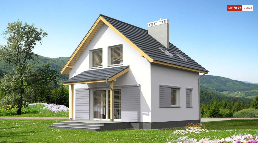 Niewielki, kompaktowy domek z użytkowym poddaszem i powierzchnią zabudowy poniżej 70 mkw, pozwalający wybudować go na zgłoszenie. Dzięki wejściu od szczytu, można go zbudować na niezbyt szerokiej działce. Prosta bryła na bazie kwadratu pozwala na funkcjonalne rozplanowanie przestrzeni, a dwuspadowy dach wpływa na to, że dom jest niedrogi w realizacji. Na parterze zaplanowano salon z jadalnią i aneksem kuchennym i łazienkę. Poddasze to dwie ustawne sypialnie i jeszcze jedna łazienka, z wygodną wanną i prysznicem. Od strony ogrodowej znajduje się częściowo zadaszony taras, na który można wyjść przez duże przeszkolone drzwi z salonu. Bryłę zdobią drewniane oraz klinkierowe elementy elewacyjne. To idealna propozycja dla osób szukających domu niewielkiego i taniego. W projekcie przewidziano ogrzewanie kotłem na gaz. Możliwa jest zmiana ogrzewania na pompę ciepła.