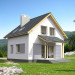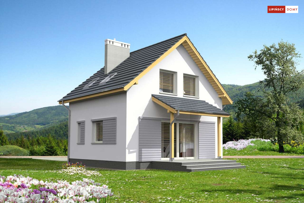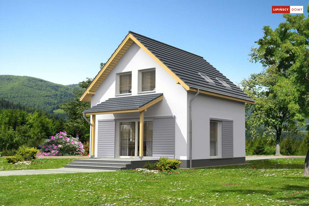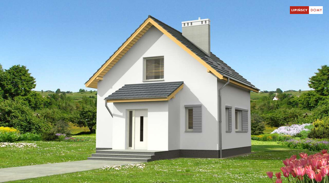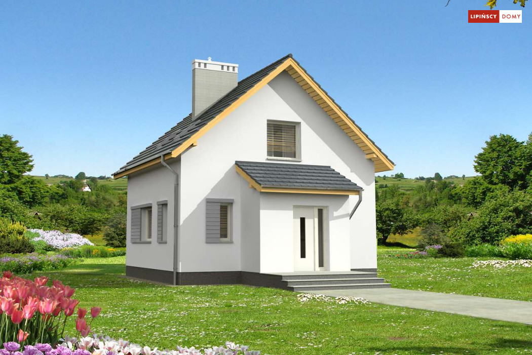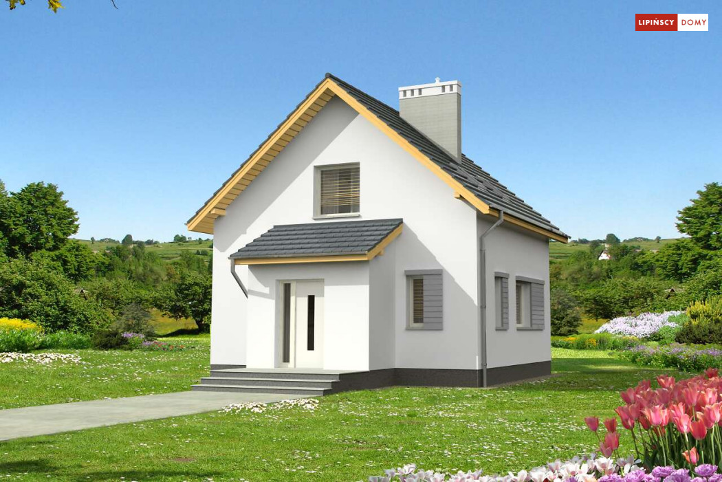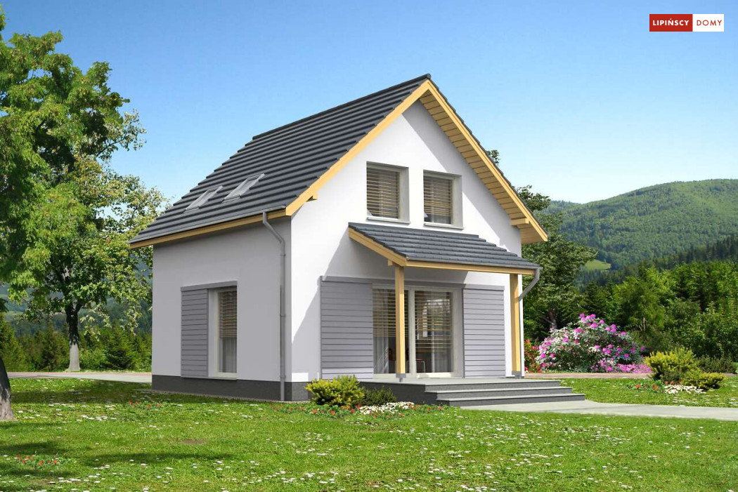 Niewielki, kompaktowy domek z użytkowym poddaszem i powierzchnią zabudowy poniżej 70 mkw, pozwalający wybudować go na zgłoszenie. Dzięki wejściu od szczytu, można go zbudować na niezbyt szerokiej działce. Prosta bryła na bazie kwadratu pozwala na funkcjonalne rozplanowanie przestrzeni, a dwuspadowy dach wpływa na to, że dom jest niedrogi w realizacji. Na parterze zaplanowano salon z jadalnią i aneksem kuchennym i łazienkę. Poddasze to dwie ustawne sypialnie i jeszcze jedna łazienka, z wygodną wanną i prysznicem. Od strony ogrodowej znajduje się częściowo zadaszony taras, na który można wyjść przez duże przeszkolone drzwi z salonu. Bryłę zdobią drewniane oraz klinkierowe elementy elewacyjne. To idealna propozycja dla osób szukających domu niewielkiego i taniego. W projekcie przewidziano ogrzewanie kotłem na gaz. Możliwa jest zmiana ogrzewania na pompę ciepła.