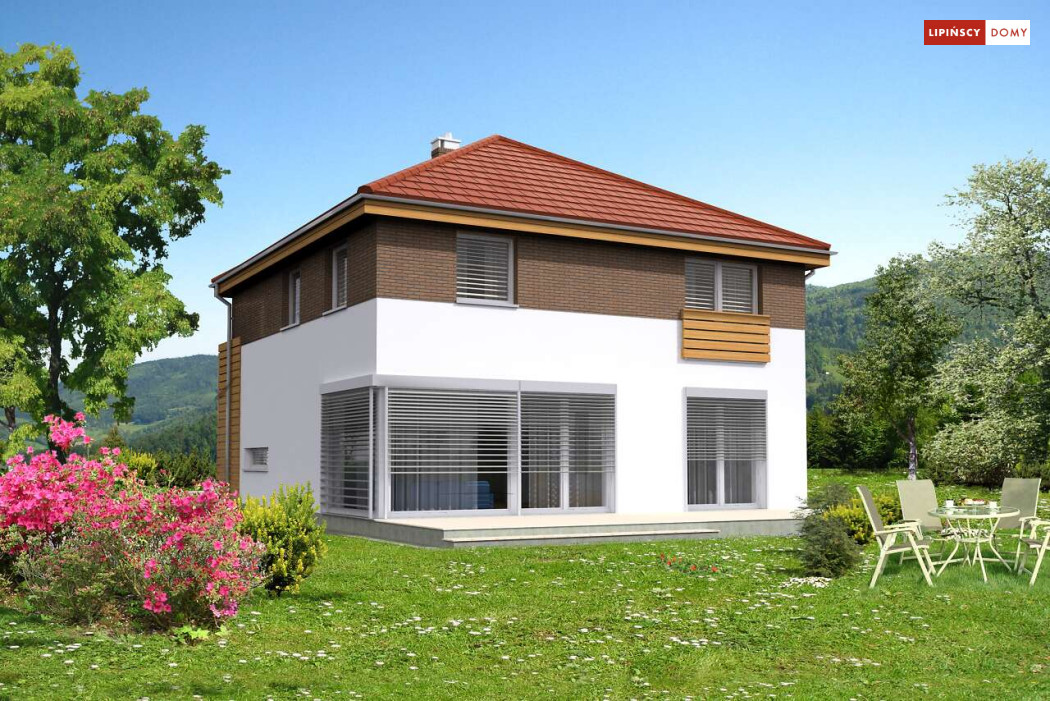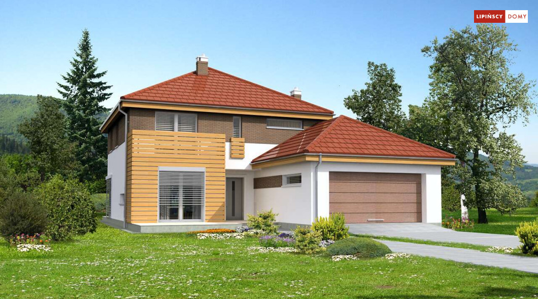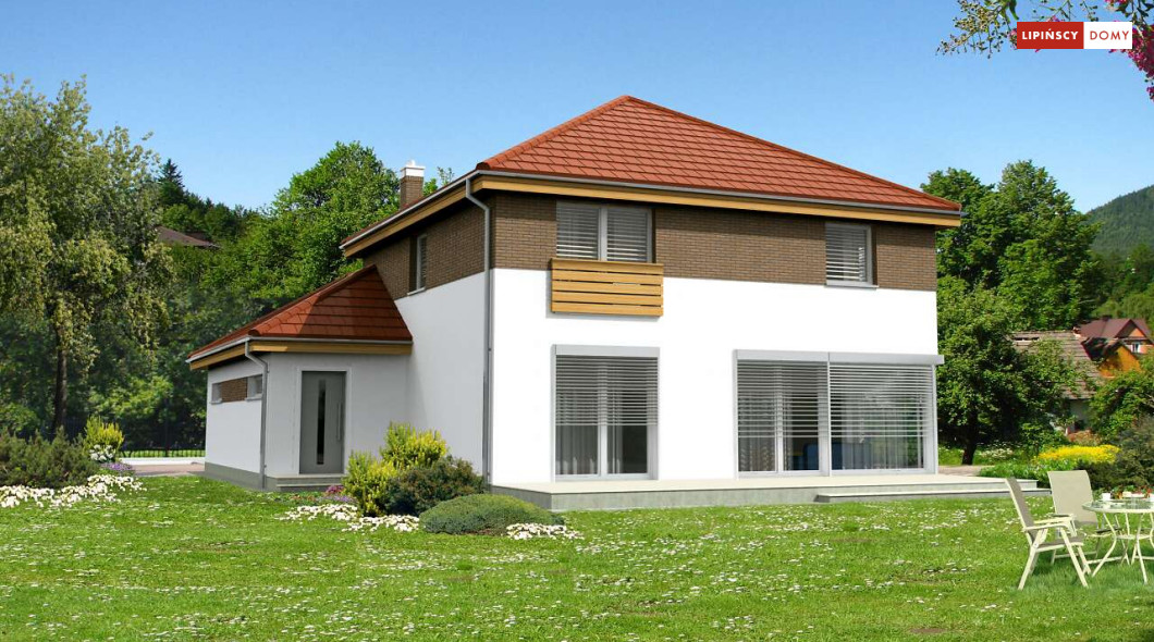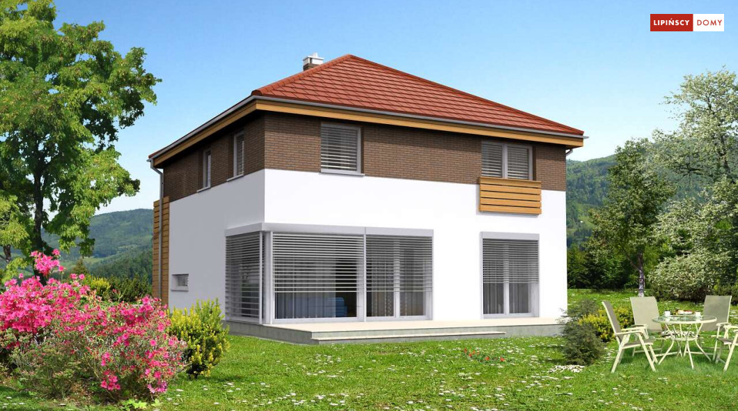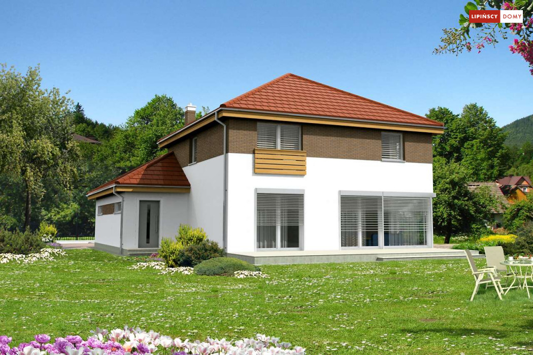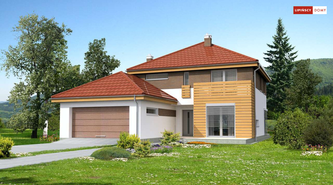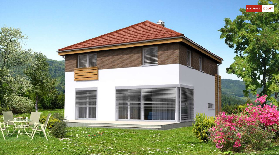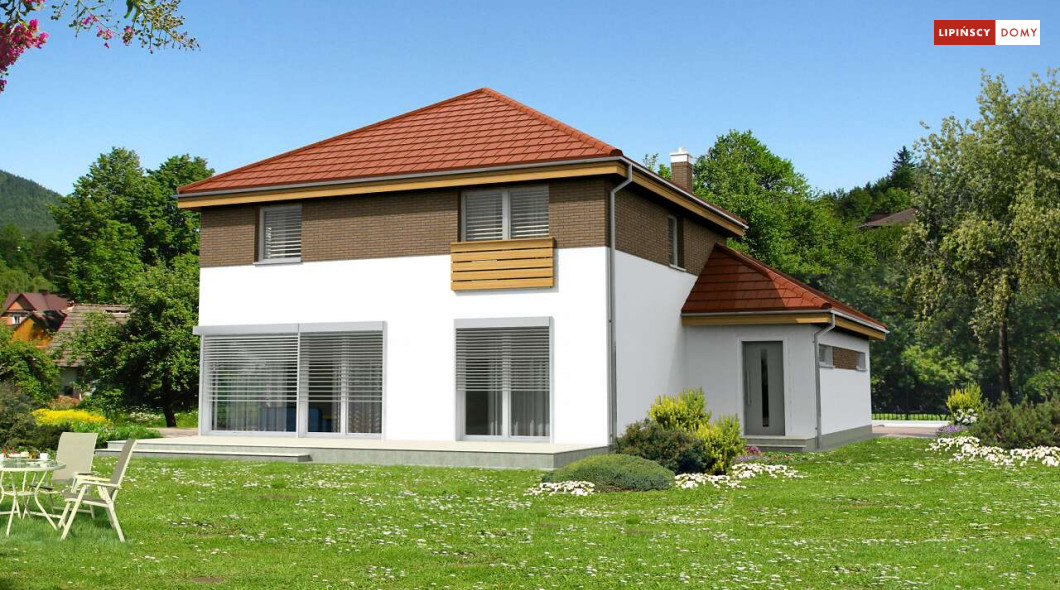 Wygodny dom energooszczędny, z kopertowym dachem, zaprojektowany w stylistyce podmiejskiej willi, z dwustanowiskowym garażem wpisanym w bryłę budynku. Na parterze znajduje się duża, komfortowa kuchnia z miejscem na rodzinny stół oraz przytulny salon z kominkiem. Jest tu także dodatkowy pokój – gabinet lub sypialnia dla gości oraz łazienka i pomieszczenie gospodarcze. Druga kondygnacja to wyraźnie wydzielona strefa prywatna, w której znajdują się trzy sypialnie, wygodna łazienka oraz pralnia. Dom jest dobrą propozycją dla dużej rodziny szukającej komfortowego, energooszczędnego lokum.