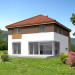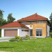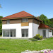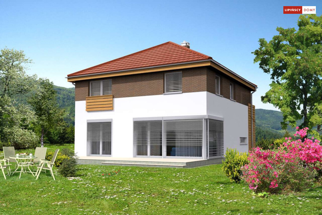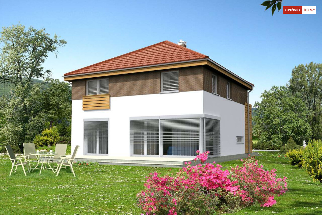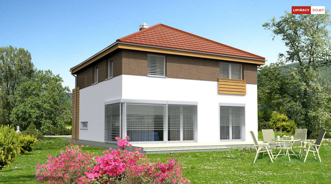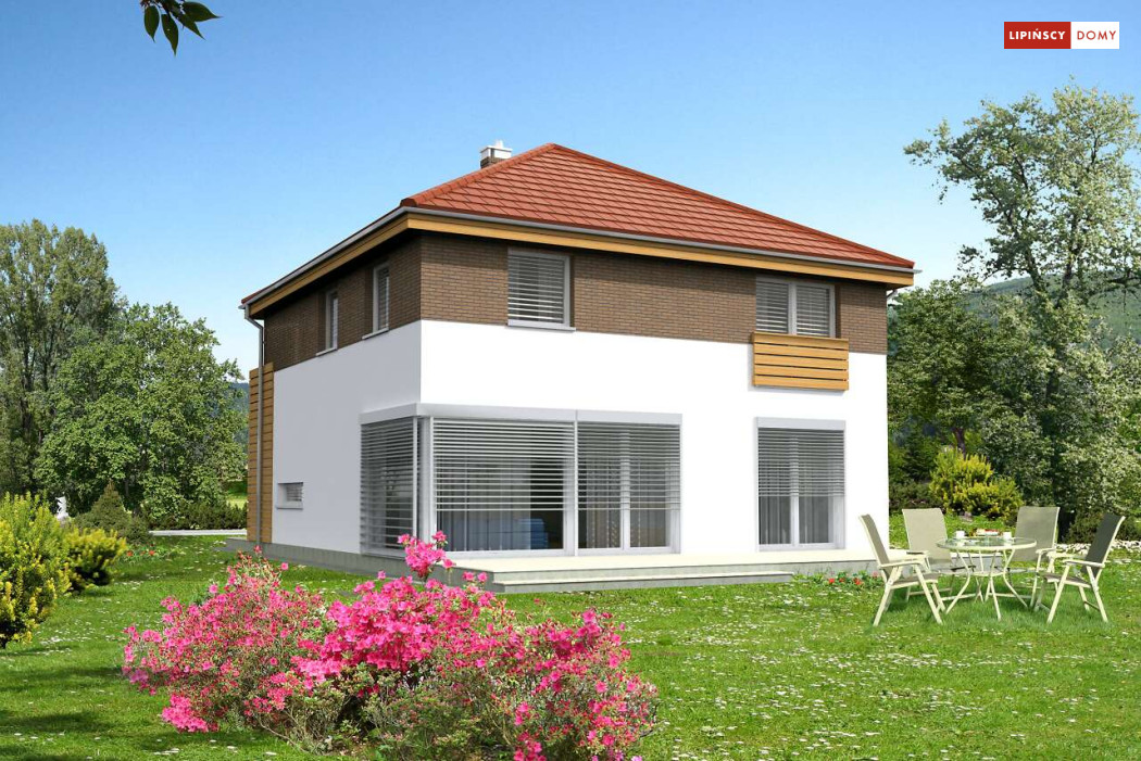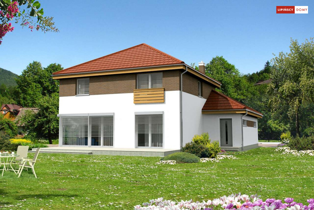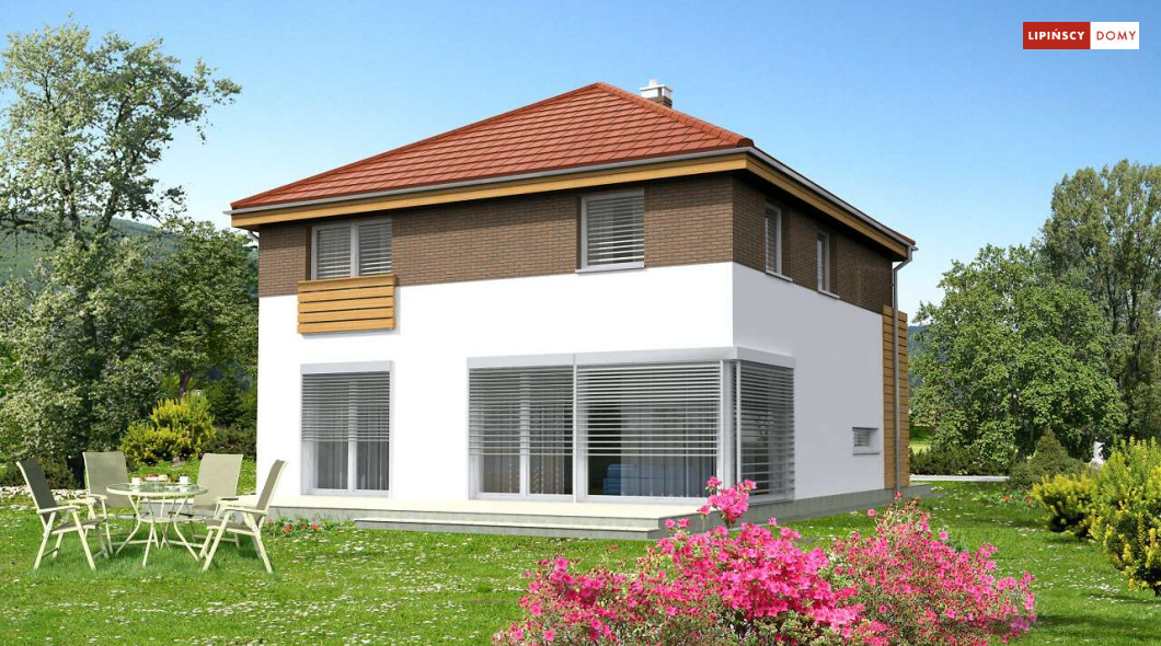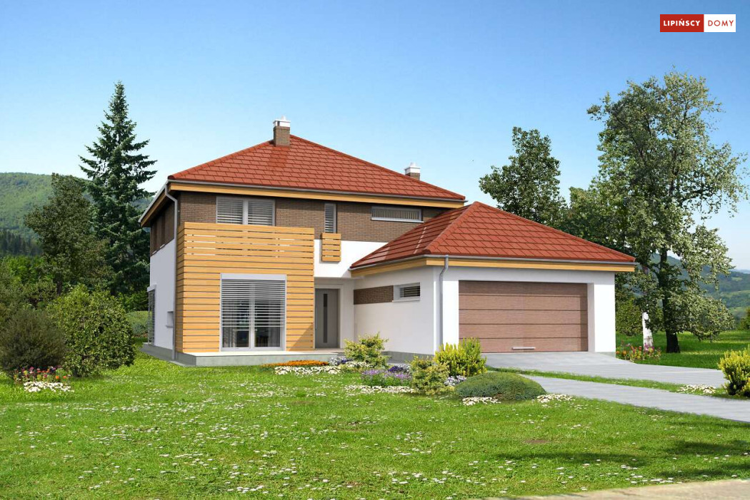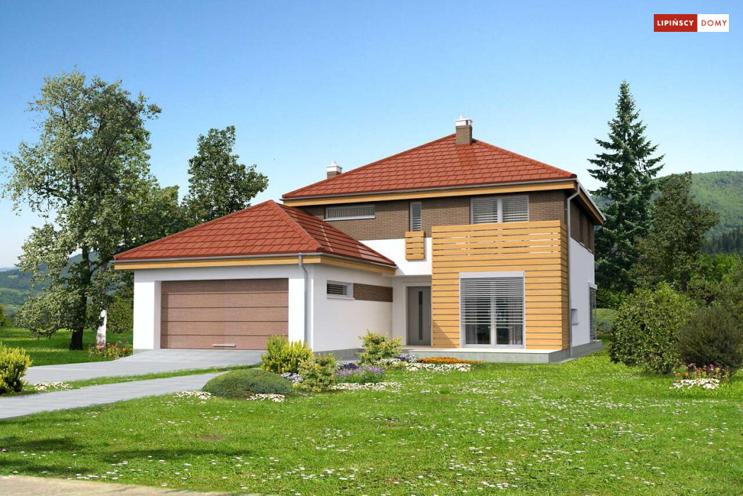 Wygodny dom energooszczędny, z kopertowym dachem, zaprojektowany w stylistyce podmiejskiej willi, z dwustanowiskowym garażem wpisanym w bryłę budynku. Na parterze znajduje się duża, komfortowa kuchnia z miejscem na rodzinny stół oraz przytulny salon z kominkiem. Jest tu także dodatkowy pokój – gabinet lub sypialnia dla gości oraz łazienka i pomieszczenie gospodarcze. Druga kondygnacja to wyraźnie wydzielona strefa prywatna, w której znajdują się trzy sypialnie, wygodna łazienka oraz pralnia. Dom jest dobrą propozycją dla dużej rodziny szukającej komfortowego, energooszczędnego lokum.