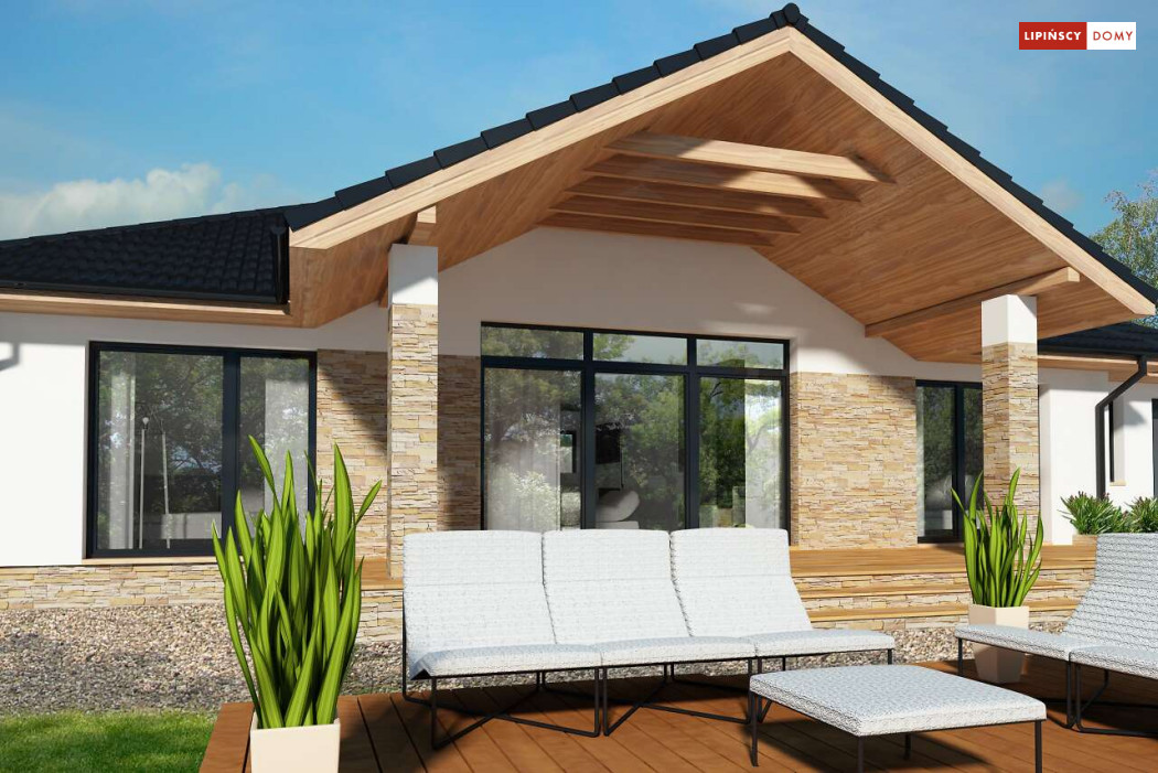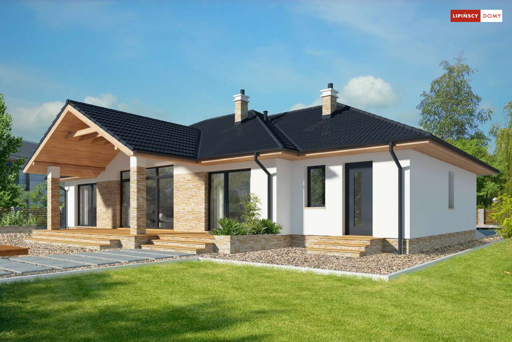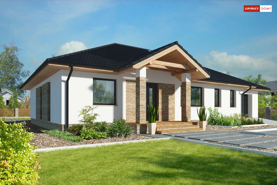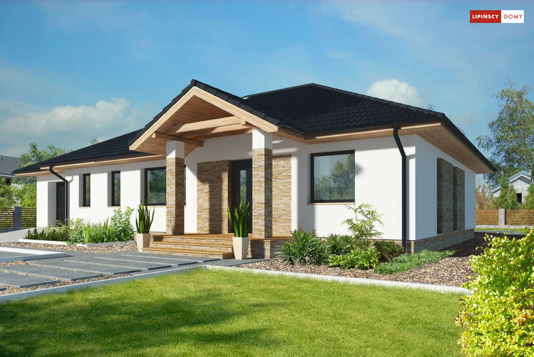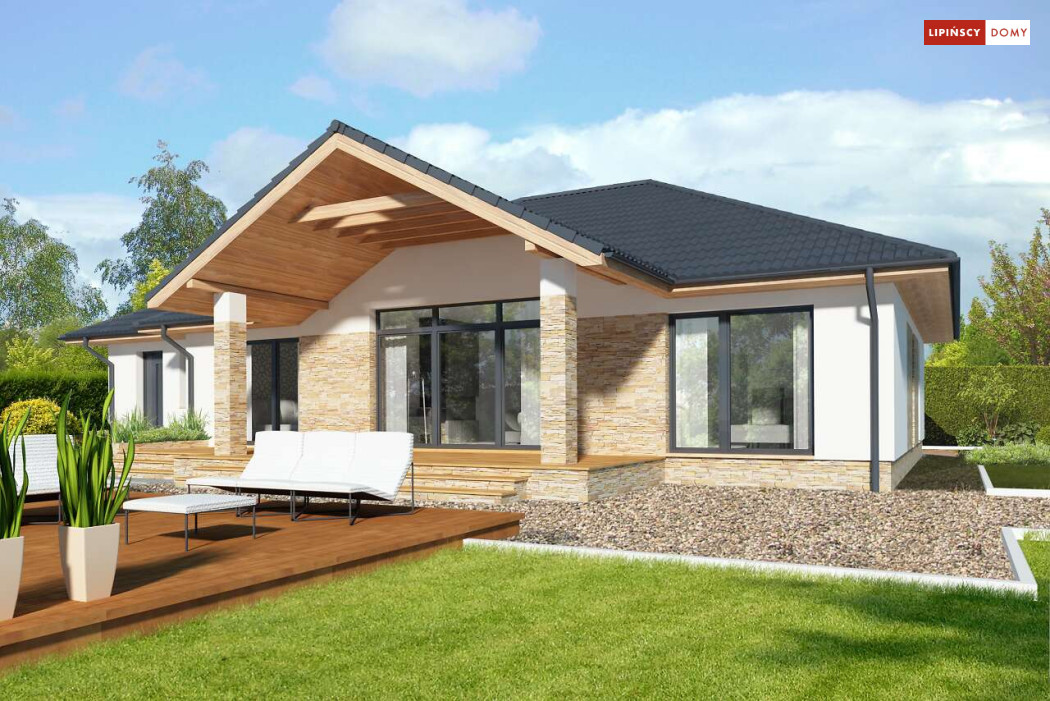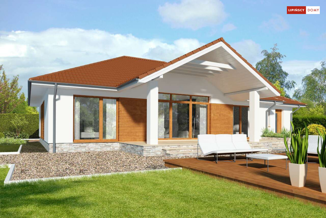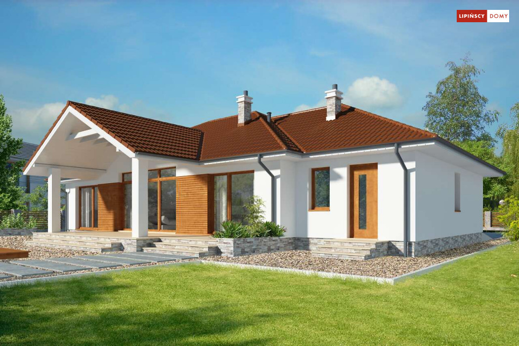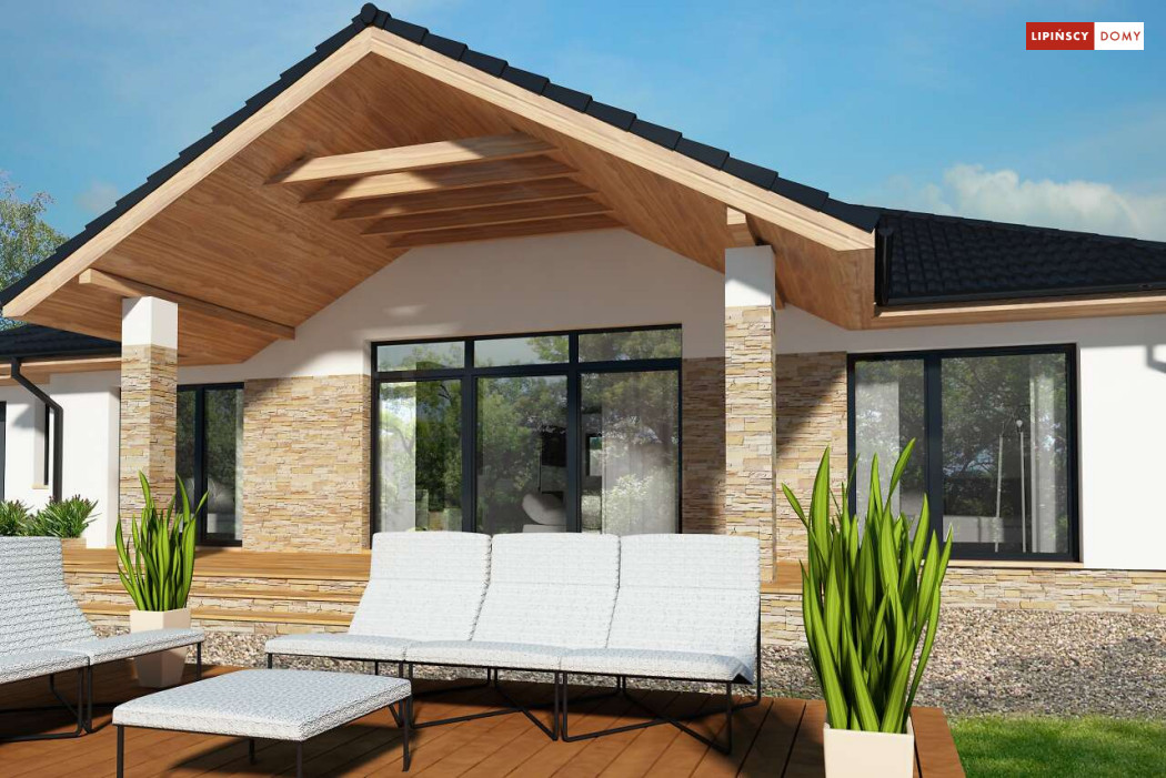 Piękny, parterowy dom energooszczędny, w którym główny nacisk przy projektowaniu położono na wygodę mieszkańców – wnętrze rozplanowane więc zostało z najwyższą starannością i dbałością o szczegóły. Sercem domu jest piękny salon z kominkiem, z którego można wyjść na zadaszony taras. W jednym ciągu komunikacyjnym z salonem zaplanowano jadalnię, a obok niej kuchnię. Można z niej przez pomieszczenie gospodarcze przejść do garażu. Za garażem znajduje się kotłownia, z niezależnym wejściem. Jedna ze stref prywatnych to duża sypialnia z własną łazienką i garderobą – idealne miejsce dla rodziców. Druga strefa to królestwo dzieci – dwie sypialnie i duża łazienka. W bryłę domu wpisany został garaż na 1 auto, który stanowi harmonijną całość z całym budynkiem. W projekcie przewidziano ogrzewanie kotłem na gaz. Możliwa jest zmiana ogrzewania na pompę ciepła.