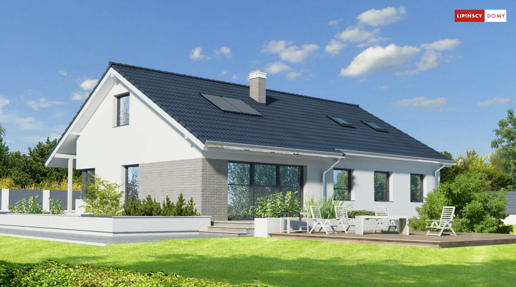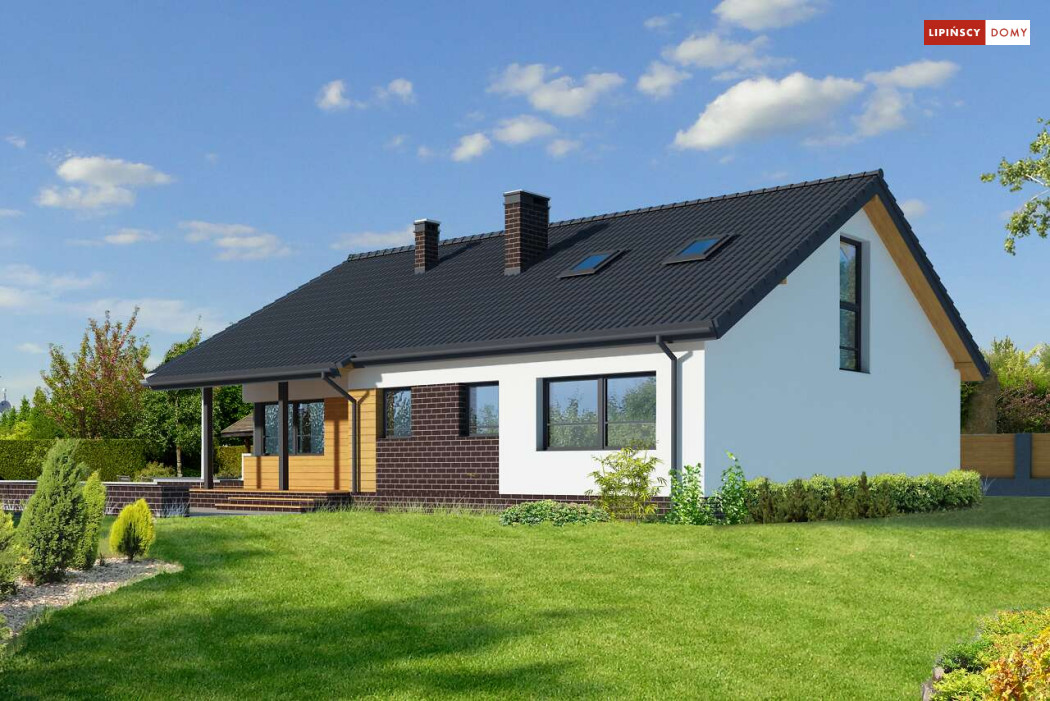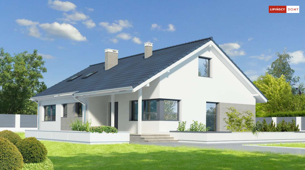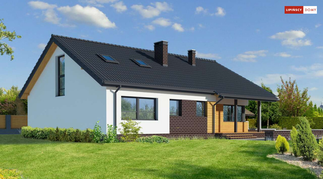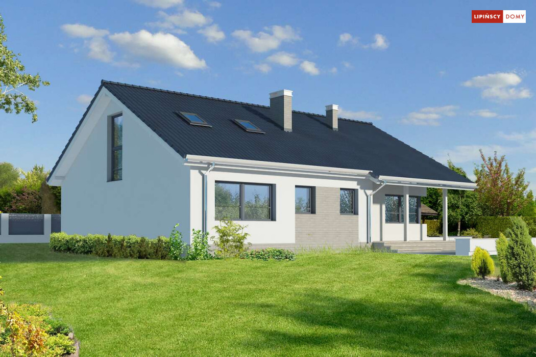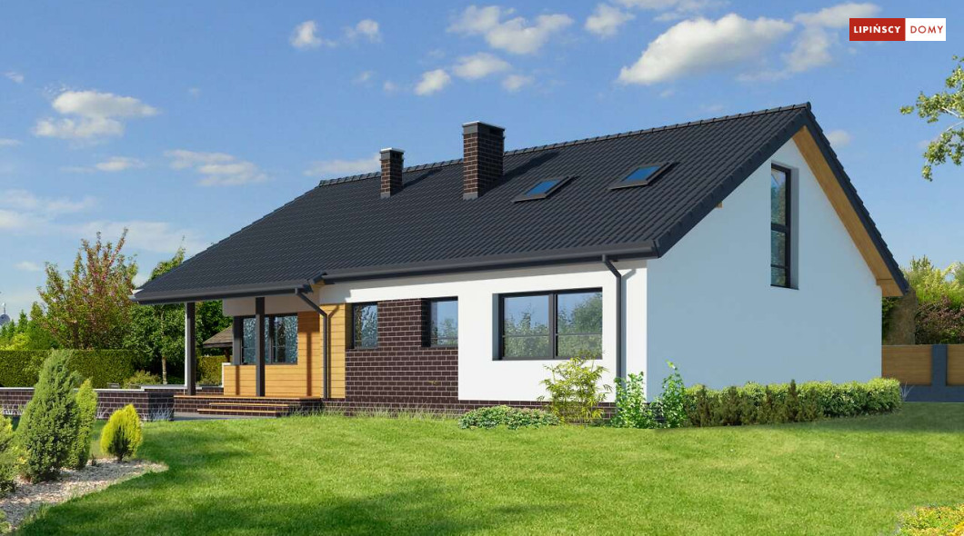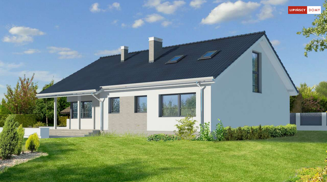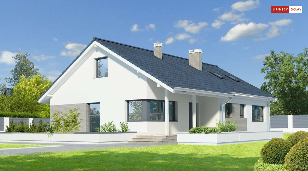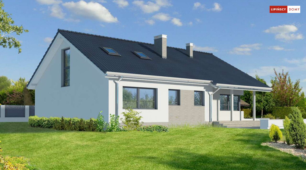 Prosty dom parterowy z dwuspadowym dachem, z możliwością wykorzystania poddasza, doskonały dla 4-5 osobowej rodziny. Dom przewidziano bez garażu, a zlokalizowanie od frontu części dziennej pozwala na zlokalizowanie go na działkach z wjazdem od południa. Parter został podzielony między strefę dzienną – duży salon z miejscem na rodzinny stół i otwartą na niego kuchnię, toaletę i pomieszczenie gospodarcze. Strefa prywatna to trzy mniejsze i jedna większa sypialnia oraz duża wspólna łazienka. Poddasze, o powierzchni niemal 60m² daje duże możliwości aranżacyjne i w zależności od potrzeb można je przeznaczyć na kącik wypoczynkowy, dodatkową sypialnię, czy studio. Uwagę zwraca zadaszone wejście oraz narożne okna. Prosta bryła i architektura sprawiają, że dom jest nieskomplikowany i niedrogi w budowie. W projekcie przewidziano ogrzewanie kotłem na gaz. Możliwa jest zmiana ogrzewania na pompę ciepła.