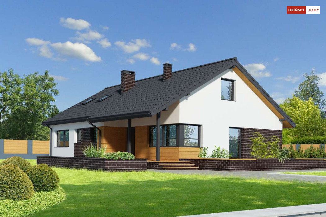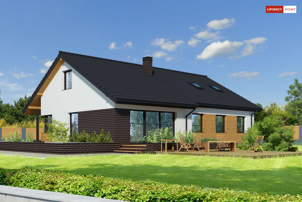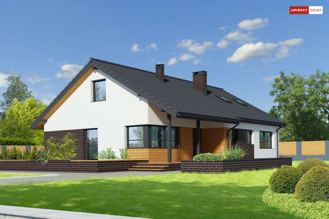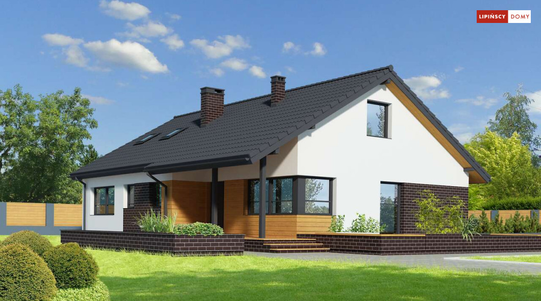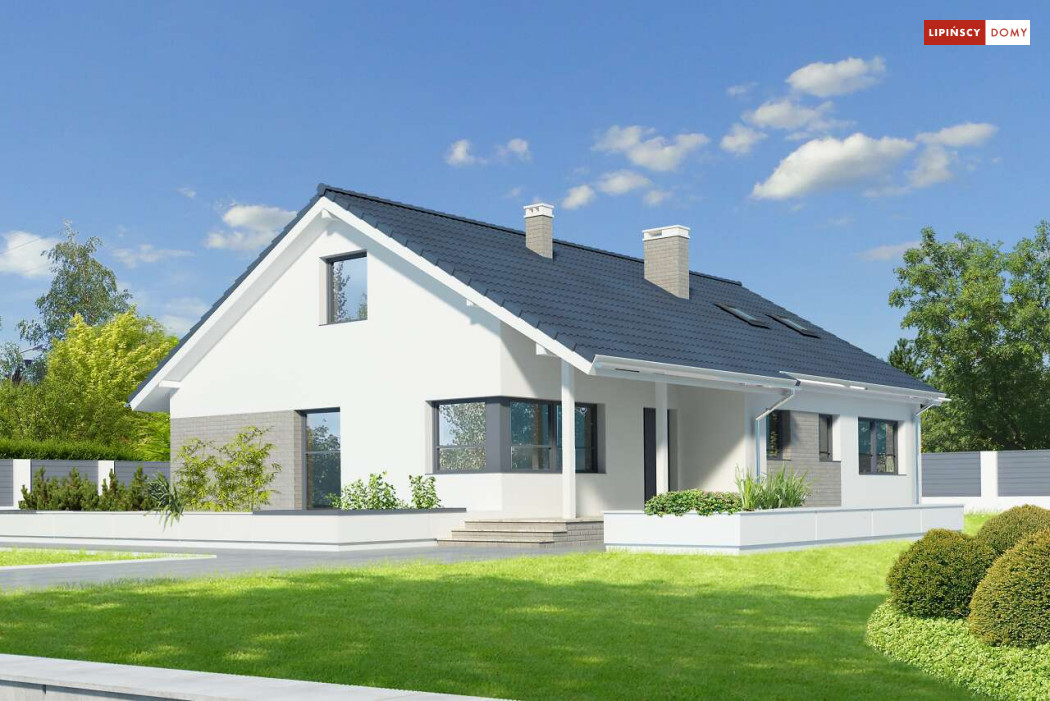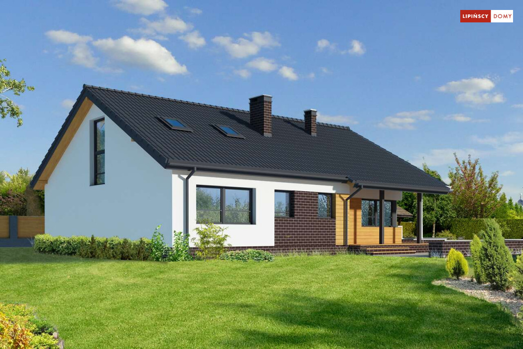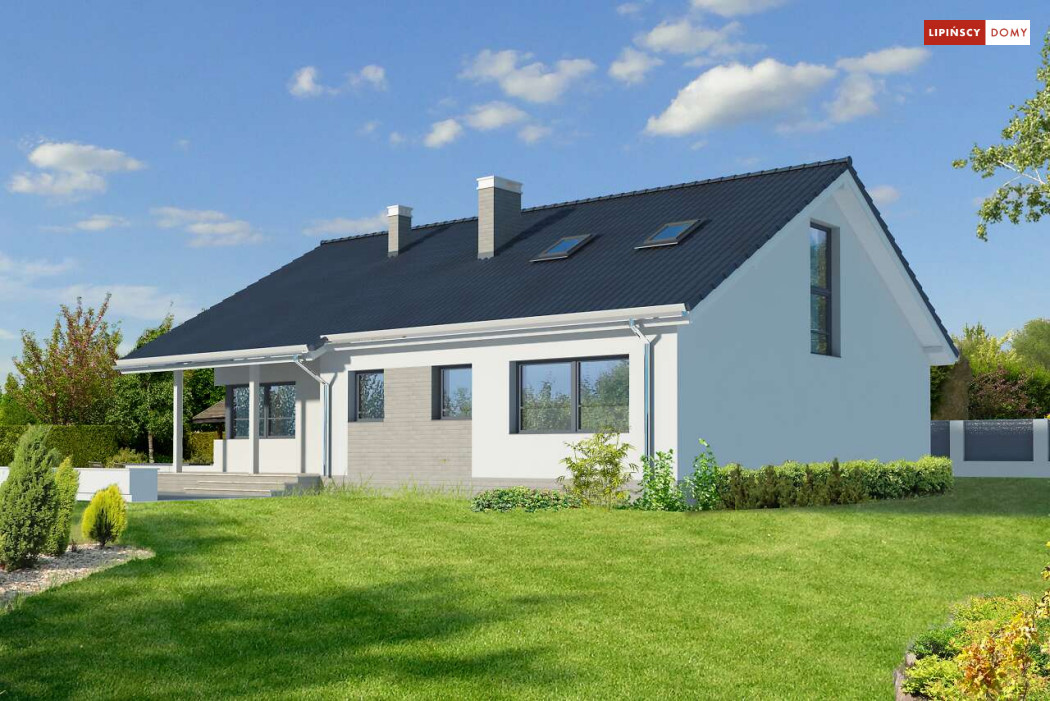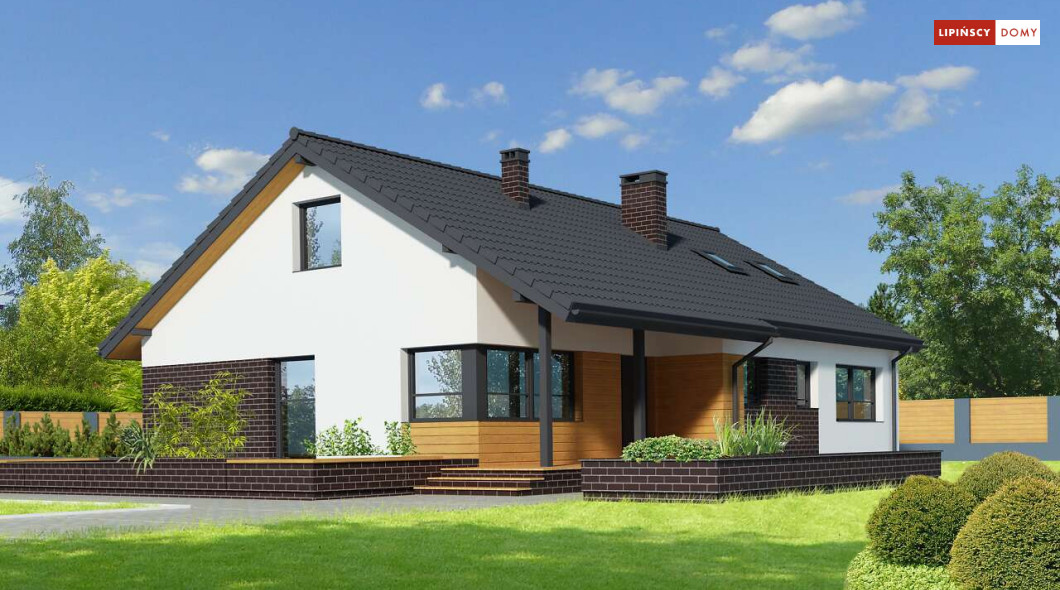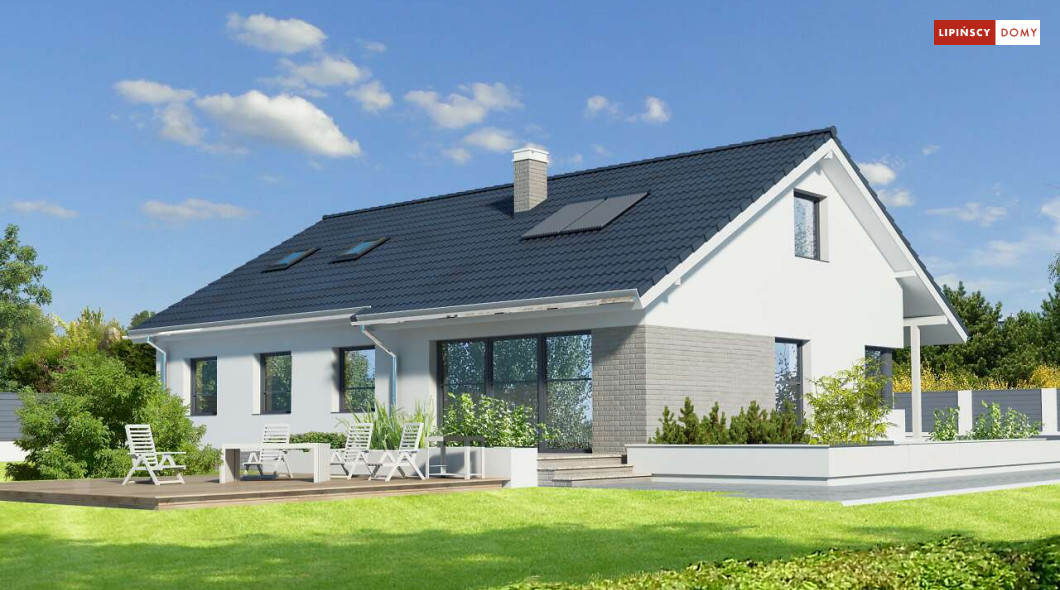 Prosty dom parterowy z dwuspadowym dachem, z możliwością wykorzystania poddasza, doskonały dla 4-5 osobowej rodziny. Dom przewidziano bez garażu, a zlokalizowanie od frontu części dziennej pozwala na zlokalizowanie go na działkach z wjazdem od południa. Parter został podzielony między strefę dzienną – duży salon z miejscem na rodzinny stół i otwartą na niego kuchnię, toaletę i pomieszczenie gospodarcze. Strefa prywatna to trzy mniejsze i jedna większa sypialnia oraz duża wspólna łazienka. Poddasze, o powierzchni niemal 60m² daje duże możliwości aranżacyjne i w zależności od potrzeb można je przeznaczyć na kącik wypoczynkowy, dodatkową sypialnię, czy studio. Uwagę zwraca zadaszone wejście oraz narożne okna. Prosta bryła i architektura sprawiają, że dom jest nieskomplikowany i niedrogi w budowie. W projekcie przewidziano ogrzewanie kotłem na gaz. Możliwa jest zmiana ogrzewania na pompę ciepła.