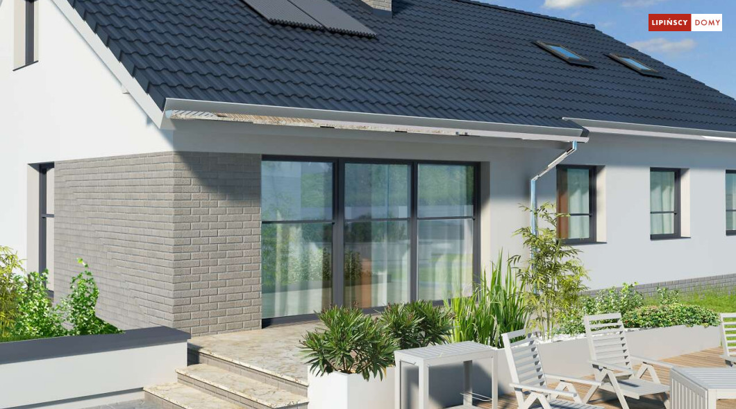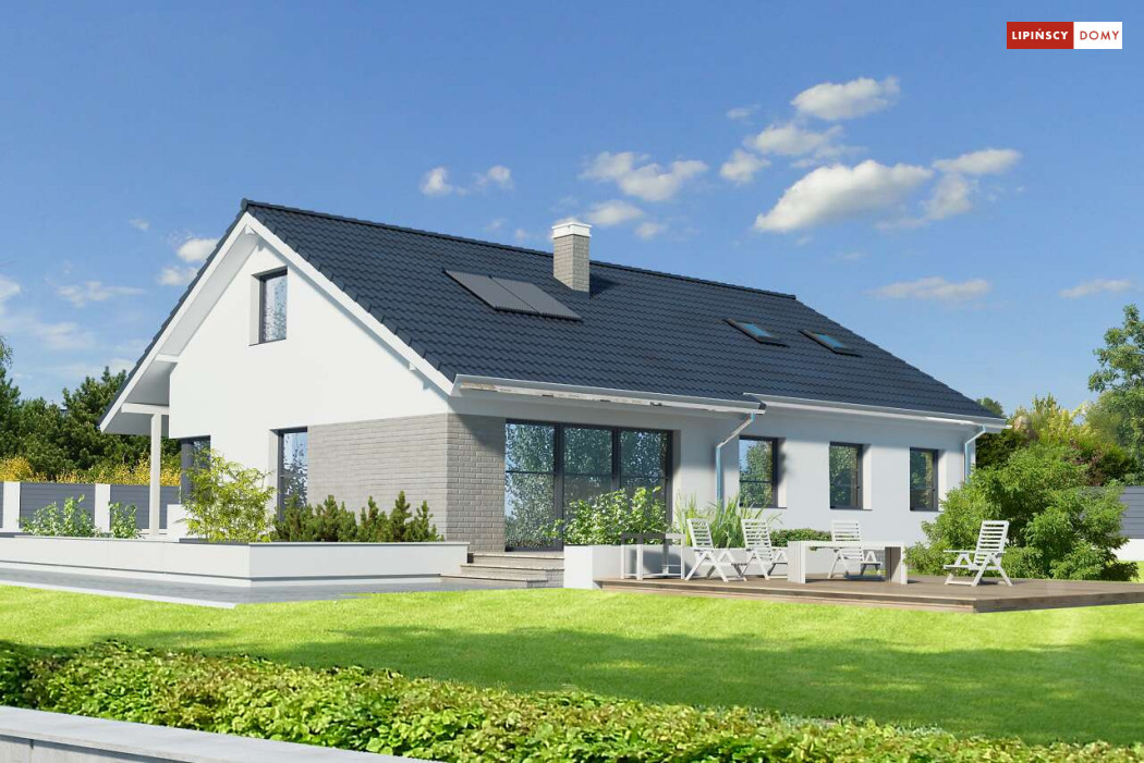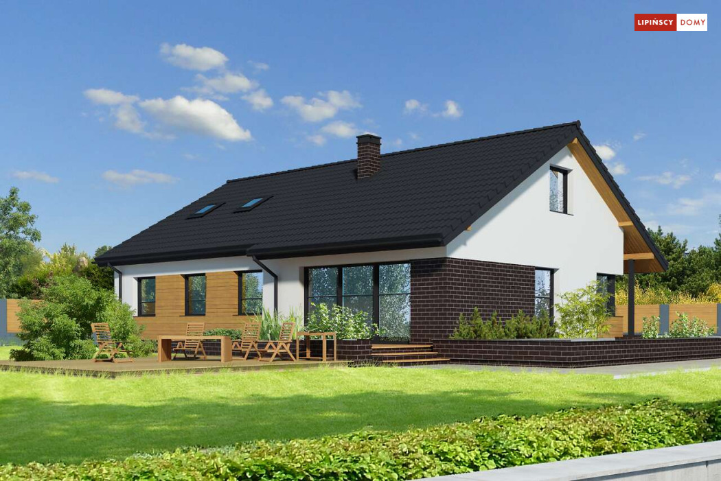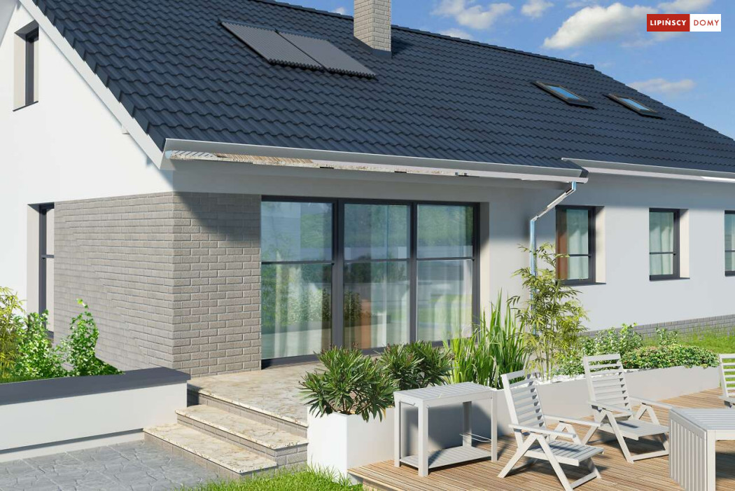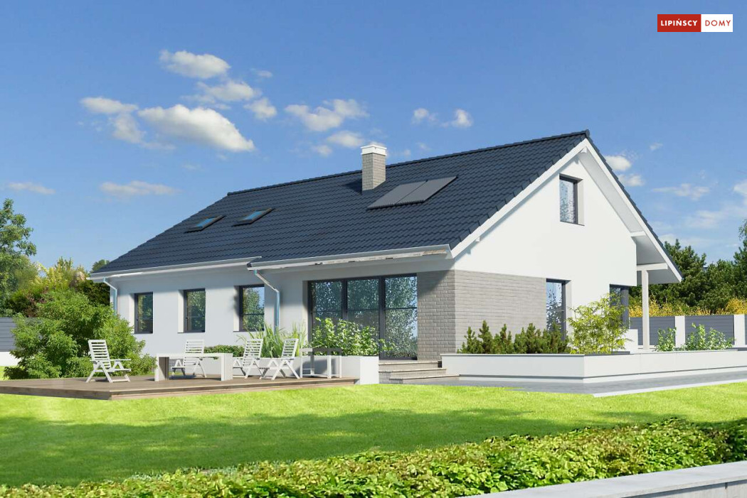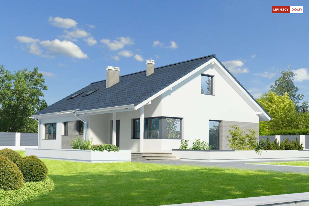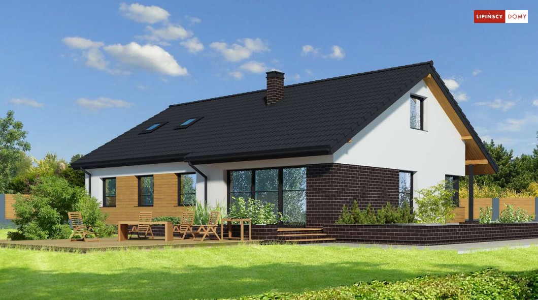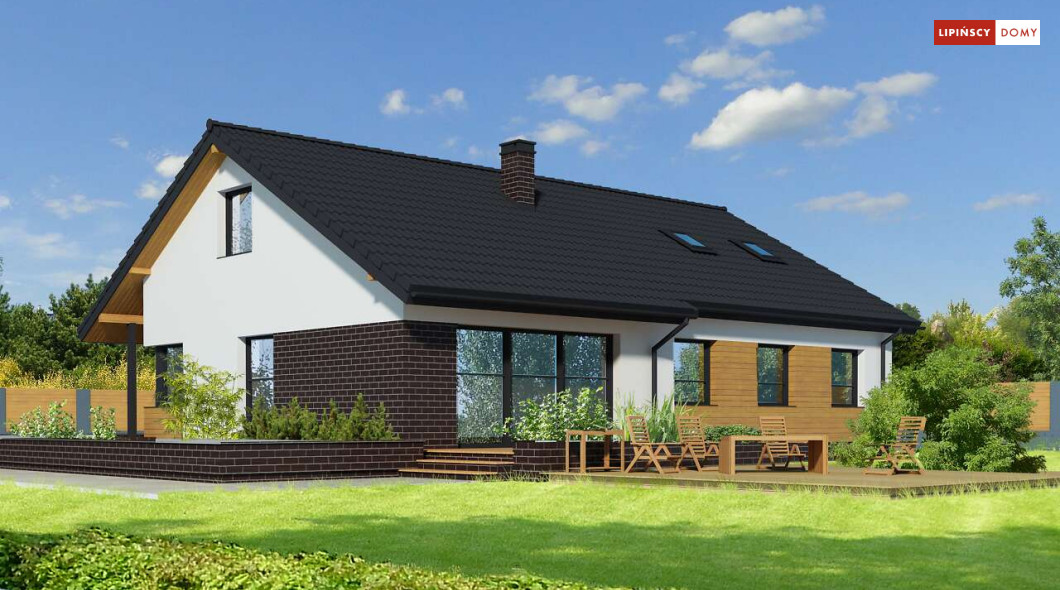 Prosty dom parterowy z dwuspadowym dachem, z możliwością wykorzystania poddasza, doskonały dla 4-5 osobowej rodziny. Dom przewidziano bez garażu, a zlokalizowanie od frontu części dziennej pozwala na zlokalizowanie go na działkach z wjazdem od południa. Parter został podzielony między strefę dzienną – duży salon z miejscem na rodzinny stół i otwartą na niego kuchnię, toaletę i pomieszczenie gospodarcze. Strefa prywatna to trzy mniejsze i jedna większa sypialnia oraz duża wspólna łazienka. Poddasze, o powierzchni niemal 60m² daje duże możliwości aranżacyjne i w zależności od potrzeb można je przeznaczyć na kącik wypoczynkowy, dodatkową sypialnię, czy studio. Uwagę zwraca zadaszone wejście oraz narożne okna. Prosta bryła i architektura sprawiają, że dom jest nieskomplikowany i niedrogi w budowie. W projekcie przewidziano ogrzewanie kotłem na gaz. Możliwa jest zmiana ogrzewania na pompę ciepła.