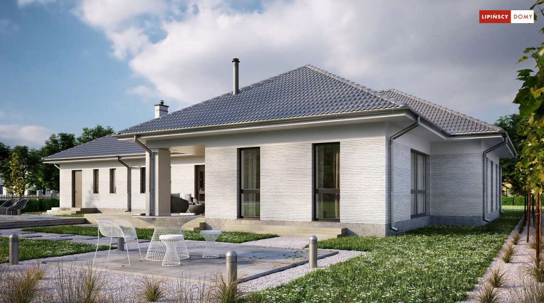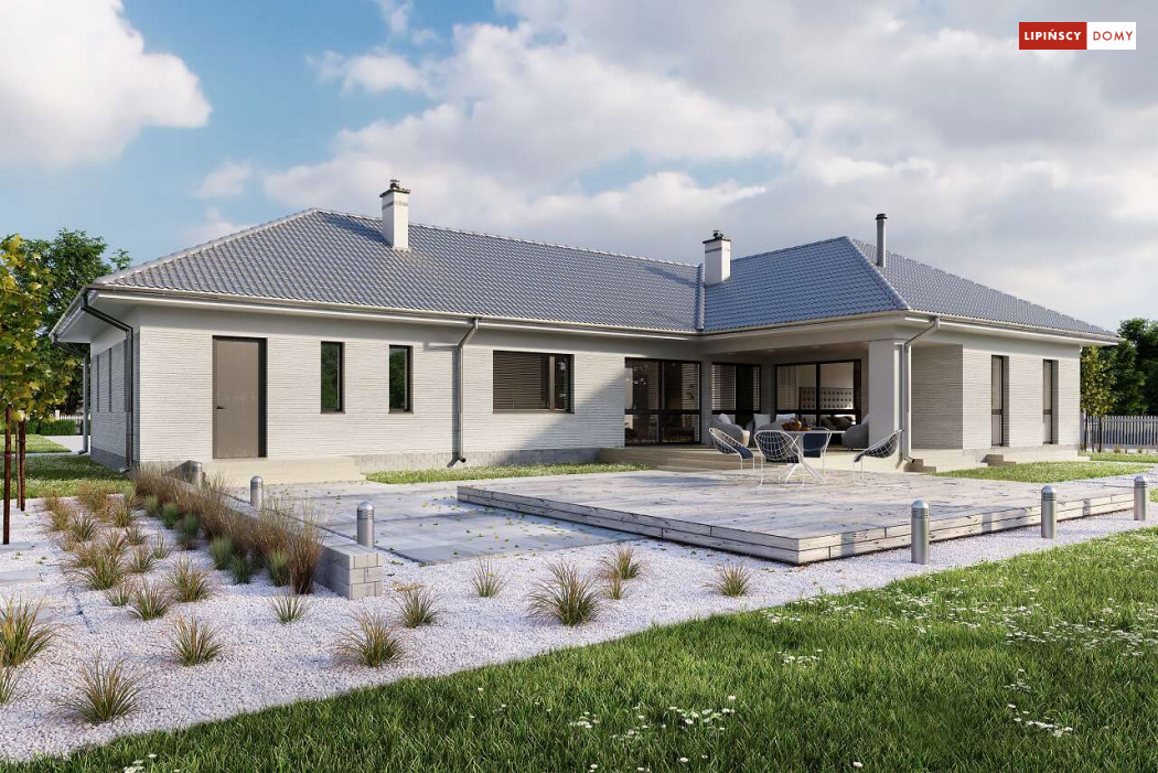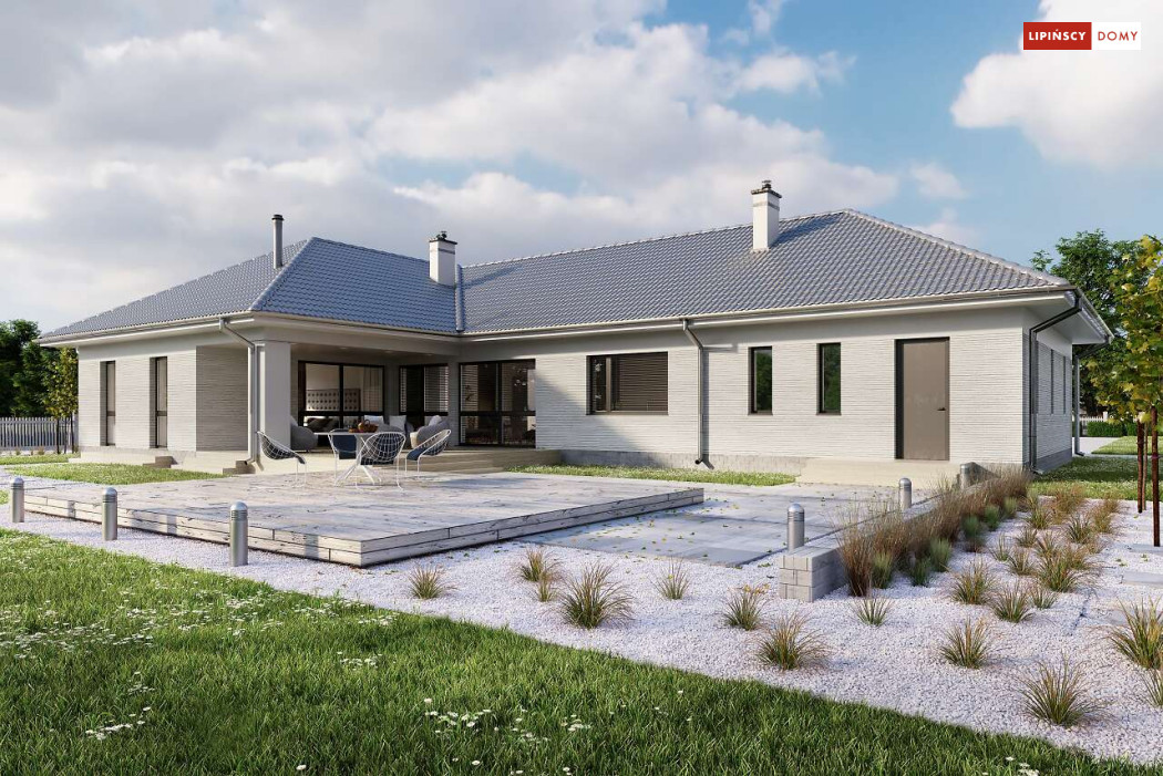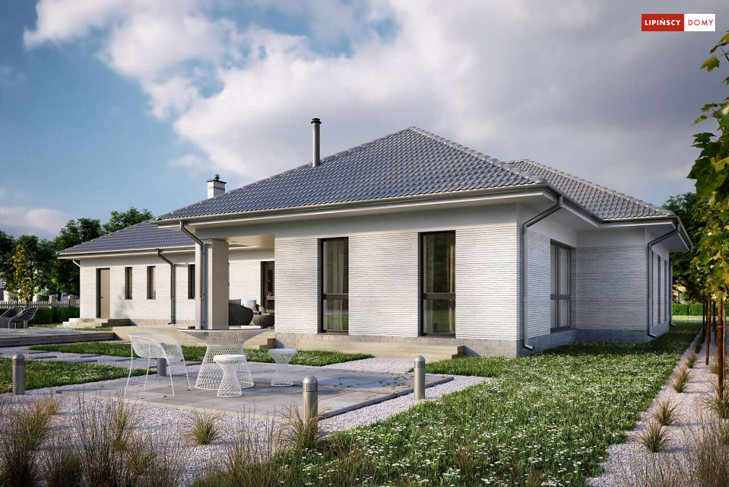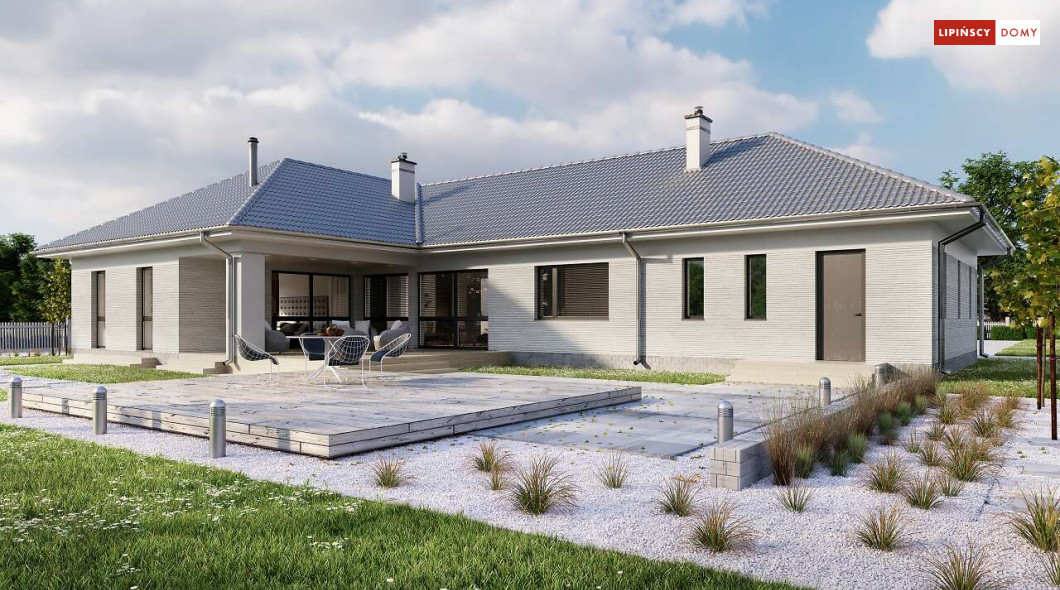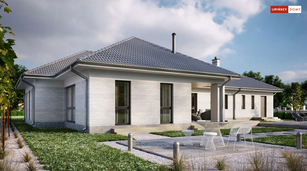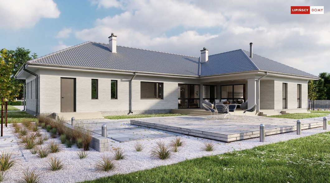 Andora to przestronny, komfortowy dom parterowy, zaprojektowany w standardzie energooszczędnym. Jest to doskonała propozycja dla większej rodziny – dzięki wyodrębnieniu aż sześciu sypialni, każdy z domowników może cieszyć się niezależnością. Wśród sypialni jedna posiada własną łazienkę i garderobę. Sercem domu jest duży, wygodny salon z jadalnią, obok którego znajduje się ustawna kuchnia. W nowoczesną bryłę budynku wkomponowano duży garaż, za którym znajduje się kotłownia oraz pomieszczenie gospodarcze. W projekcie przewidziano ogrzewanie kotłem na gaz. Możliwa jest zmiana ogrzewania na pompę ciepła.