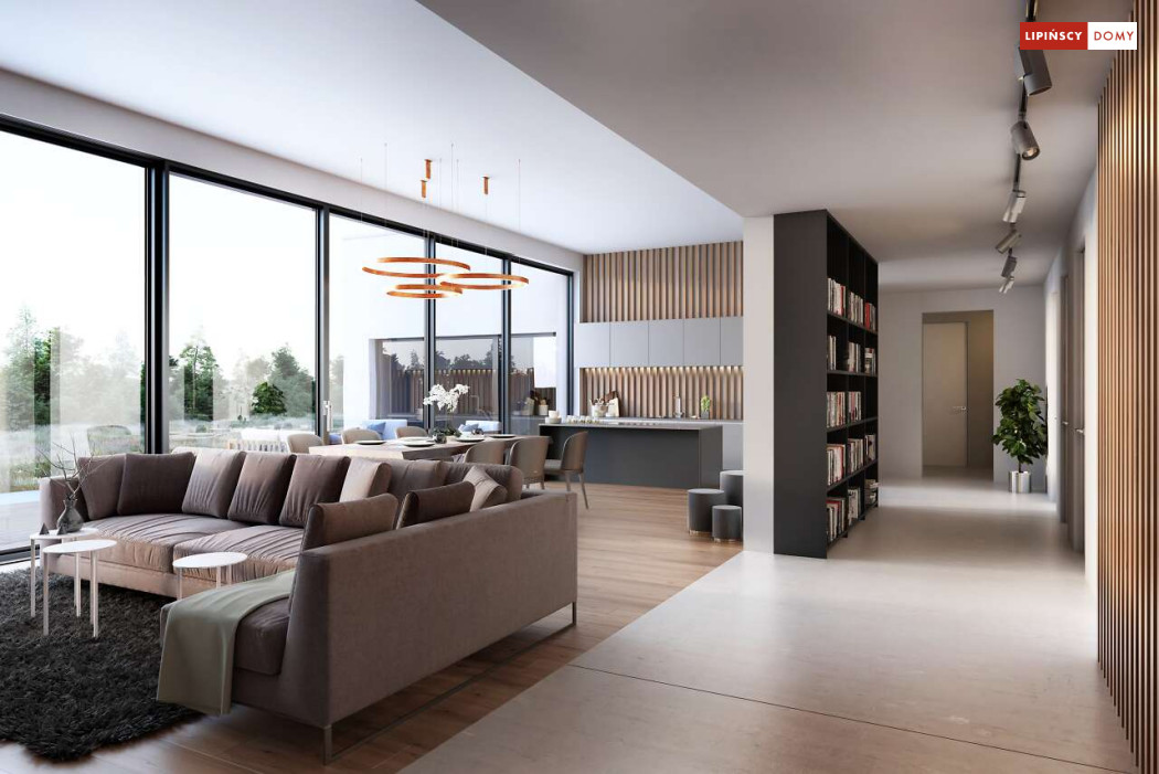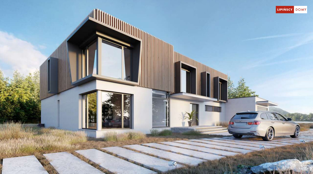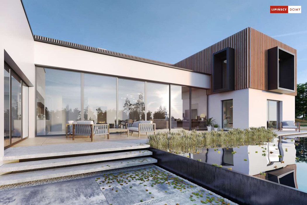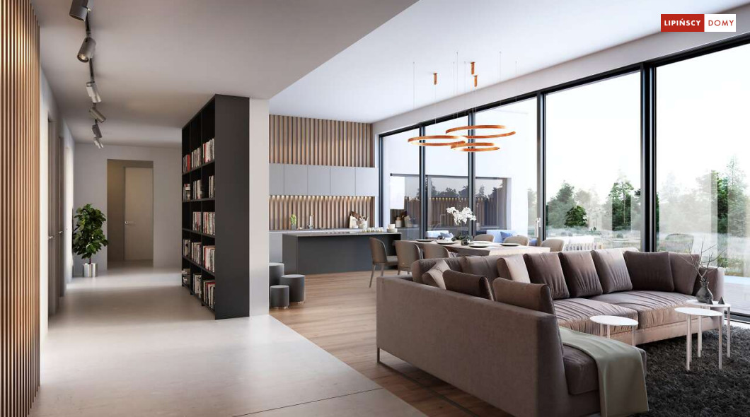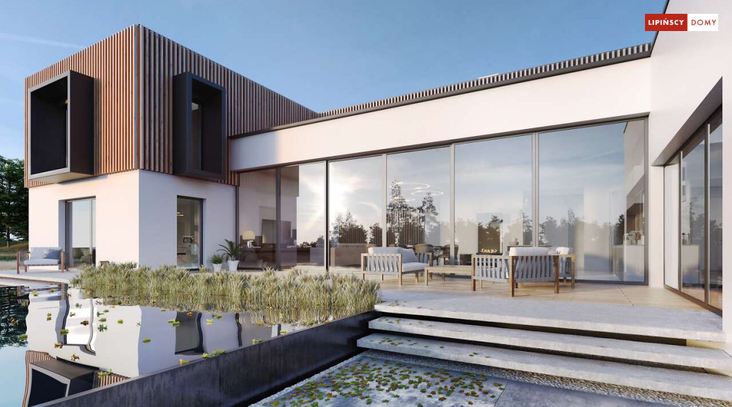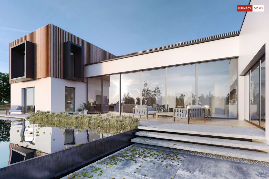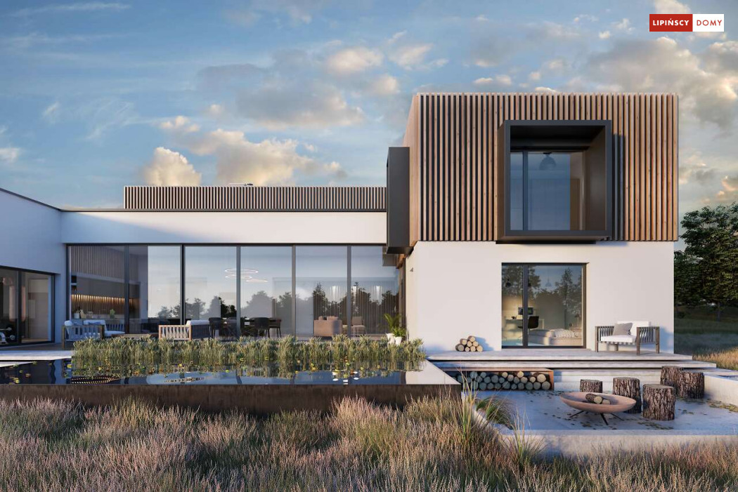 Przepiękny rozłożysty dom z częściowym pietrem wg projektu Annecy to komfortowa propozycja dla wymagających inwestorów. Nietypowa bryła domu z ciekawymi przeszkleniami, mieści bogaty program funkcjonalny. Parter podzielono na 3 części, w tym środkowa to podwyższona otwarta strefa dzienna, a boczne mieszczą z jednej strony dwustanowiskowy garaż, a za nim sporą część rekreacyjną z siłownią, sauną i zapleczem sanitarnym, natomiast po przeciwnej stronie - gabinet i dużą sypialnię małżeńską z łazienką. Piętro to strefa prywatna z czterema sypialniami i dwiema łazienkami.