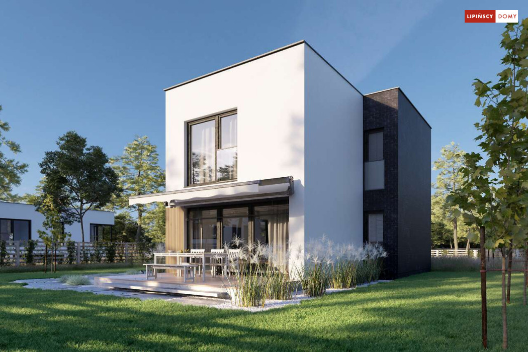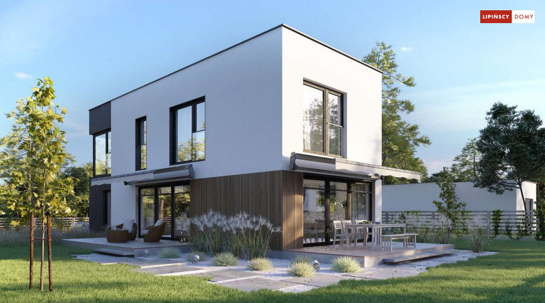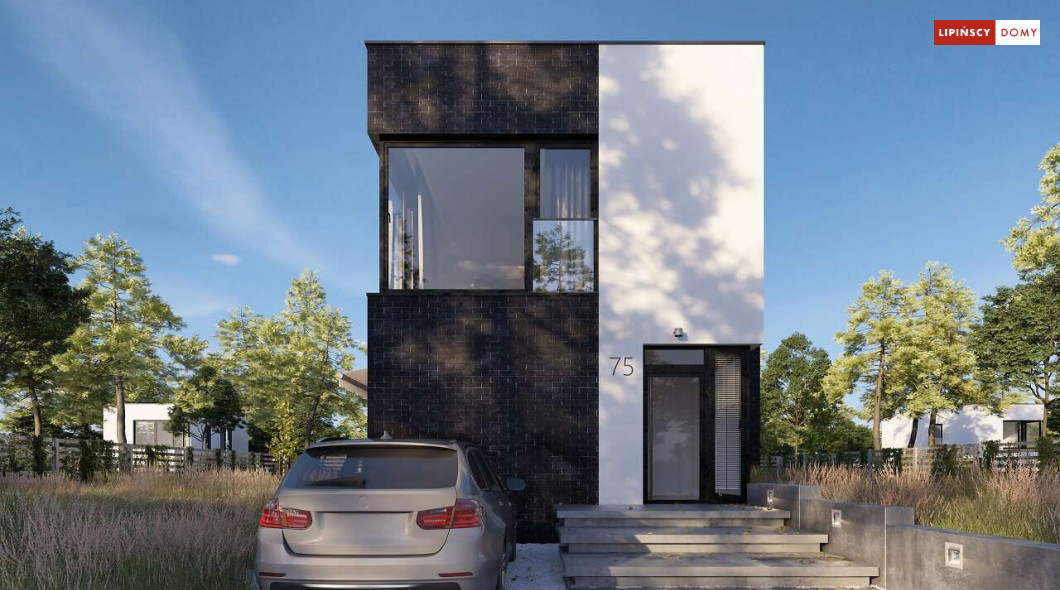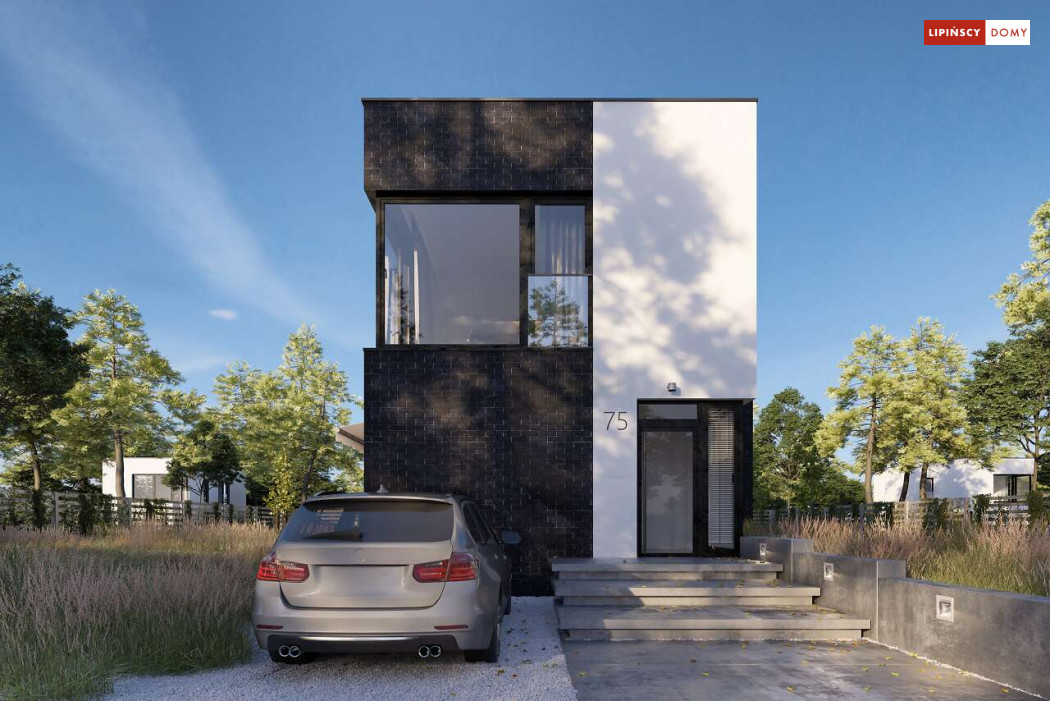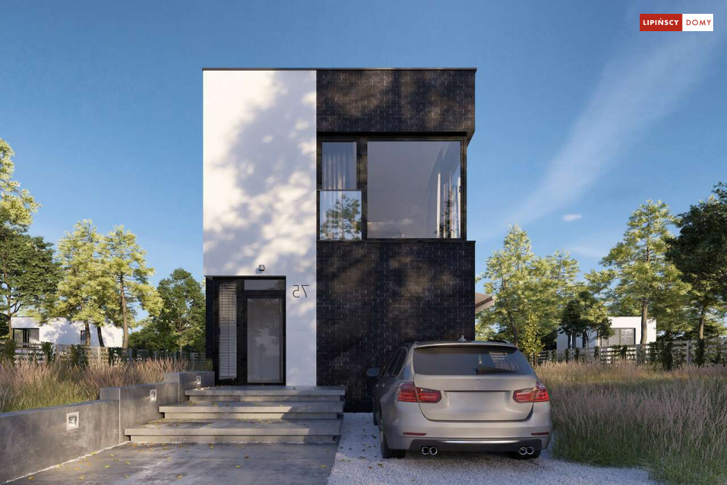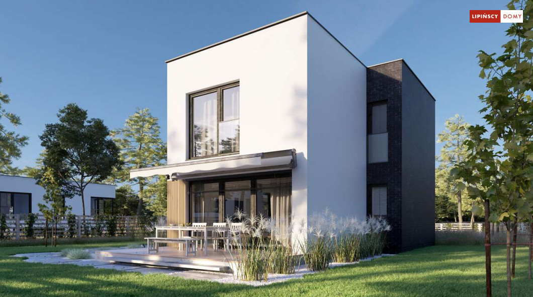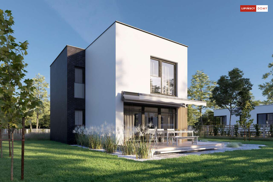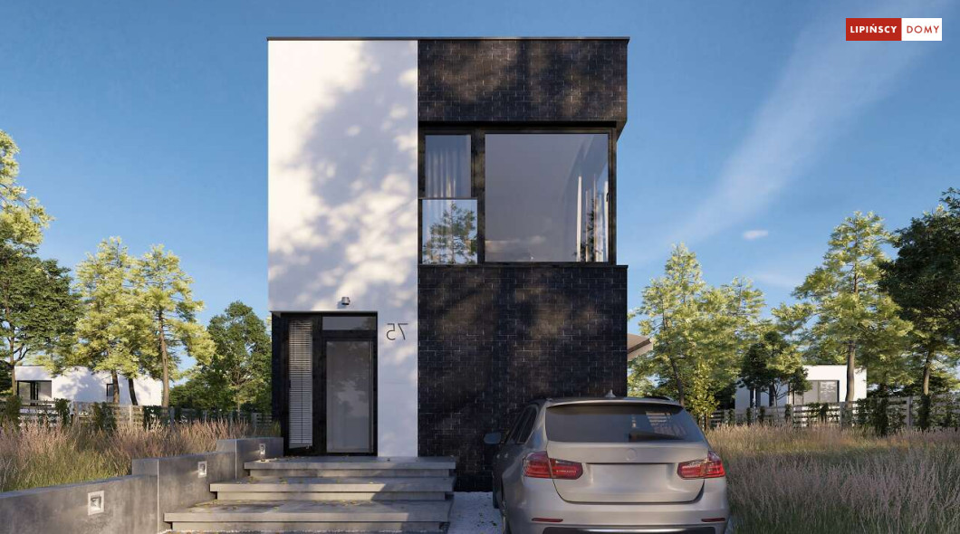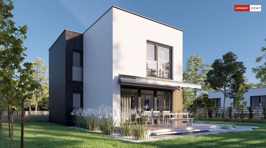 Nowoczesny, energooszczędny dom z płaskim dachem, idealny do zamieszkania przez 3-4 osobową rodzinę. Uwagę zwraca usytuowanie schodów, które – zlokalizowane w świetliku doświetlającym wnętrze, mogą stanowić ciekawy element aranżacyjny. Centrum domu stanowi przestronny salon z dużymi przeszkleniami oraz strefą kuchenną z funkcjonalną wyspą. Jest tu także wc oraz pomieszczenie techniczne z pompą ciepła i rekuperatorem. Ozdobą domu są dwa tarasy, doskonałe do spędzania czasu na świeżym powietrzu. Druga kondygnacja to trzy sypialnie i wygodna, doświetlona oknem łazienka. Dzięki zwartej bryle i niedużej szerokości, dom doskonale nadaje się do budowy na wąskiej działce.