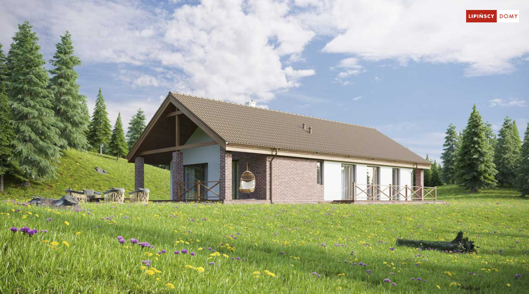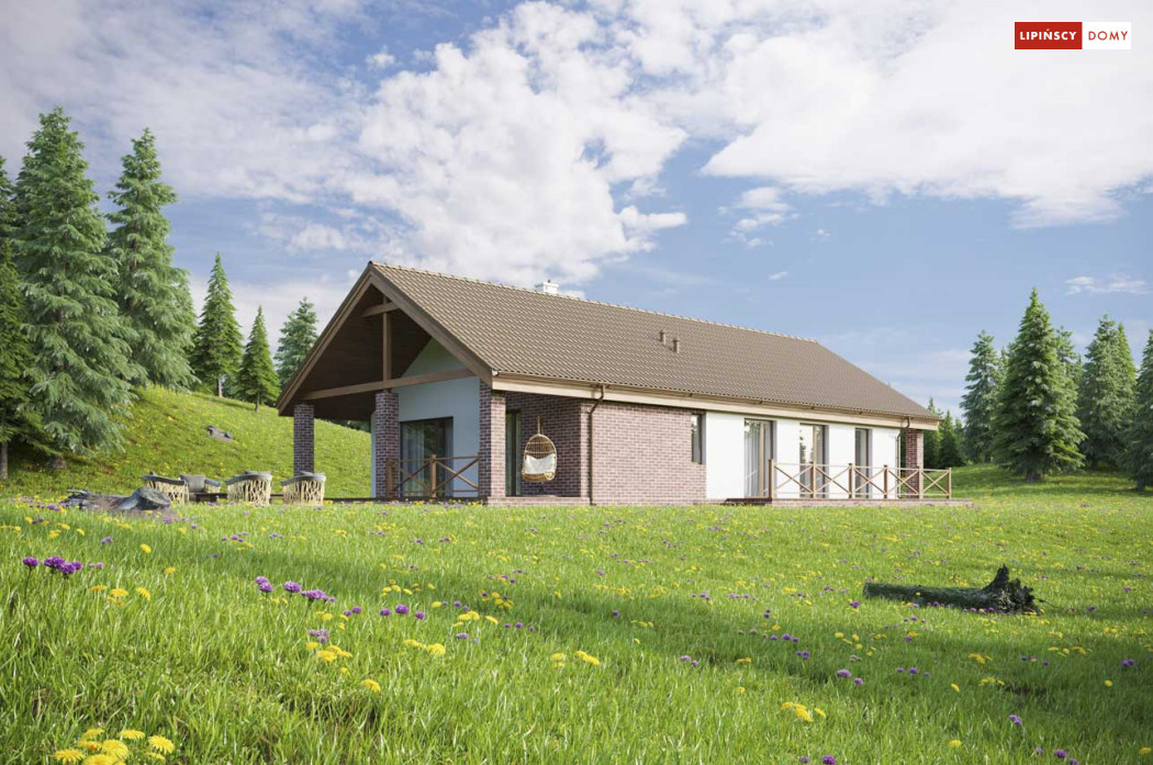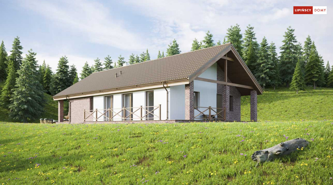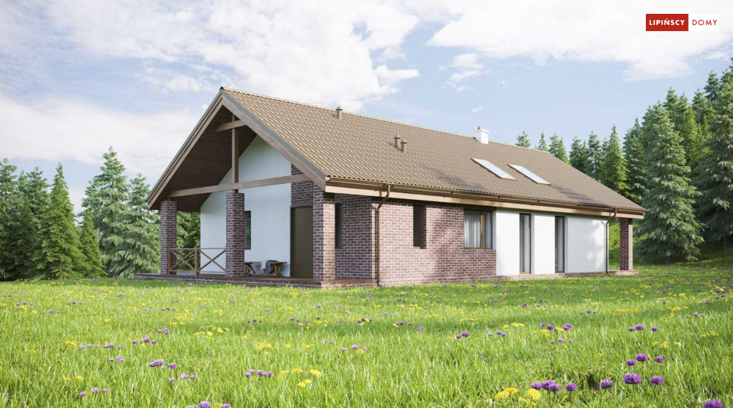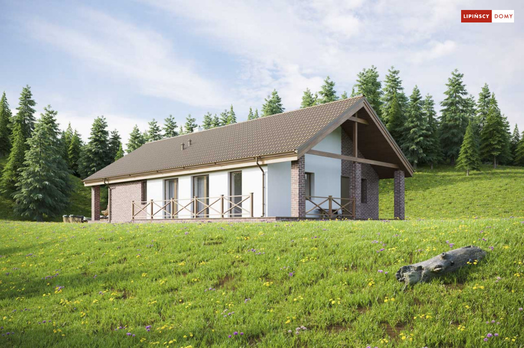 Projekt małego, pojemnego domu o prostej formie i elewacji ze stylem. Wnętrze rozplanowano w przejrzysty sposób, tak, aby użytkowanie było zupełnie intuicyjne i wygodne. Na 100 m kw. umieszczono 4 sypialnie i wyjątkowo efektowną strefę dzienną. Wiatrołap prowadzi do wnętrza, półotwarta kuchnia z kontuarem, wysoki salon z jadalnią, atrakcyjnie doświetlany dodatkowo oknami połaciowymi, kominek daje ciepło w jesienne wieczory, a zadaszony taras zapewnia przyjemny cień letnią porą. Pokój rodziców ma wyjście na zadaszony taras i własną łazienkę, zapewnia wygodę i intymność. Trzy pokoje dzieciaków mają własną łazienkę i wyjścia na boczny taras. Jest to dom w sam raz dla rodziny ceniącej sobie komfort i estetykę.