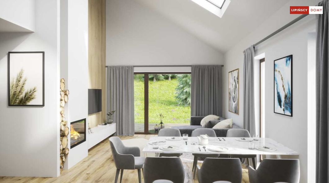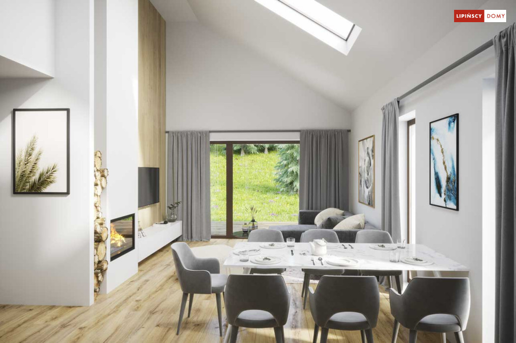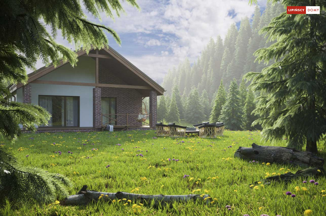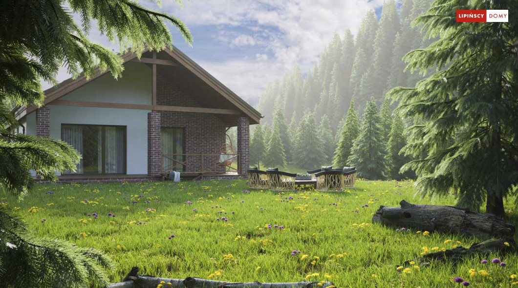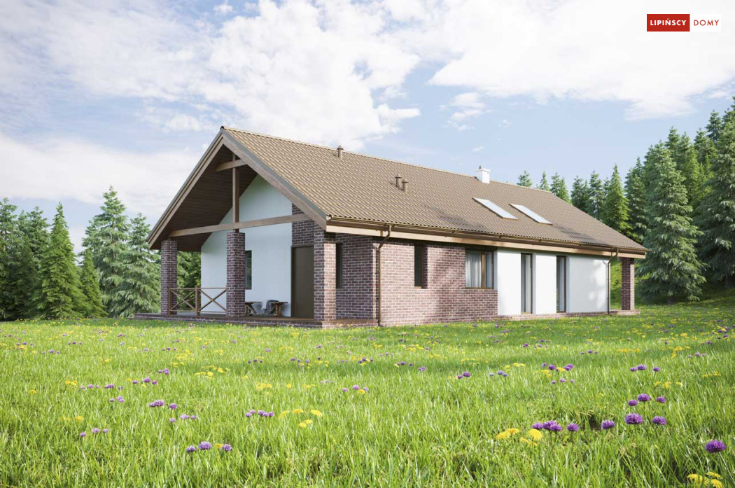 Projekt małego, pojemnego domu o prostej formie i elewacji ze stylem. Wnętrze rozplanowano w przejrzysty sposób, tak, aby użytkowanie było zupełnie intuicyjne i wygodne. Na 100 m kw. umieszczono 4 sypialnie i wyjątkowo efektowną strefę dzienną. Wiatrołap prowadzi do wnętrza, półotwarta kuchnia z kontuarem, wysoki salon z jadalnią, atrakcyjnie doświetlany dodatkowo oknami połaciowymi, kominek daje ciepło w jesienne wieczory, a zadaszony taras zapewnia przyjemny cień letnią porą. Pokój rodziców ma wyjście na zadaszony taras i własną łazienkę, zapewnia wygodę i intymność. Trzy pokoje dzieciaków mają własną łazienkę i wyjścia na boczny taras. Jest to dom w sam raz dla rodziny ceniącej sobie komfort i estetykę.