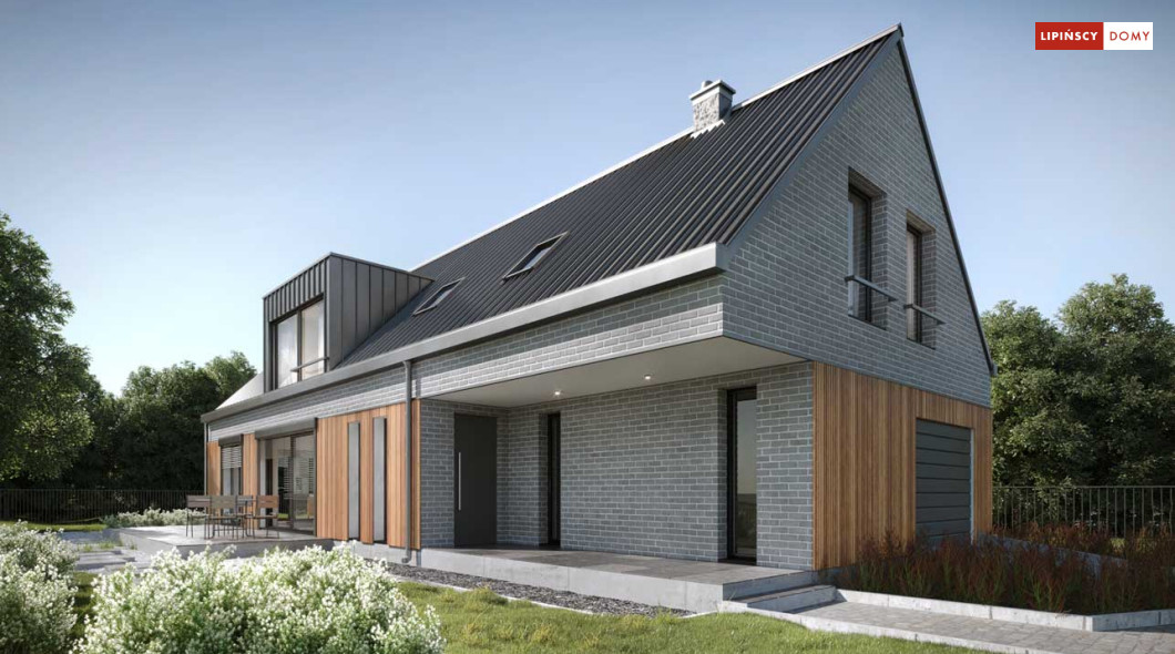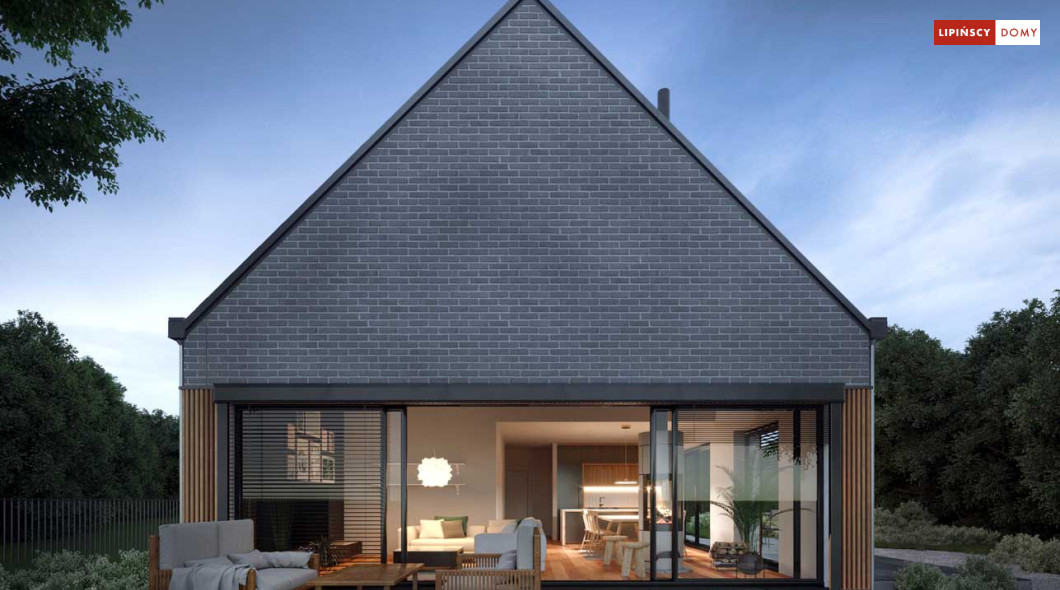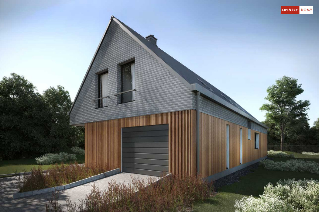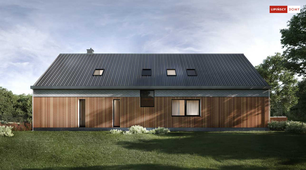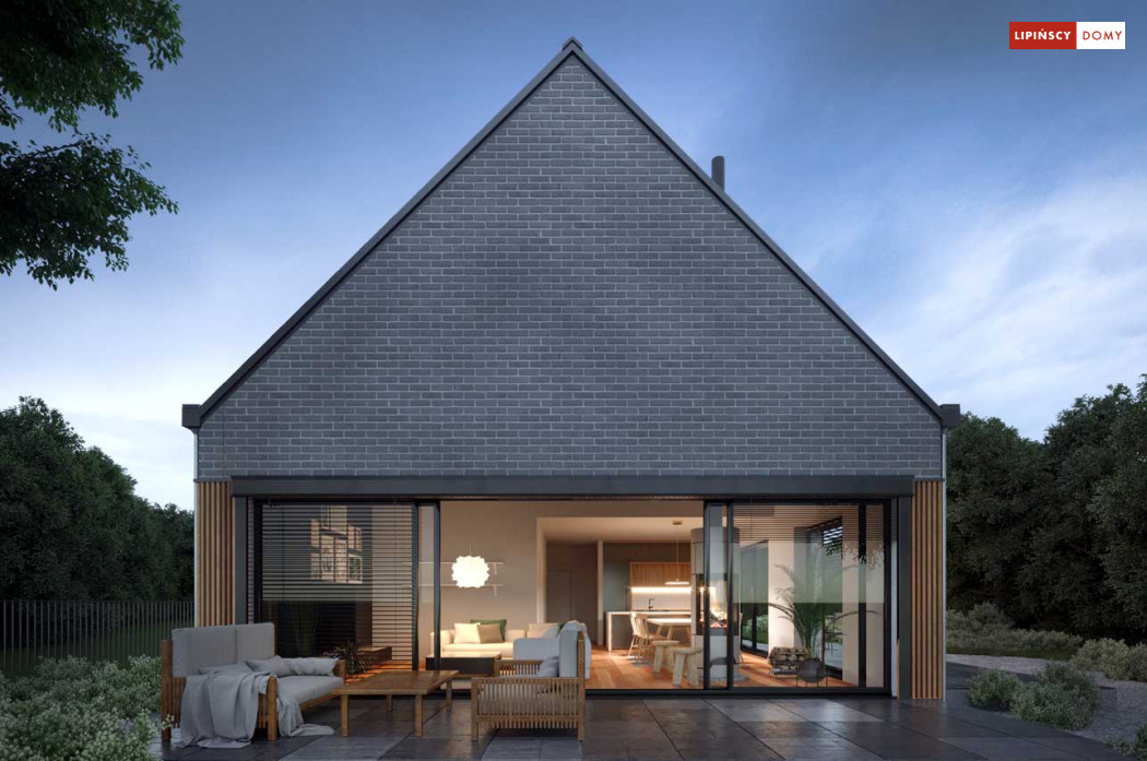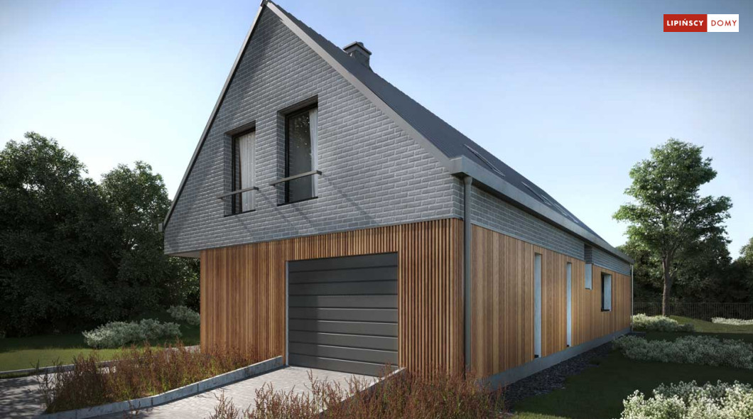 Efektowny dom z poddaszem użytkowym i dwuspadowym bezokapowym dachem w stylu nowoczesnej stodoły, idealny do zabudowy na wąską działkę. Wejście i wjazd do garażu są po tej samej, wschodniej, stronie. Sercem projektu jest strefa dzienna, czyli otwarta przestrzeń, na którą składa się salon, kuchnia i jadalnia. Duże przeszklenia na południe i zachód sprawiają, że światło słoneczne wpada tam przez cały dzień. Podwyższony sufit w salonie czyni ten jasny pokój jeszcze bardziej przestronnym. Komin z przezroczystym paleniskiem doskonale go zdobi, szczególnie wieczorami, gdy słońce już zajdzie. Obok znajdziemy dodatkowy pokój gościnny, lub biuro. Sypialnie domowników znajdują się na poddaszu , wraz z wspólną łazienką i pomieszczeniem gospodarczym. Dwie są takie same, z oknami na wschód, szczególnie miłymi o porankach. Trzecia, której lukarna daje nieziemskie przeszklenie, jest połączona z łazienką i garderobą - własny apartament dla rodziców. W projekcie przewidziano ogrzewanie kotłem na gaz. Możliwa jest zmiana ogrzewania na pompę ciepła.