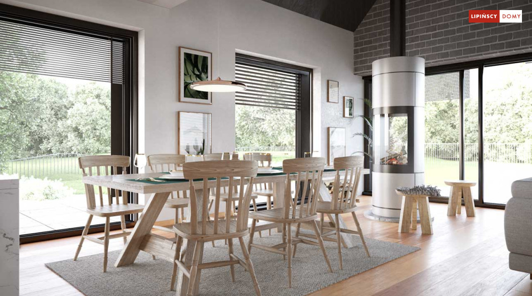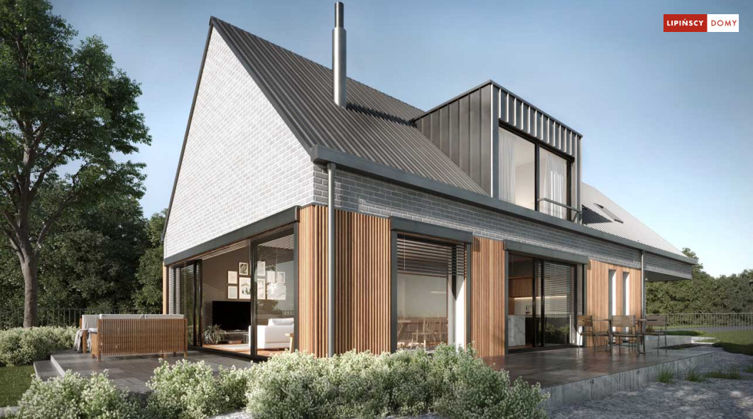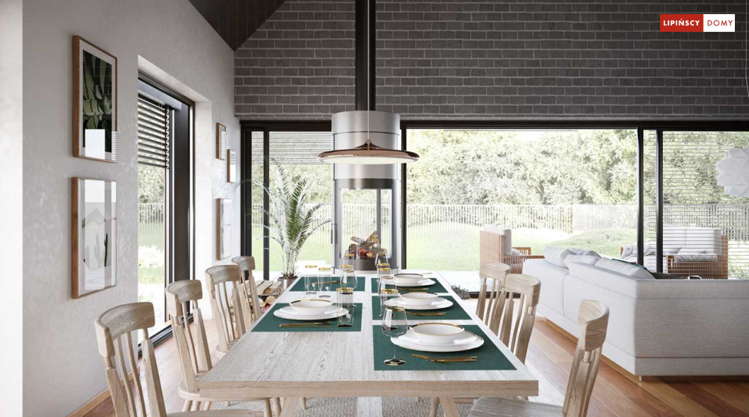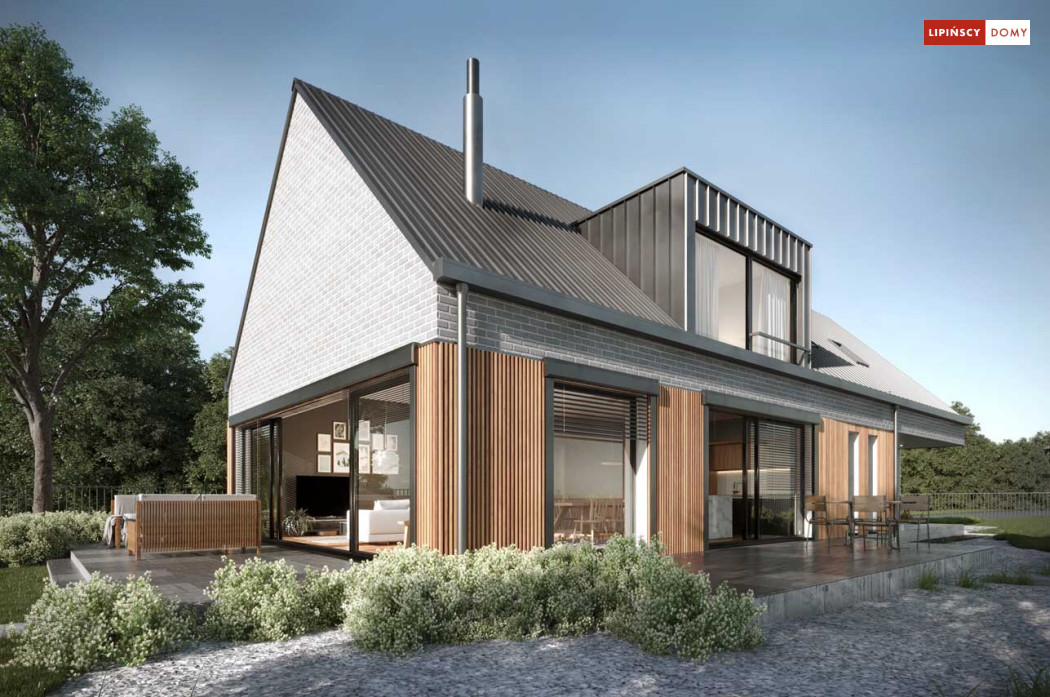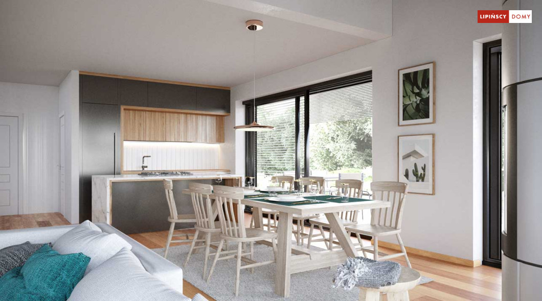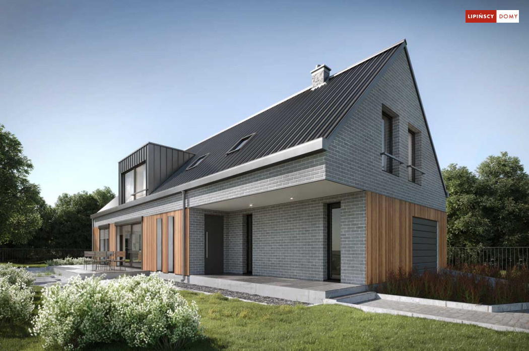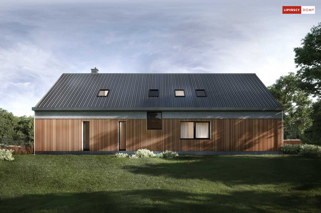 Efektowny dom z poddaszem użytkowym i dwuspadowym bezokapowym dachem w stylu nowoczesnej stodoły, idealny do zabudowy na wąską działkę. Wejście i wjazd do garażu są po tej samej, wschodniej, stronie. Sercem projektu jest strefa dzienna, czyli otwarta przestrzeń, na którą składa się salon, kuchnia i jadalnia. Duże przeszklenia na południe i zachód sprawiają, że światło słoneczne wpada tam przez cały dzień. Podwyższony sufit w salonie czyni ten jasny pokój jeszcze bardziej przestronnym. Komin z przezroczystym paleniskiem doskonale go zdobi, szczególnie wieczorami, gdy słońce już zajdzie. Obok znajdziemy dodatkowy pokój gościnny, lub biuro. Sypialnie domowników znajdują się na poddaszu , wraz z wspólną łazienką i pomieszczeniem gospodarczym. Dwie są takie same, z oknami na wschód, szczególnie miłymi o porankach. Trzecia, której lukarna daje nieziemskie przeszklenie, jest połączona z łazienką i garderobą - własny apartament dla rodziców. W projekcie przewidziano ogrzewanie kotłem na gaz. Możliwa jest zmiana ogrzewania na pompę ciepła.