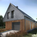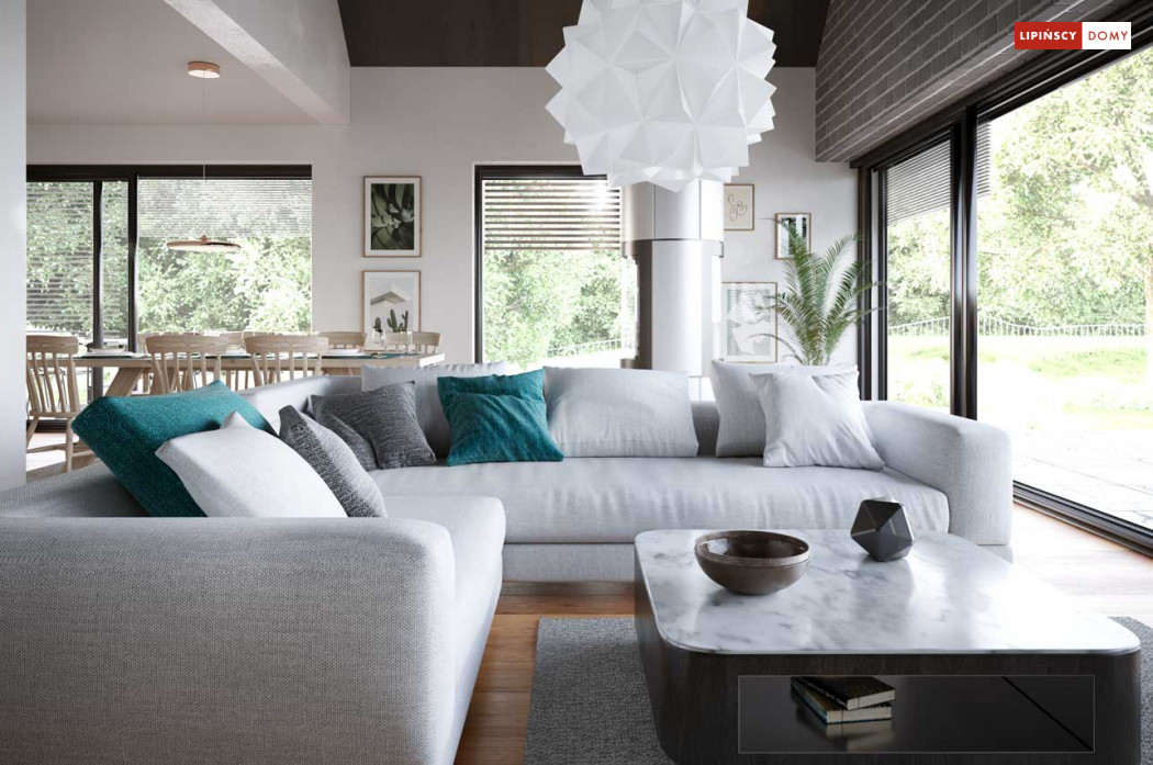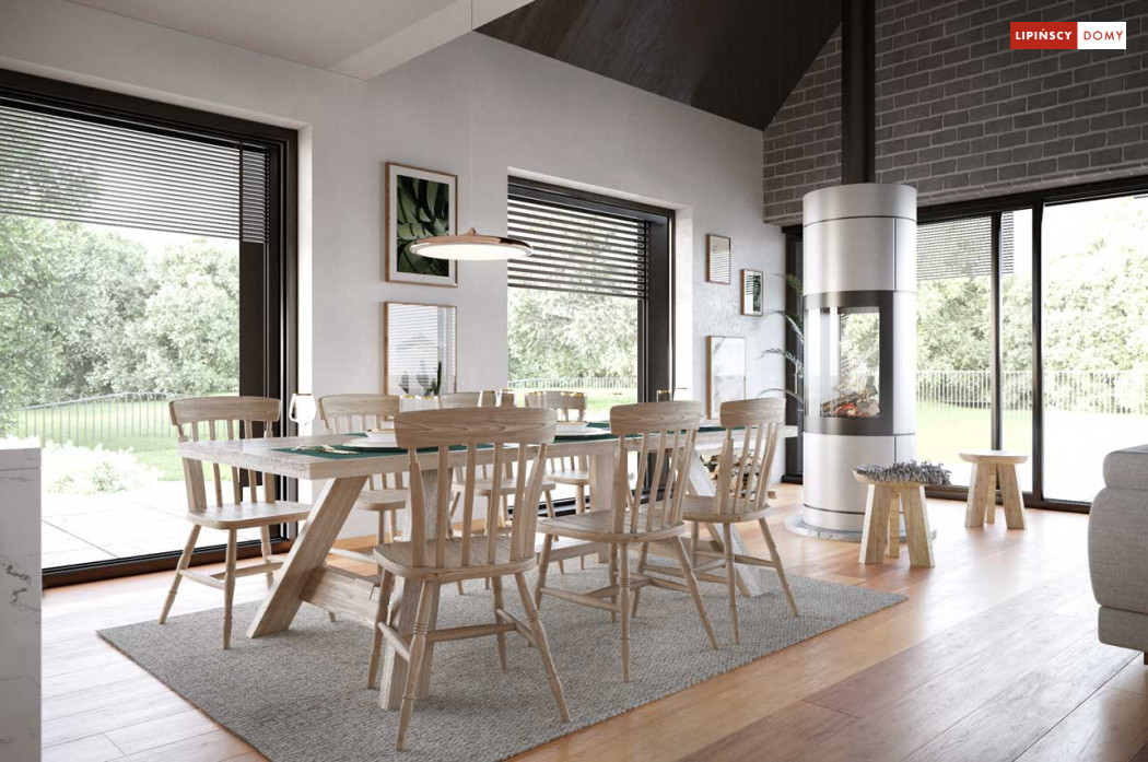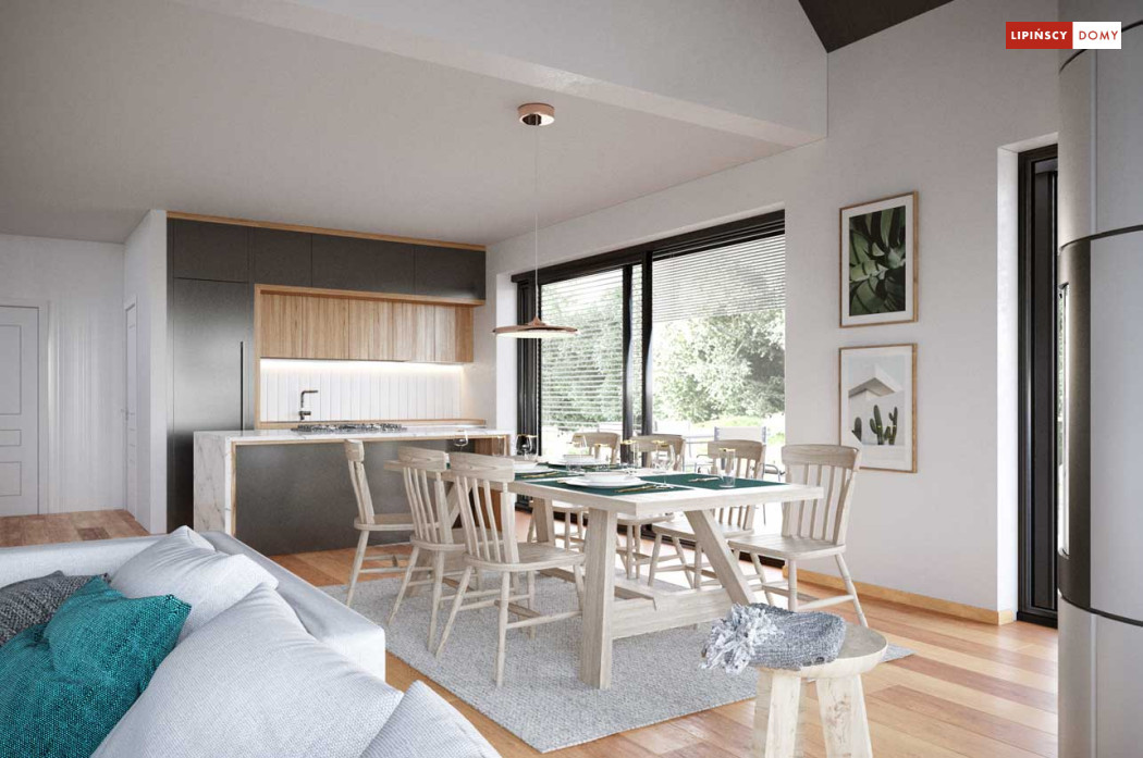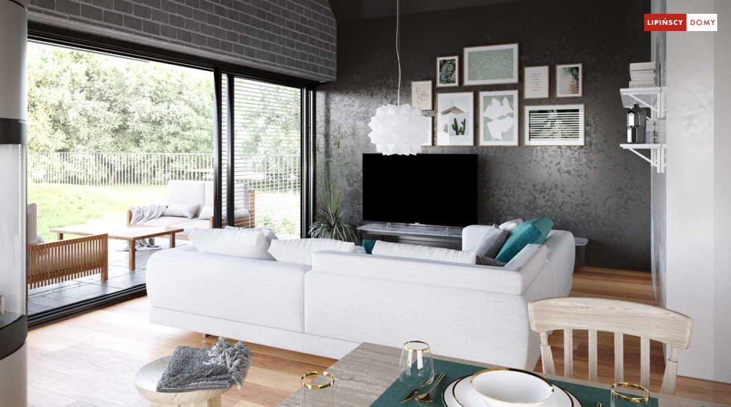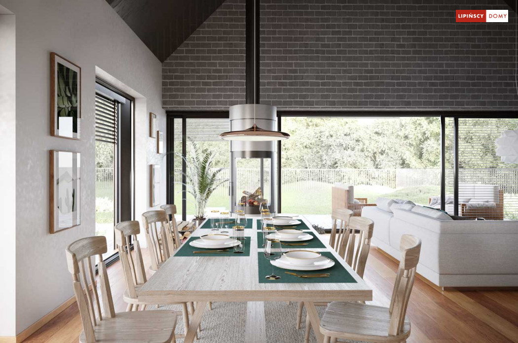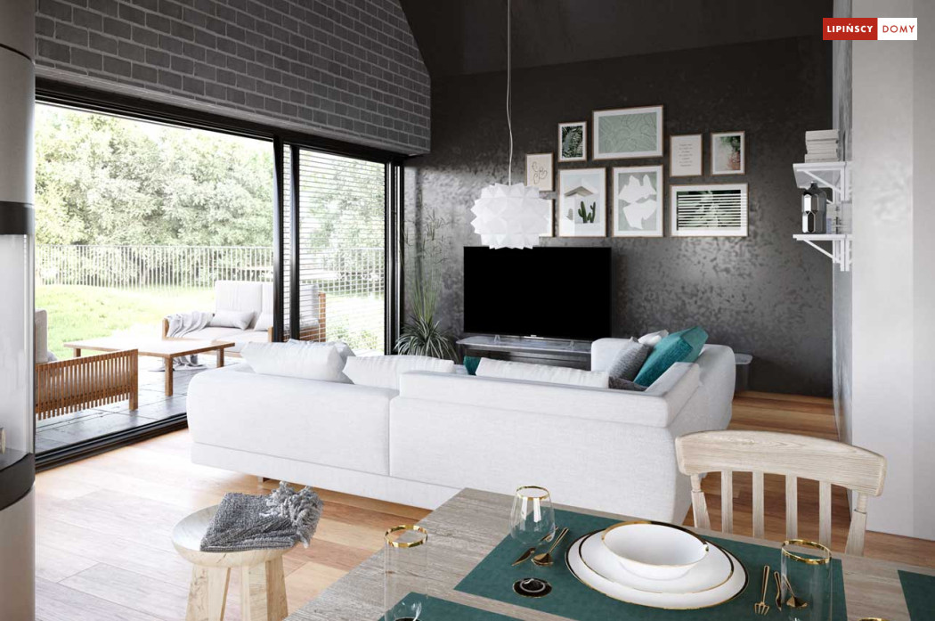 Efektowny dom z poddaszem użytkowym i dwuspadowym bezokapowym dachem w stylu nowoczesnej stodoły, idealny do zabudowy na wąską działkę. Wejście i wjazd do garażu są po tej samej, wschodniej, stronie. Sercem projektu jest strefa dzienna, czyli otwarta przestrzeń, na którą składa się salon, kuchnia i jadalnia. Duże przeszklenia na południe i zachód sprawiają, że światło słoneczne wpada tam przez cały dzień. Podwyższony sufit w salonie czyni ten jasny pokój jeszcze bardziej przestronnym. Komin z przezroczystym paleniskiem doskonale go zdobi, szczególnie wieczorami, gdy słońce już zajdzie. Obok znajdziemy dodatkowy pokój gościnny, lub biuro. Sypialnie domowników znajdują się na poddaszu , wraz z wspólną łazienką i pomieszczeniem gospodarczym. Dwie są takie same, z oknami na wschód, szczególnie miłymi o porankach. Trzecia, której lukarna daje nieziemskie przeszklenie, jest połączona z łazienką i garderobą - własny apartament dla rodziców. W projekcie przewidziano ogrzewanie kotłem na gaz. Możliwa jest zmiana ogrzewania na pompę ciepła.