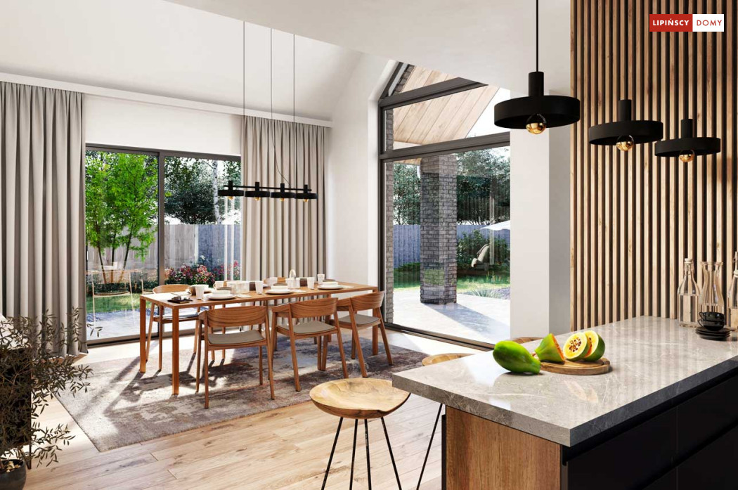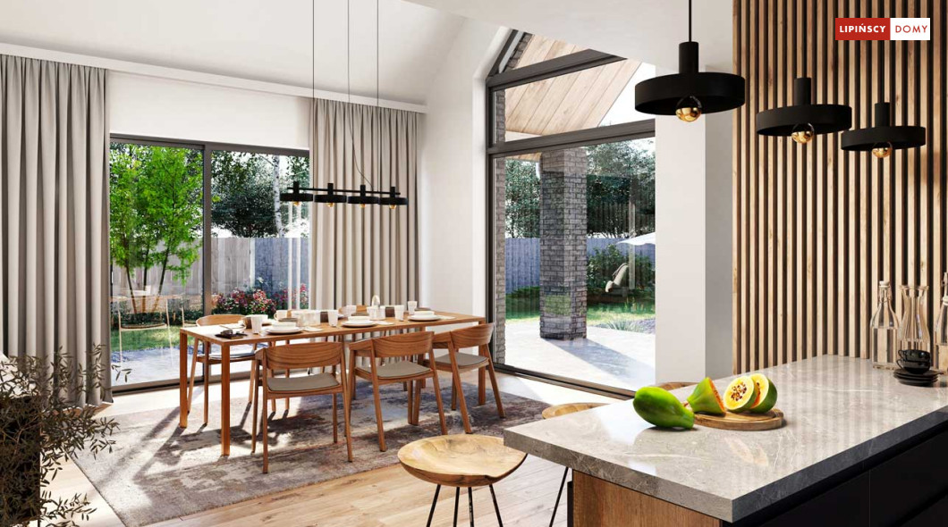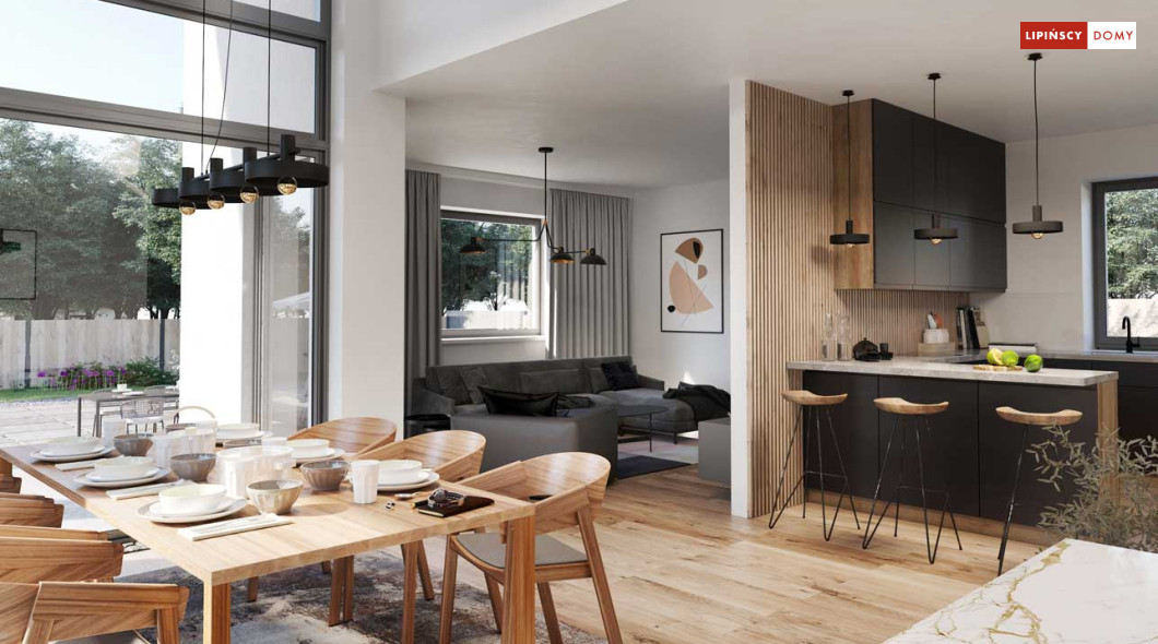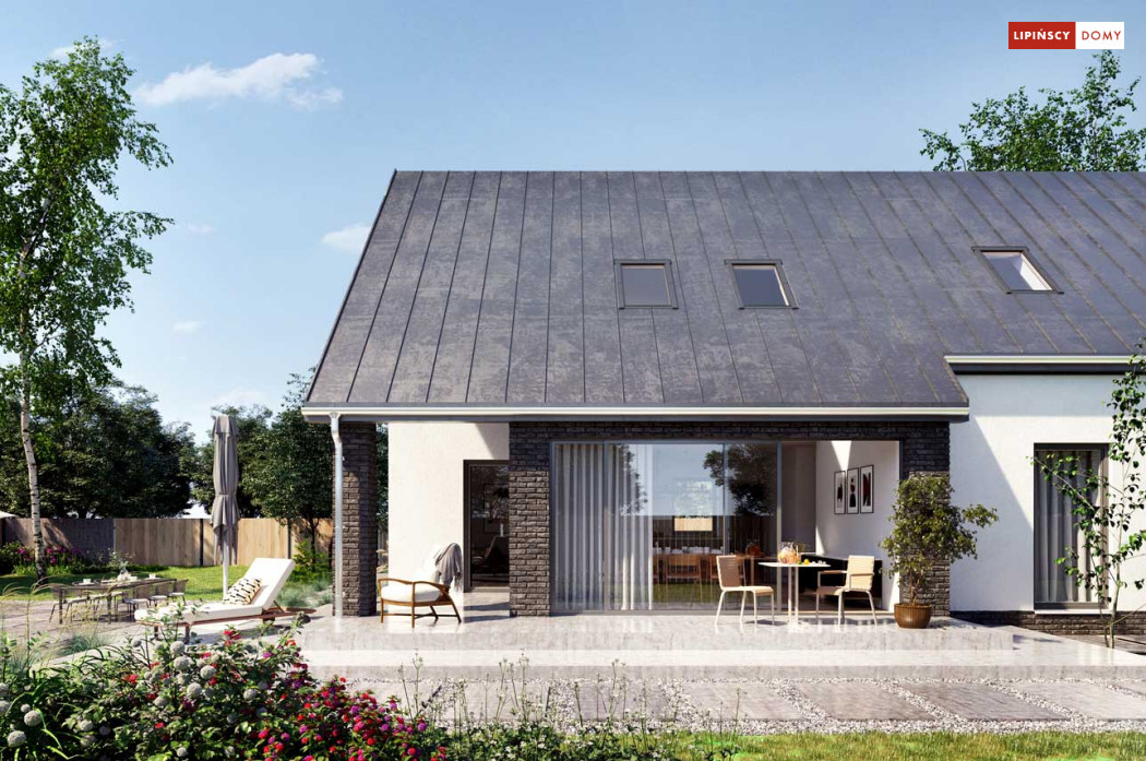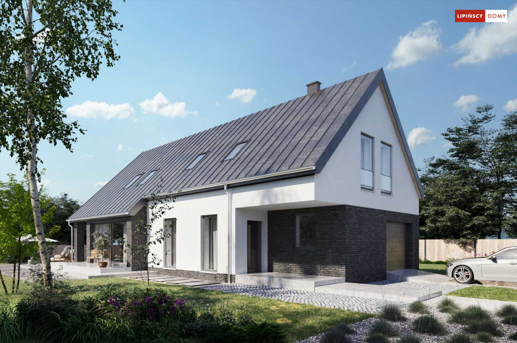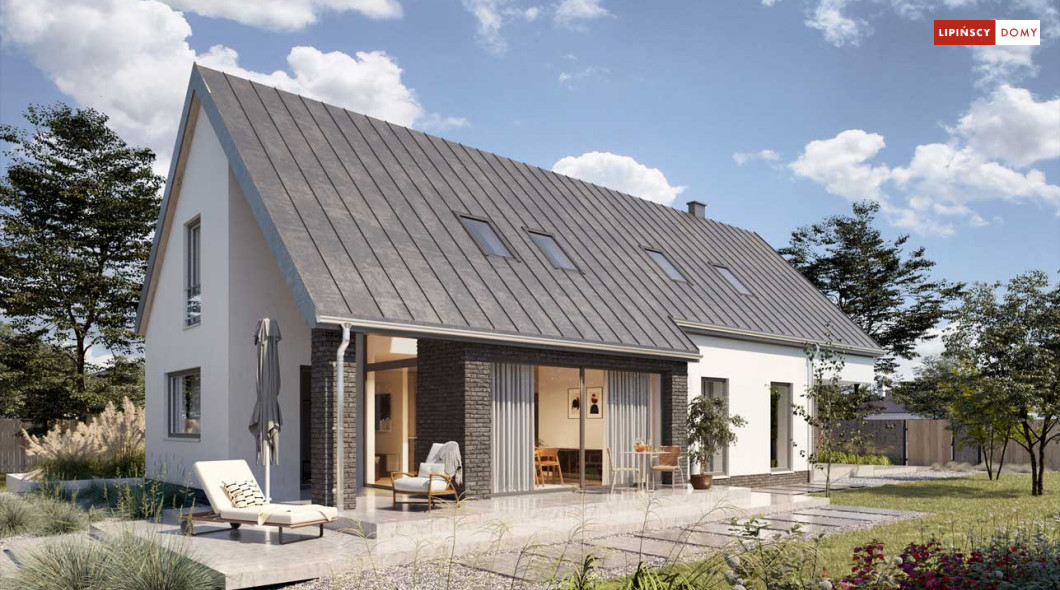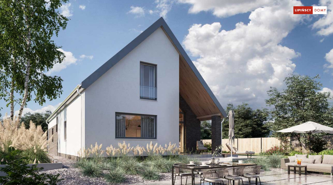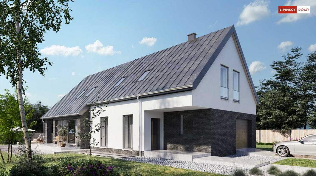 Nowoczesny dom z poddaszem użytkowym i dachem dwuspadowym. Mieszkańców i gości wita duży wiatrołap, w którym od razu można poczuć się jak w domu. Z wiatrołapu jest bezpośrednie przejście do części gospodarczej: jednostanowiskowego garażu i kotłowni. Wszystkich jednak zapraszamy do najpiękniejszej części domu, jaką stanowi przestronna część dzienna z wydzielonymi półotwartymi strefami: przytulnego salonu z wyjściem na taras; obszernej jadalni – wspaniale doświetlonej dzięki wysokim oknom i optycznie powiększonej poprzez antresolę; kuchni oddzielonej ścianką od salonu, ale otwartej na jadalnię. Jest to idealne miejsce do spożywania rodzinnych posiłków, jak i podejmowania gości na małych i większych przyjęciach. Dodatkowo na parterze znajduje się gabinet, który dobrze sprawdzi się również w roli pokoju gościnnego oraz łazienka. Na komfortowo rozplanowanym poddaszu mieści się strefa nocna domu, podzielona na dwie części. Jedna z nich to sypialnia małżeńska i mniejsza łazienka, zaś druga to dwie sypialnie, duża łazienka z miejscem zarówno na wannę, jak i kabinę prysznicową oraz pomieszczenie gospodarcze z funkcją pralni. W projekcie przewidziano ogrzewanie kotłem na gaz. Możliwa jest zmiana ogrzewania na pompę ciepła.