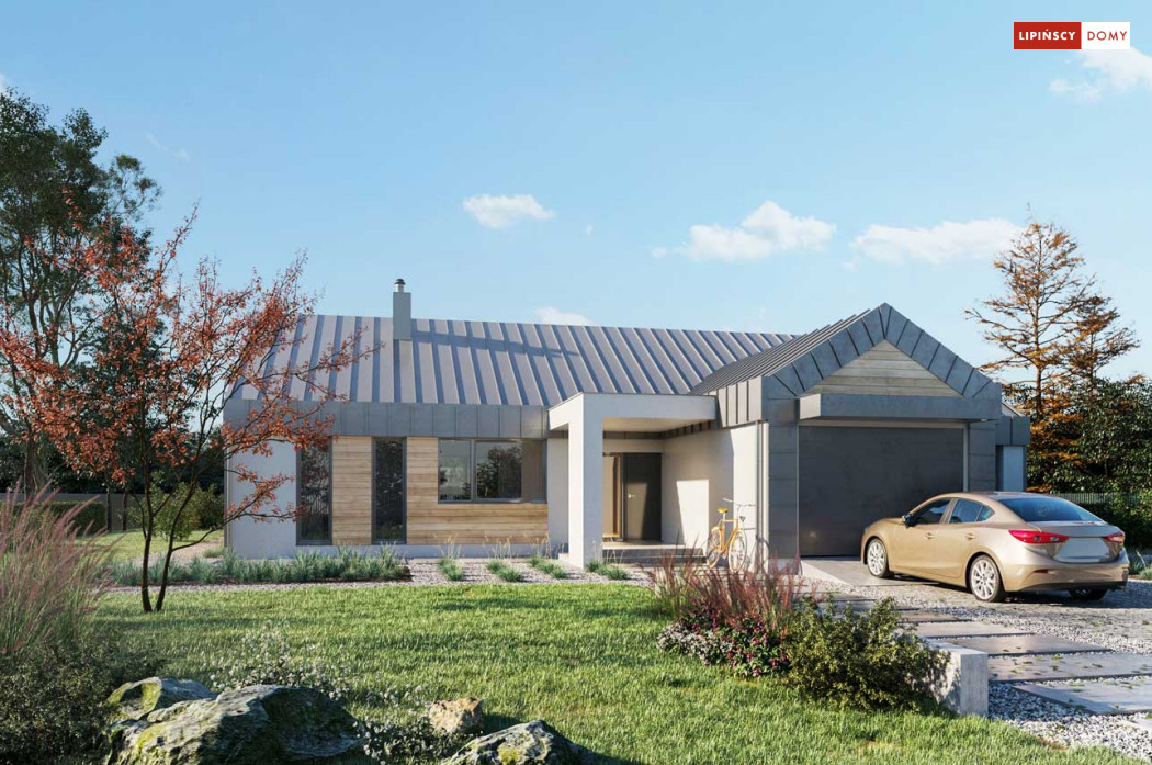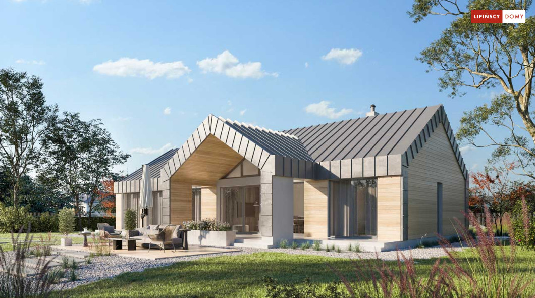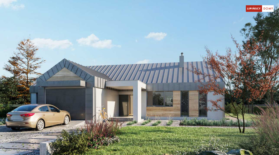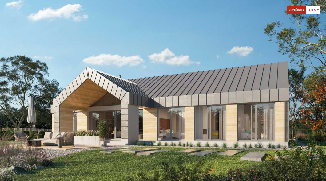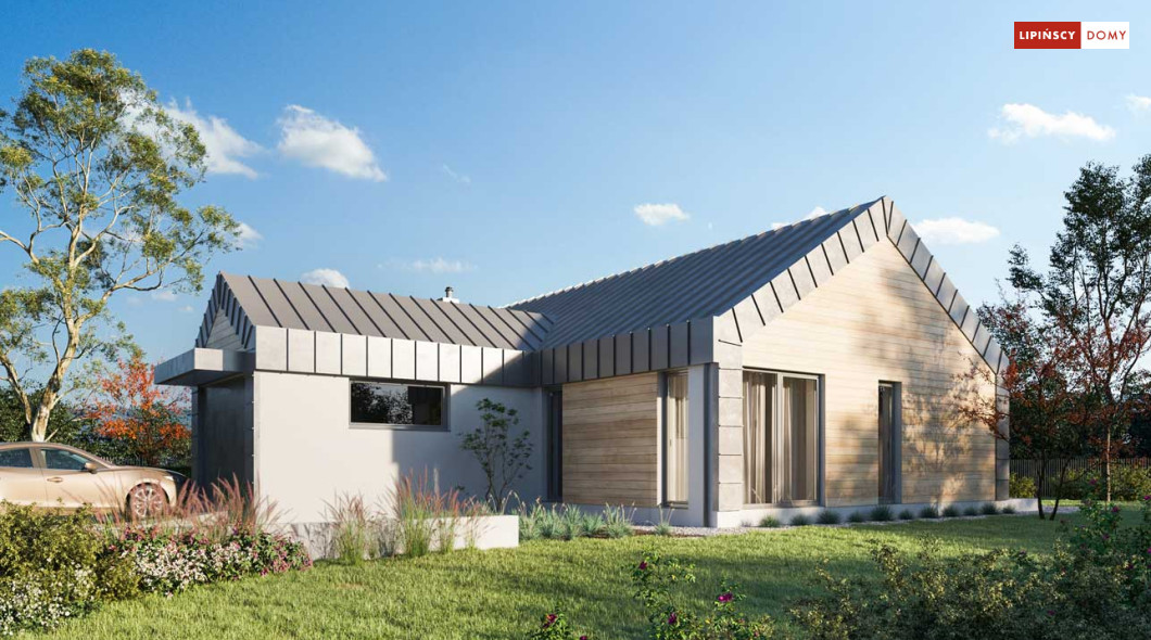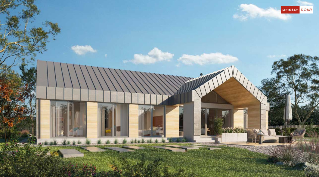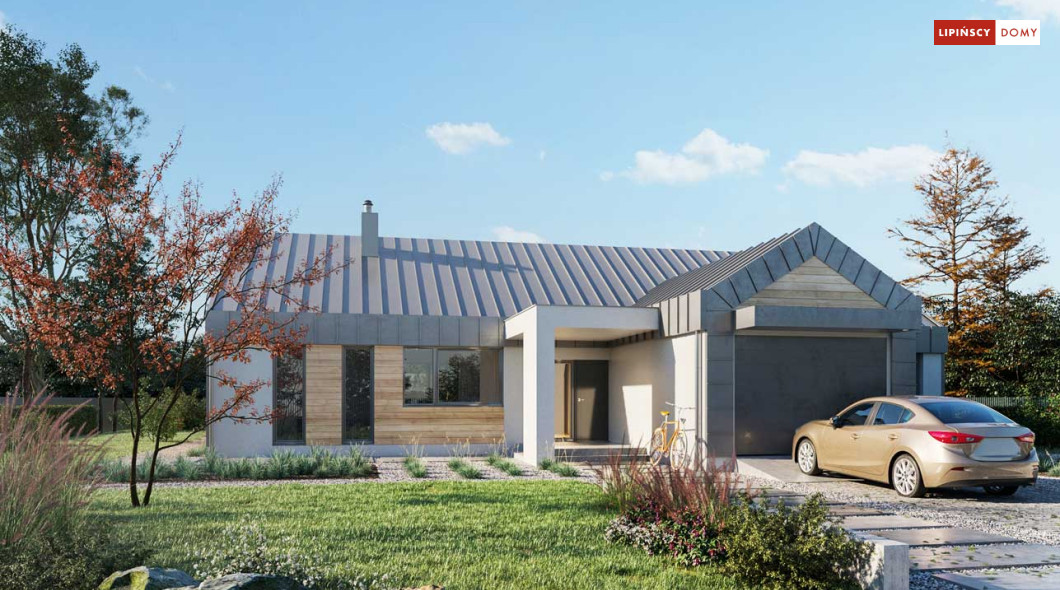 Nowoczesny i efektowny dom parterowy o eleganckiej bryle dla większej rodziny. Czas we wspólnym gronie pozwala spędzać obszerna część dzienna z salonem i wyodrębnionym miejscem na jadalnię, których dopełnieniem jest kuchnia z pojemną spiżarnią. Część nocna to cztery wygodne sypialnie i dwie łazienki. Dodatkowym atutem domu jest oddzielna duża sypialnia z własną łazienką, zlokalizowana obok pokoju dziennego. Przeznaczona na sypialnię rodziców, może również służyć jako bardzo wygodny i niekrępujący pokój gościnny. Do domu przynależy - dostępne z przestronnego wiatrołapu -pomieszczenie gospodarcze, które prowadzi do jednostanowiskowego garażu. W projekcie przewidziano ogrzewanie kotłem na gaz. Możliwa jest zmiana ogrzewania na pompę ciepła.