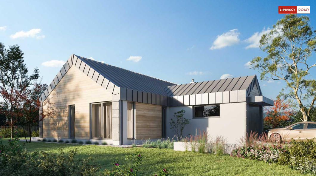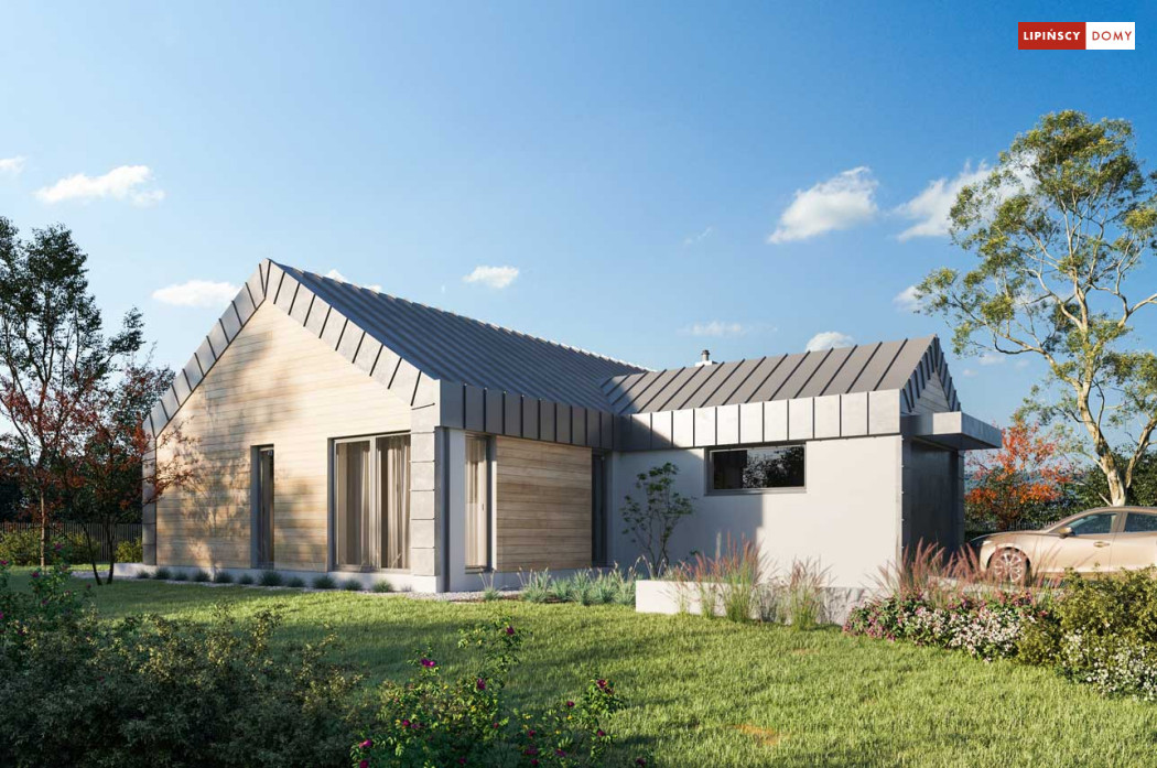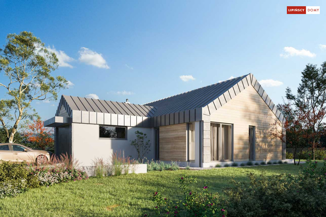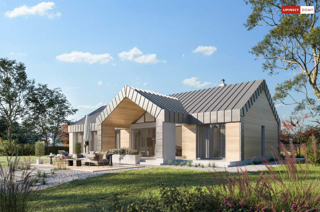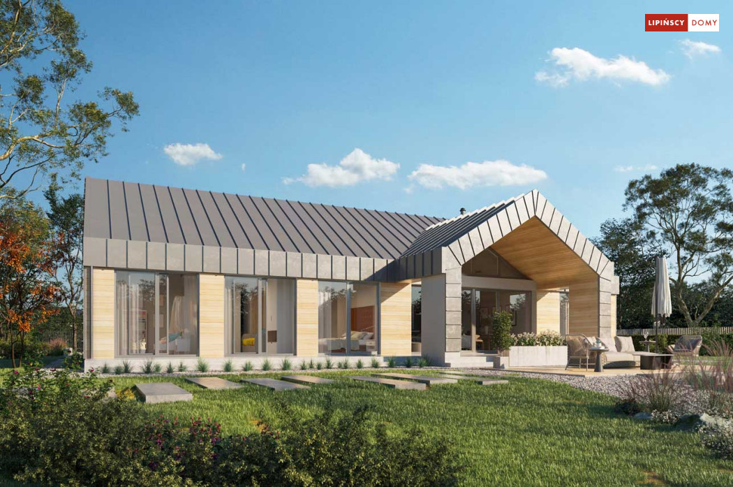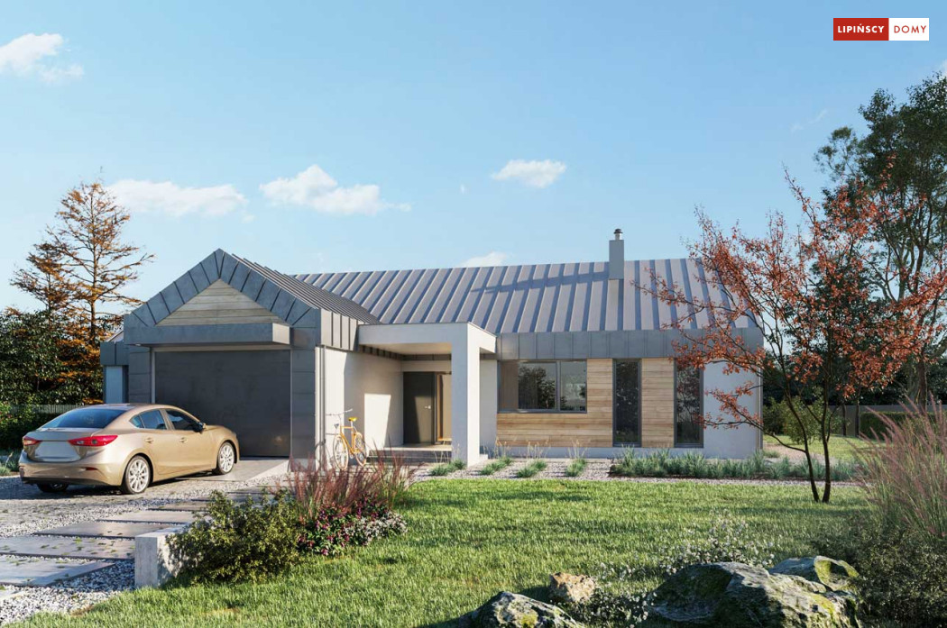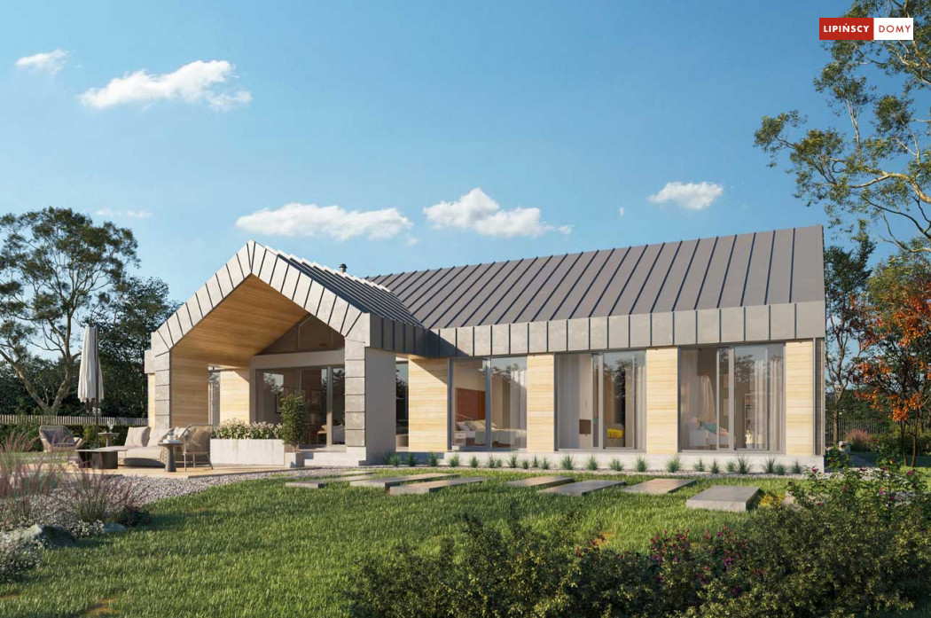 Nowoczesny i efektowny dom parterowy o eleganckiej bryle dla większej rodziny. Czas we wspólnym gronie pozwala spędzać obszerna część dzienna z salonem i wyodrębnionym miejscem na jadalnię, których dopełnieniem jest kuchnia z pojemną spiżarnią. Część nocna to cztery wygodne sypialnie i dwie łazienki. Dodatkowym atutem domu jest oddzielna duża sypialnia z własną łazienką, zlokalizowana obok pokoju dziennego. Przeznaczona na sypialnię rodziców, może również służyć jako bardzo wygodny i niekrępujący pokój gościnny. Do domu przynależy - dostępne z przestronnego wiatrołapu -pomieszczenie gospodarcze, które prowadzi do jednostanowiskowego garażu. W projekcie przewidziano ogrzewanie kotłem na gaz. Możliwa jest zmiana ogrzewania na pompę ciepła.