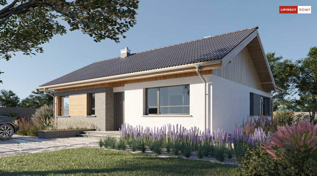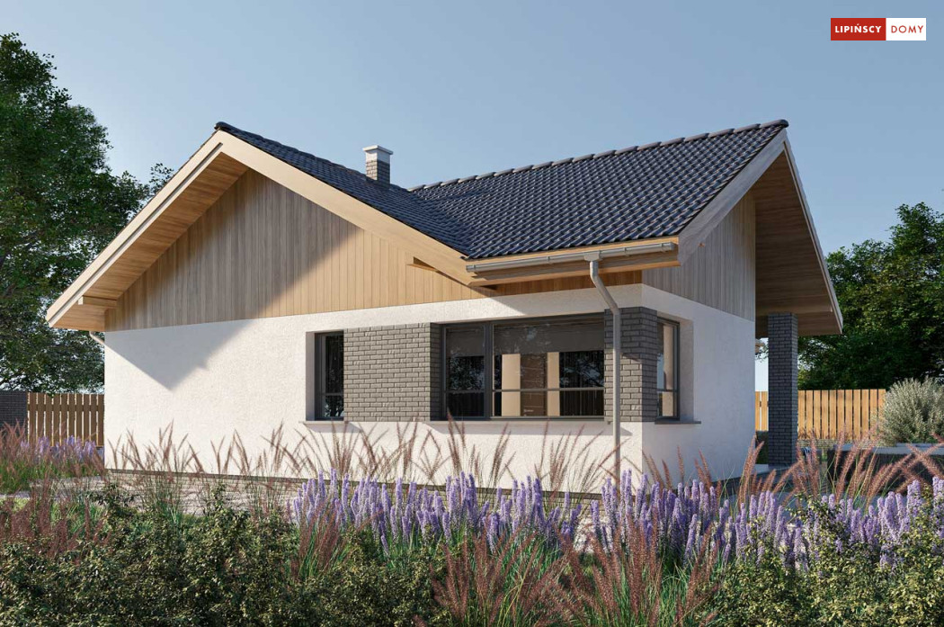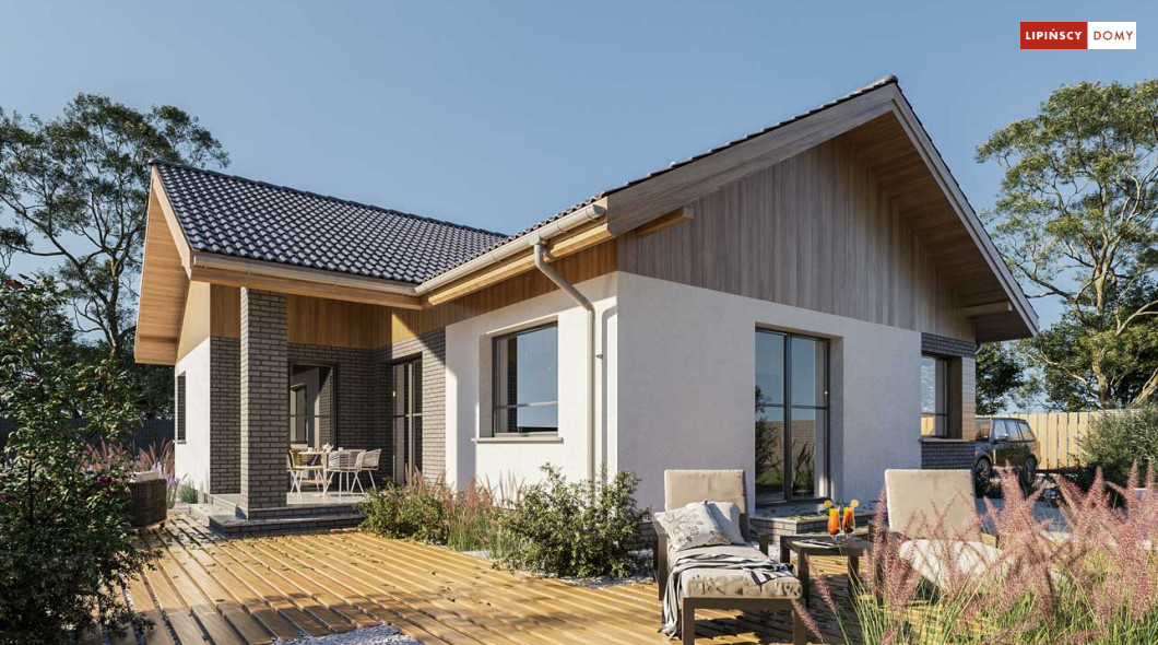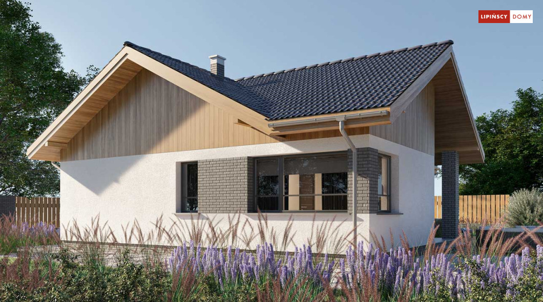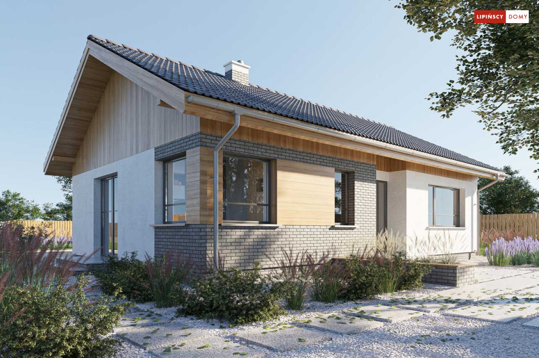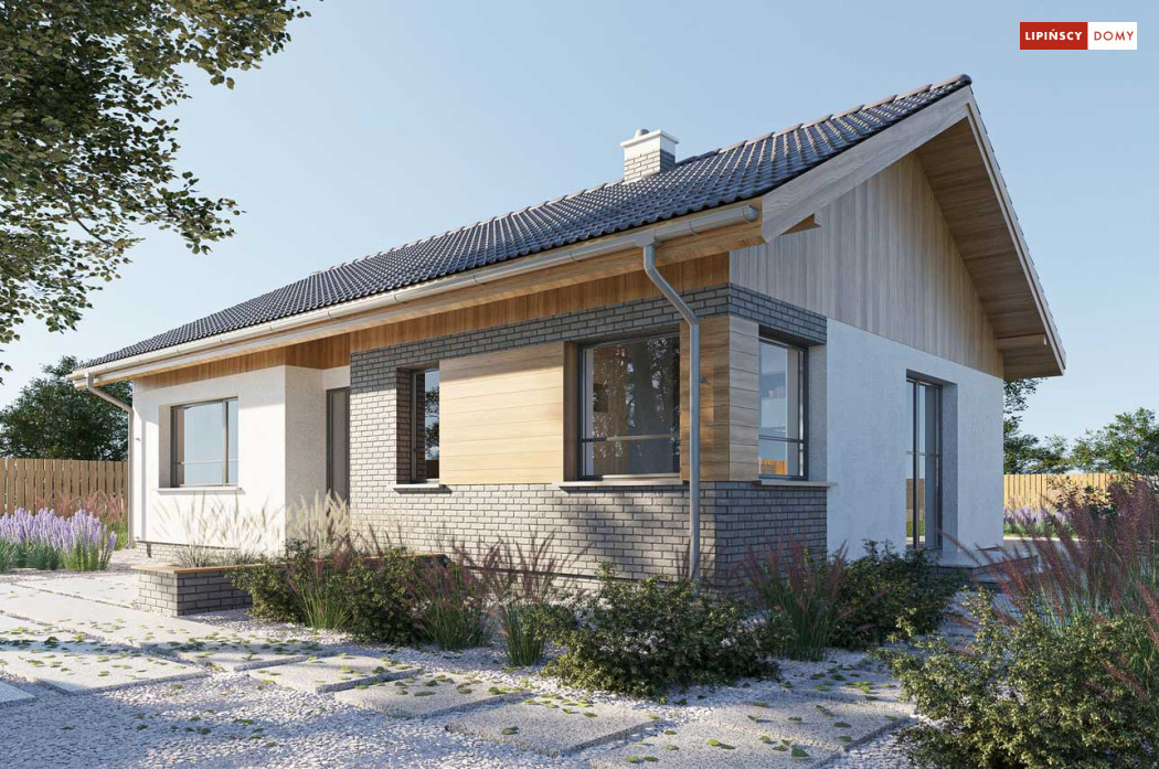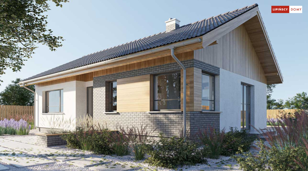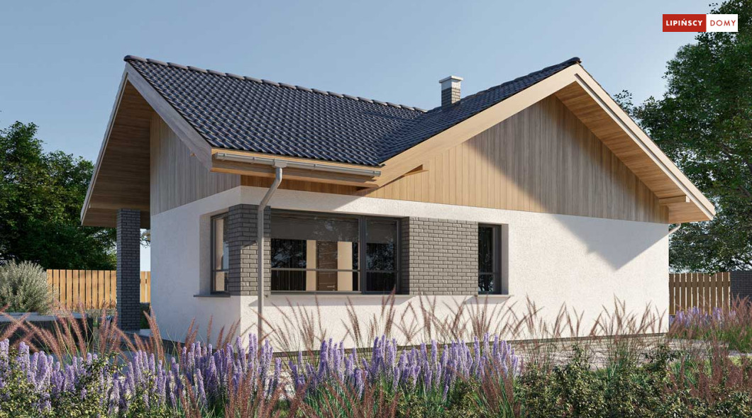 Niewielki i zarazem przestronny dom parterowy dla rodziny 2+1, zapewniający komfort użytkowania i przytulne wnętrze obudowane piękną bryła. W obszernym, doskonale oświetlonym salonie jest miejsce na wygodna sofę i duży stół jadalni. Atrakcyjny jest też funkcjonalny zadaszony taras powiększający przestrzeń użytkową domu o letni pokój. Kuchnia ma bezpośrednie połączenie z pomieszczeniem gospodarczym i wiatrołapem. Ułatwia to przenoszenie zakupów. Sypialnia rodziców jest od strony ogrodu, posiada oryginalne okno narożnikowe i wyjście na zadaszony taras. Sypialnia ta oddzielona jest od sypialni dziecka przestronną łazienką i dodatkowym pomieszczeniem toalety. W tym domu zastosowano ogrzewanie pompą ciepła i wentylacje grawitacyjną. Jeśli nie jesteście zwolennikami kominka to można z niego oczywiście zrezygnować na etapie adaptacji projektu.